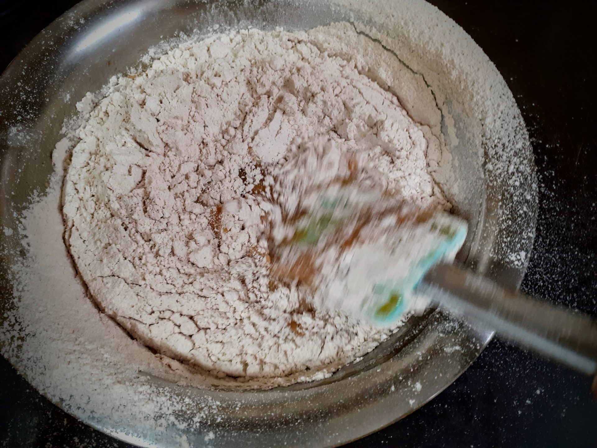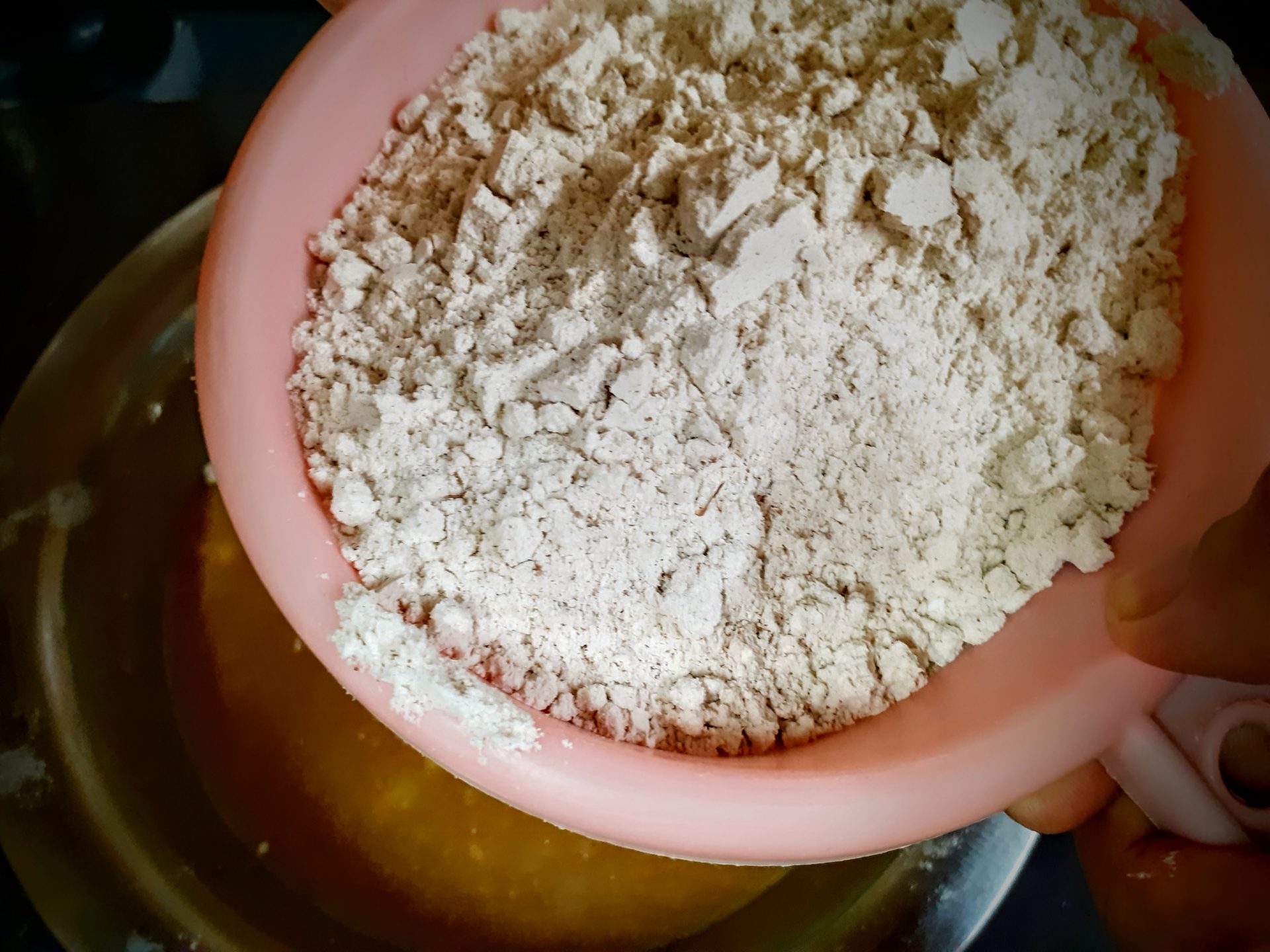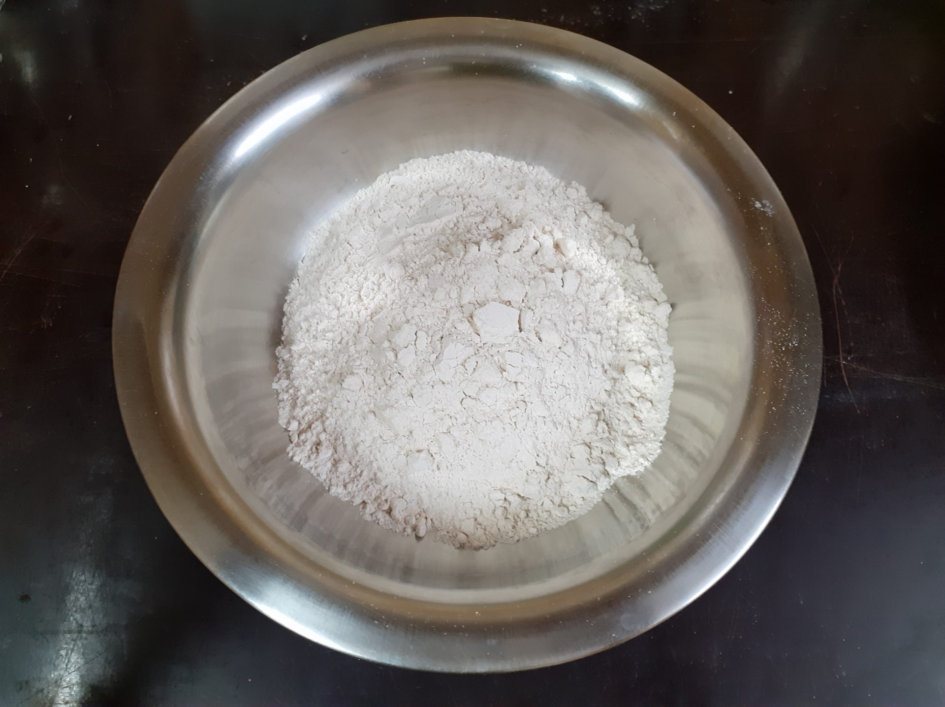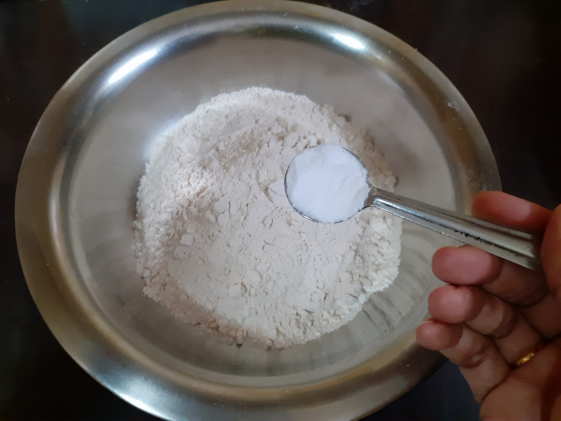 - In a bowl take the whole wheat flour. Add Baking soda,salt, cinnamon powder, and mix well. Transfer to another bowl. Keep aside.