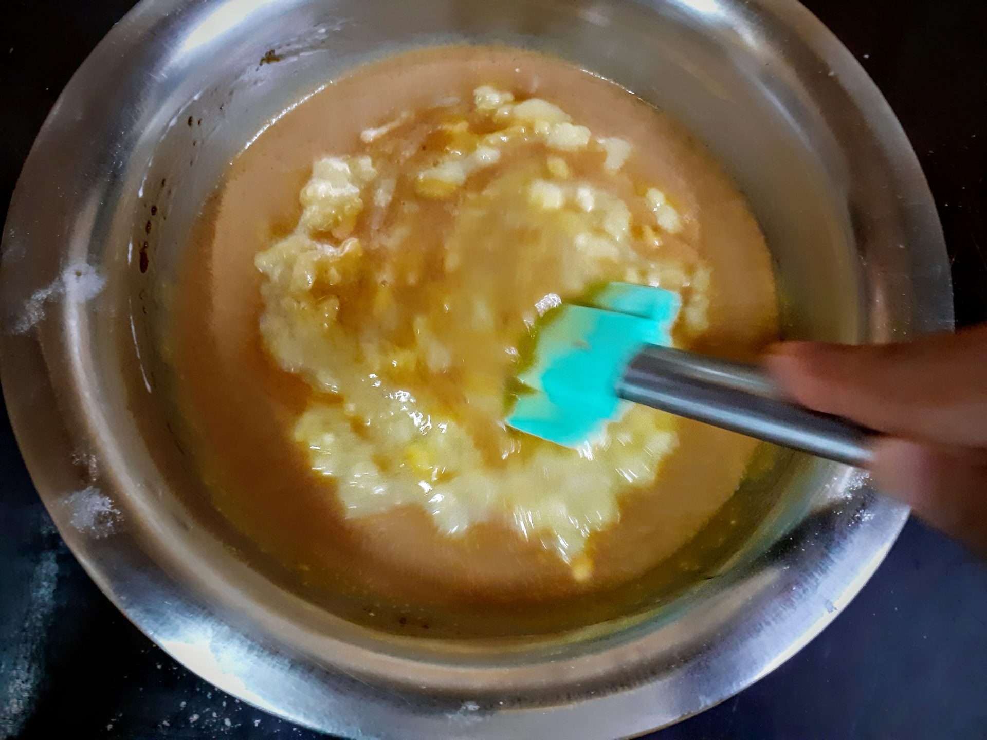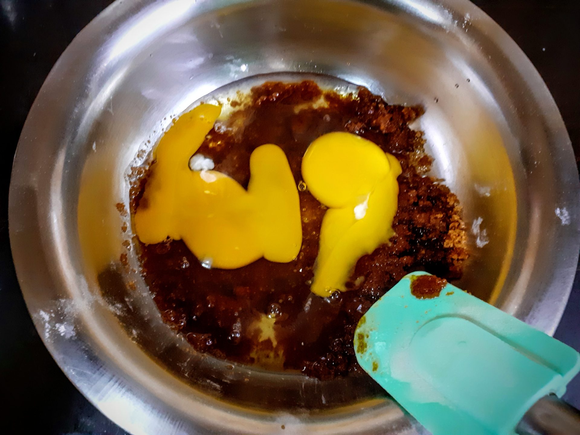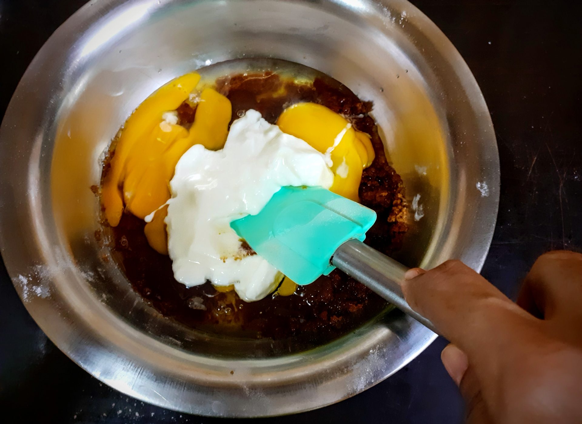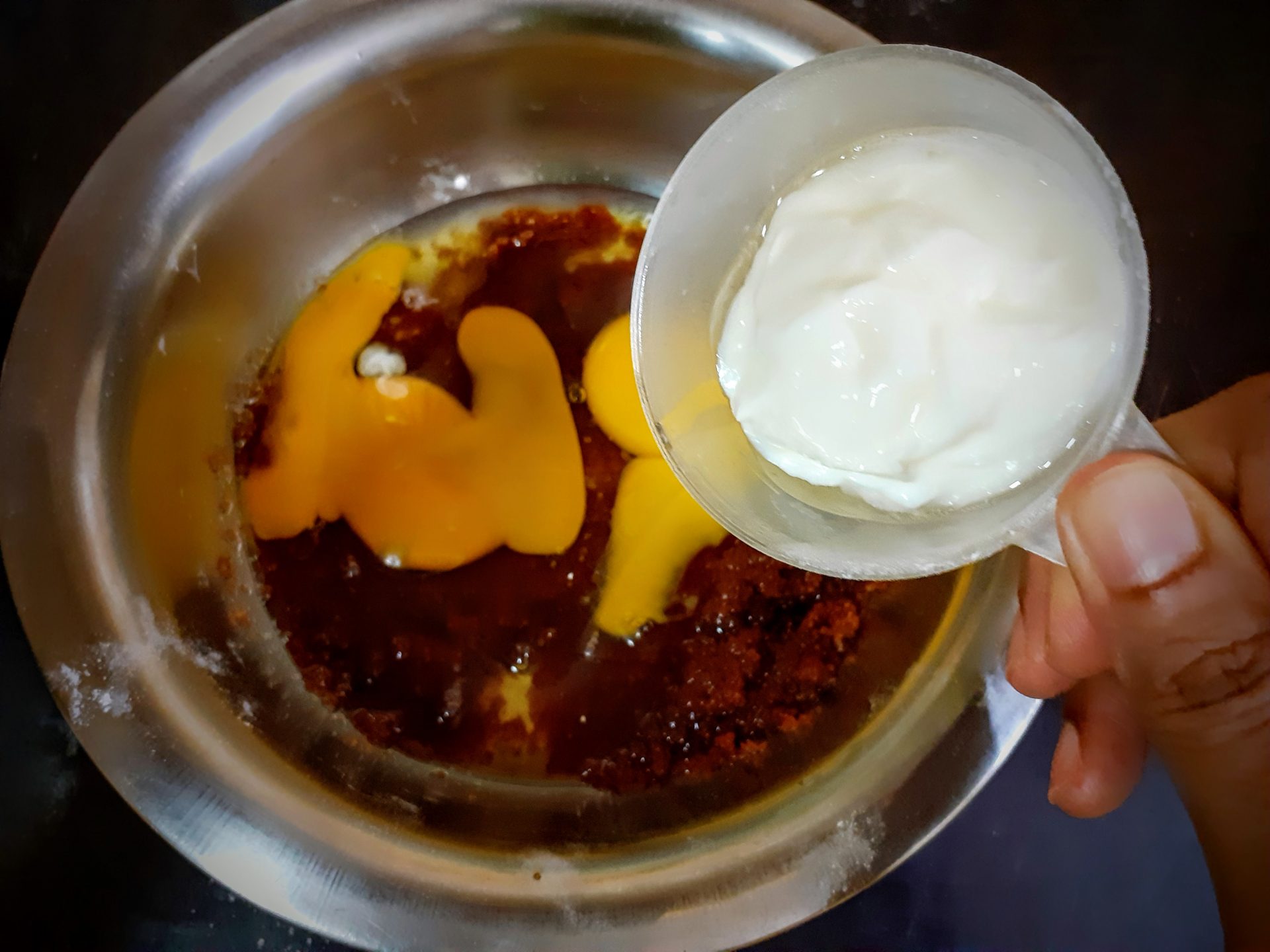 - Now in a bowl take the brown sugar, add coconut oil(or any neutral oil), eggs, and curd and whisk them all well.