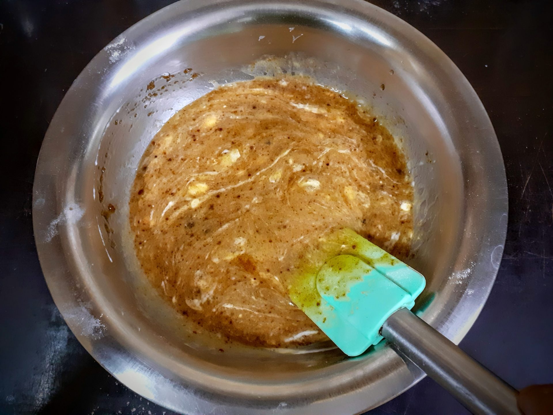 - In a bowl take the whole wheat flour. Add Baking soda,salt, cinnamon powder, and mix well. Transfer to another bowl. Keep aside. Now in a bowl take the brown sugar, add coconut oil(or any neutral oil), eggs, and curd and whisk them all well. Now mash the overripe Bananas in a bowl and add them to the creamed mixture. Add vanilla essence, and sift the flour directly into the creamed mixture and fold well. Now add Walnuts, chocolate chips and fold gently. Grease a loaf tin or any 9″X 5″ mold, and pour the cake batter into it. Bake at 200 C for 40 mins. Cover the tin loaf with Aluminium foil lightly. The delicious Banana bread is ready.