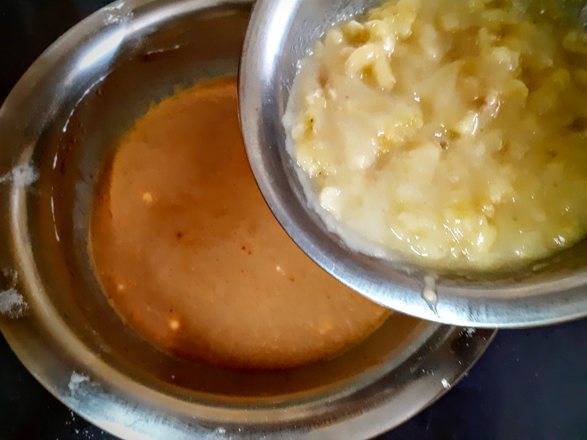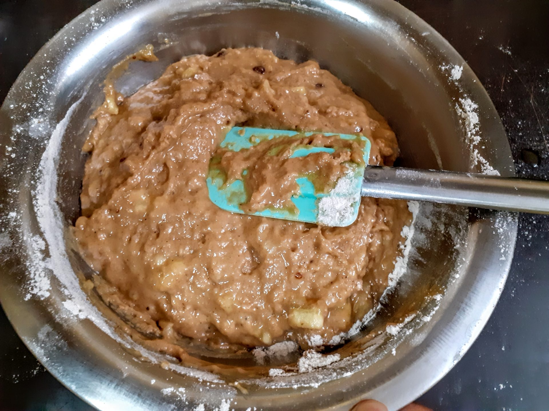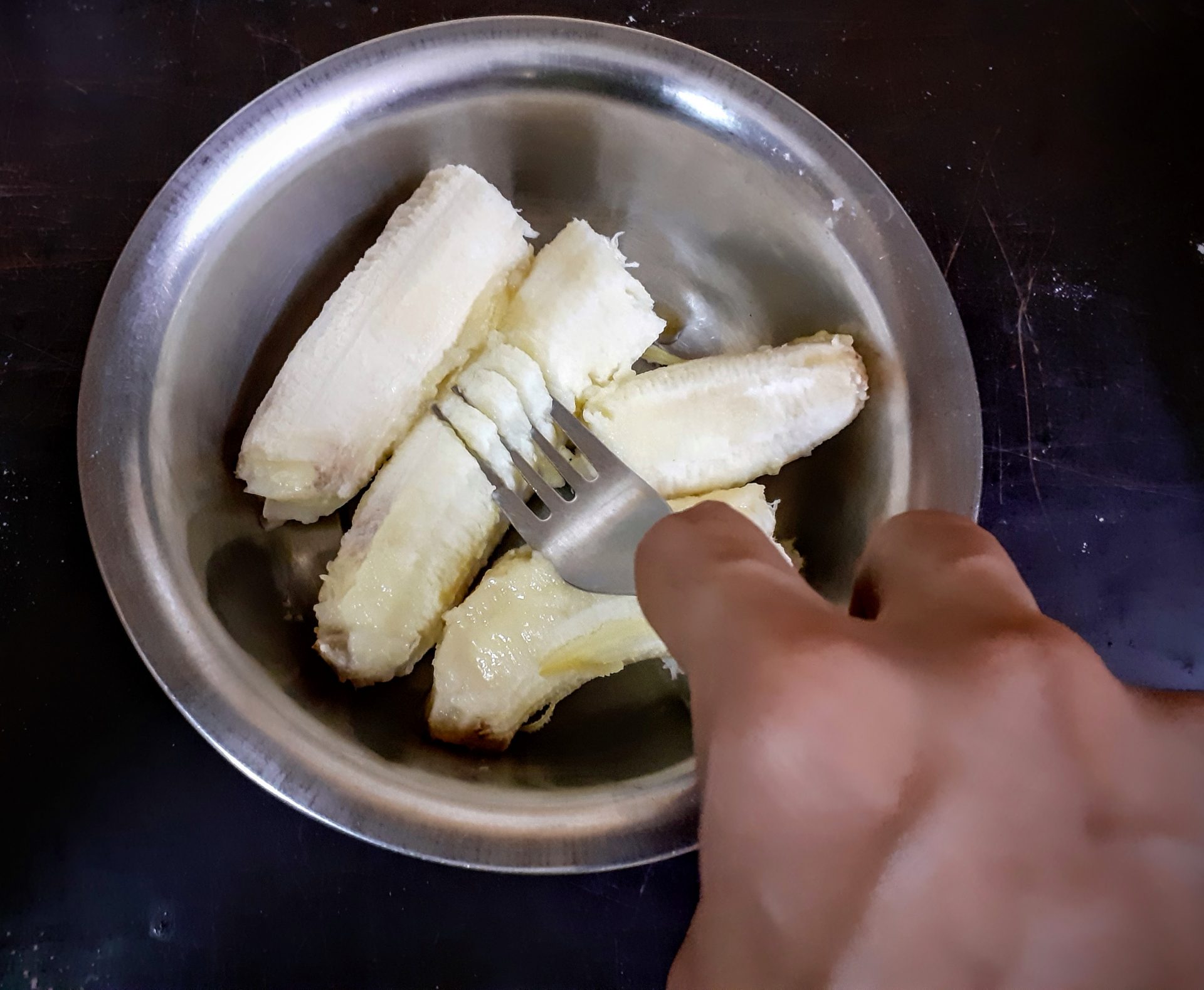 - Now mash the overripe Bananas in a bowl and add them to the creamed mixture. Add vanilla essence, and sift the flour directly into the creamed mixture and fold well.