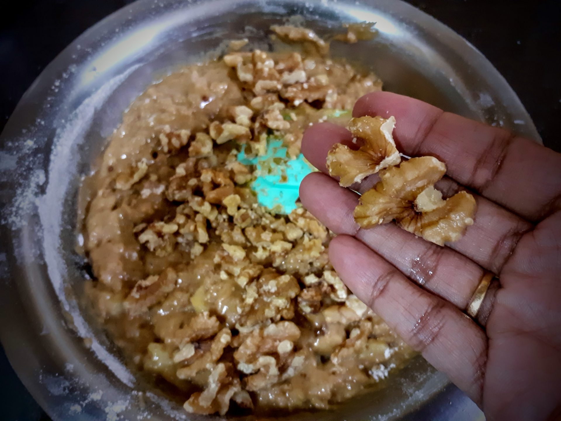 My recipe is very basic and you know my love for one bowl recipes. I have just added some choco chips for the chocoholics at home and some walnuts for me. Brown sugar, eggs, and coconut oil combine to make this bread super moist.