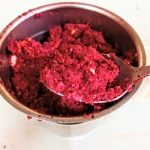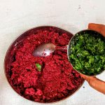- Now to a blender add the beetroot, the soaked chickpeas(after draining water), green chilli, garlic,cumin seeds, salt, and blitz. The blitzed mixture must be grainy, and not smooth like a puree. No water must be used while grinding.