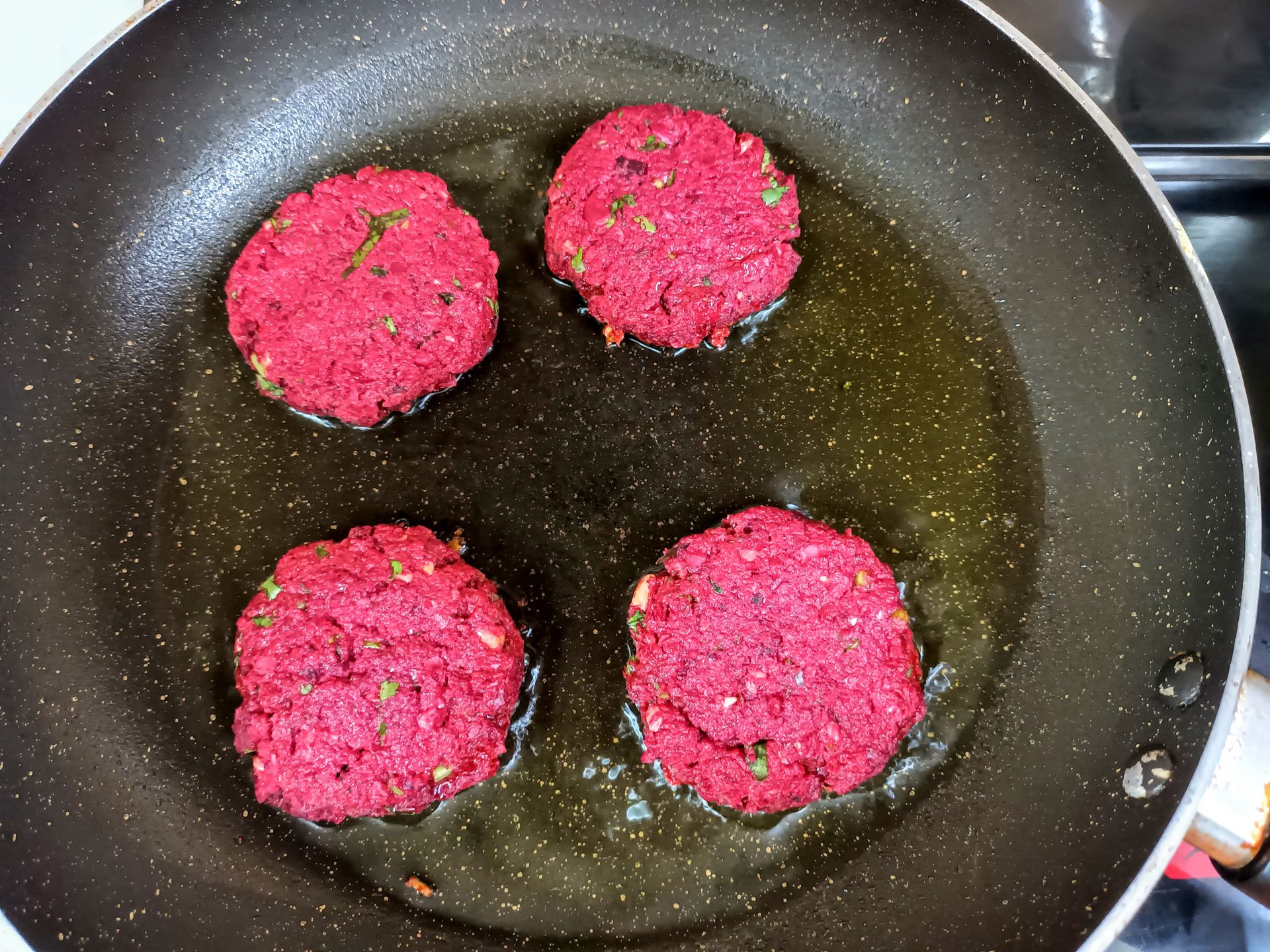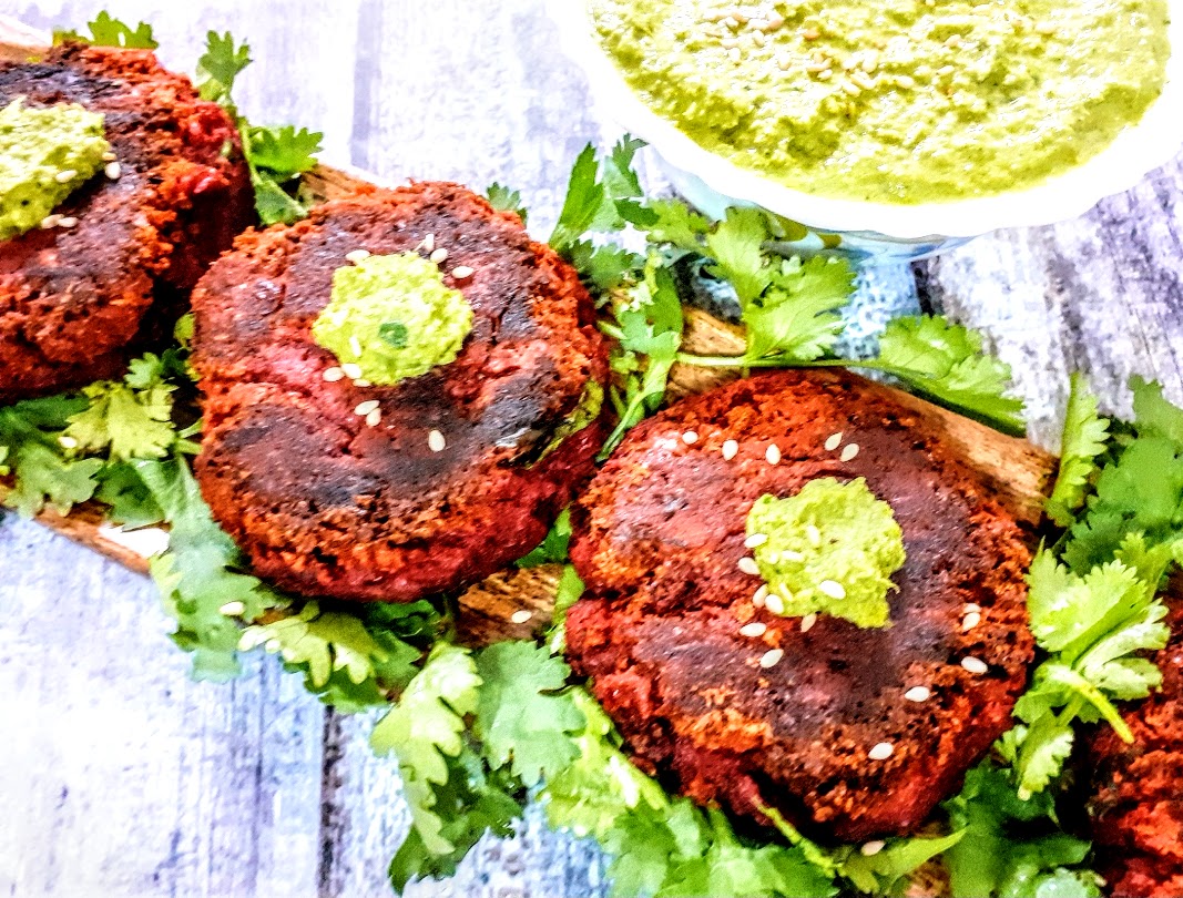 Dice the Beetroot and soak the chickpeas overnight or for 4 hours atleast, and drain the water. Now to a blender add the beetroot, the soaked chickpeas(after draining water), green chilli, garlic,cumin seeds, salt, and blitz. The blitzed mixture must be grainy, and not smooth like a puree. No water must be used while grinding. To the mixture,add the chickpea flour/Besan and mix well. To this add the finely chopped coriander leaves and mix. Now shape this mixture into Pattice and shallow fry, a few at a time in a pan. Oil temperature should be medium hot. Serve hot with Hummus, chutney, dip or salad. I served it with some Till/Sesame chutney.