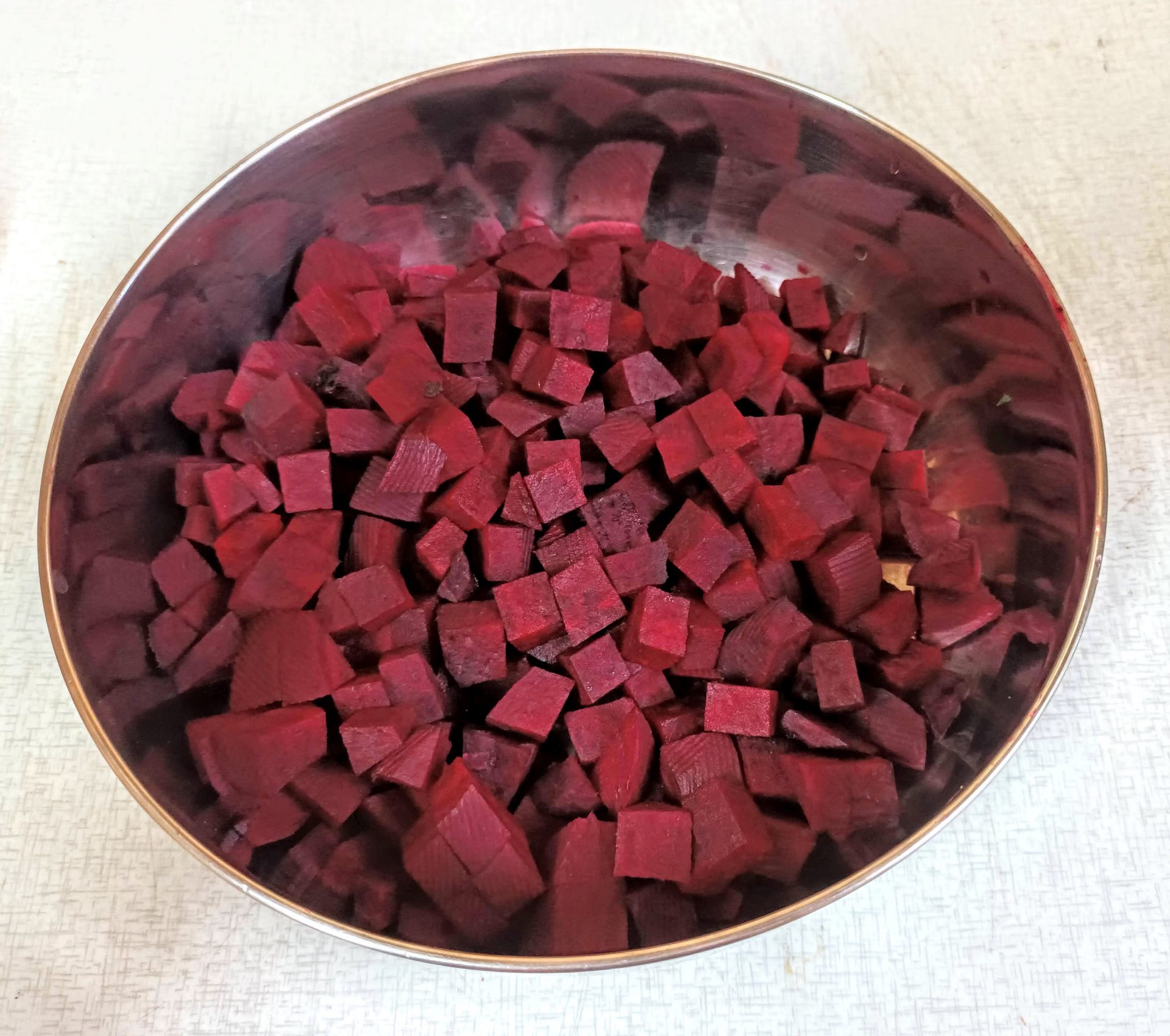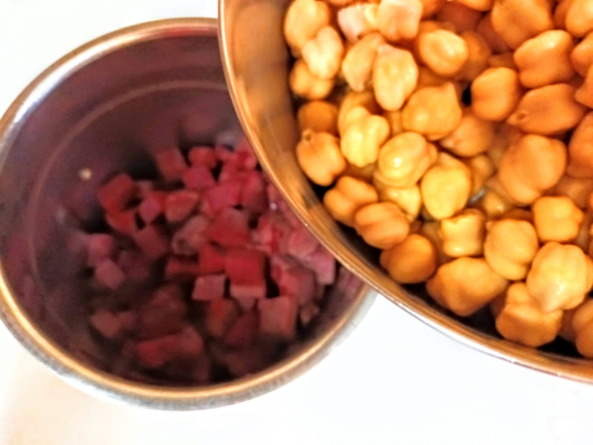 - Dice the Beetroot and soak the chickpeas overnight or for 4 hours atleast, and drain the water.