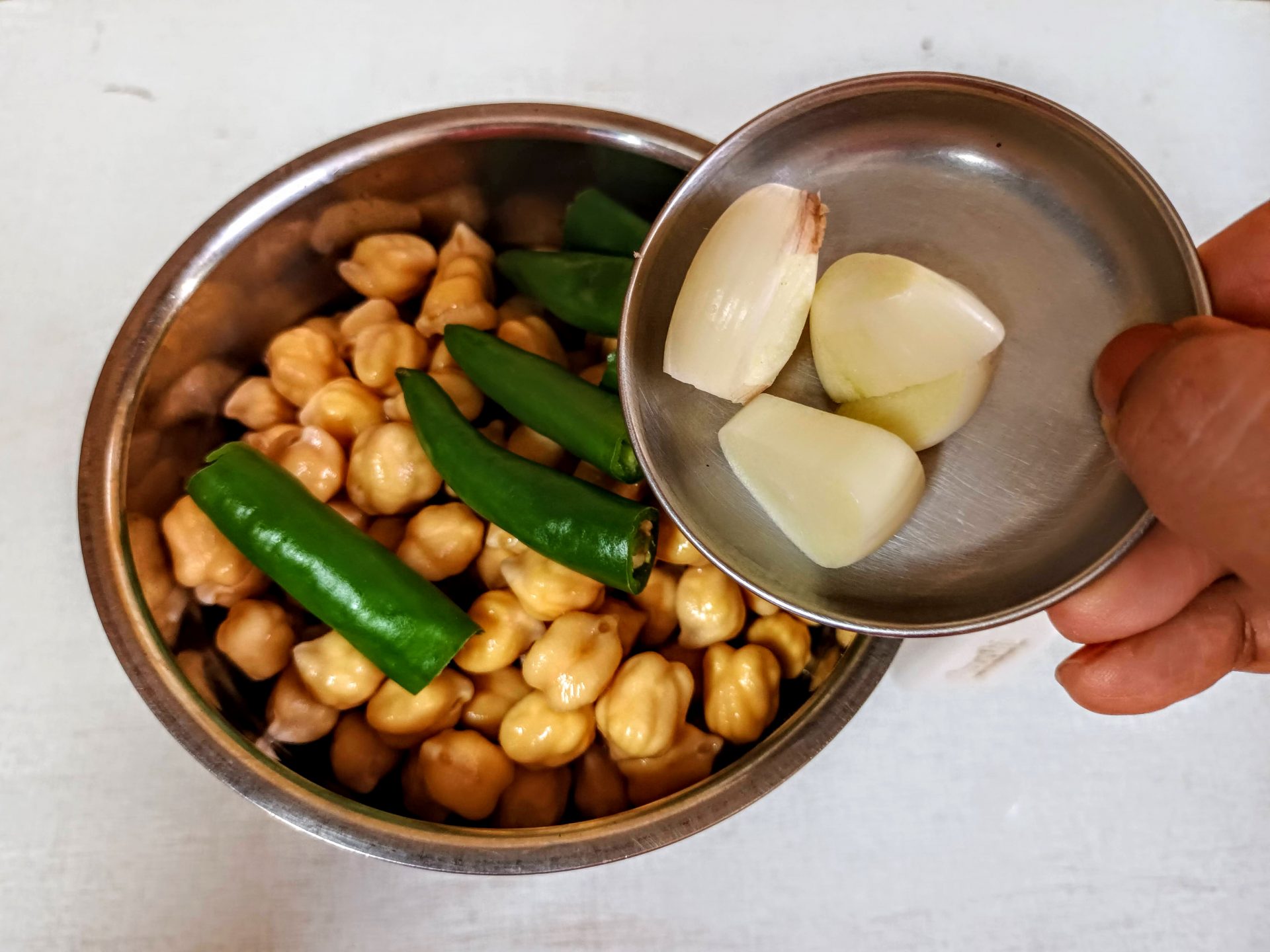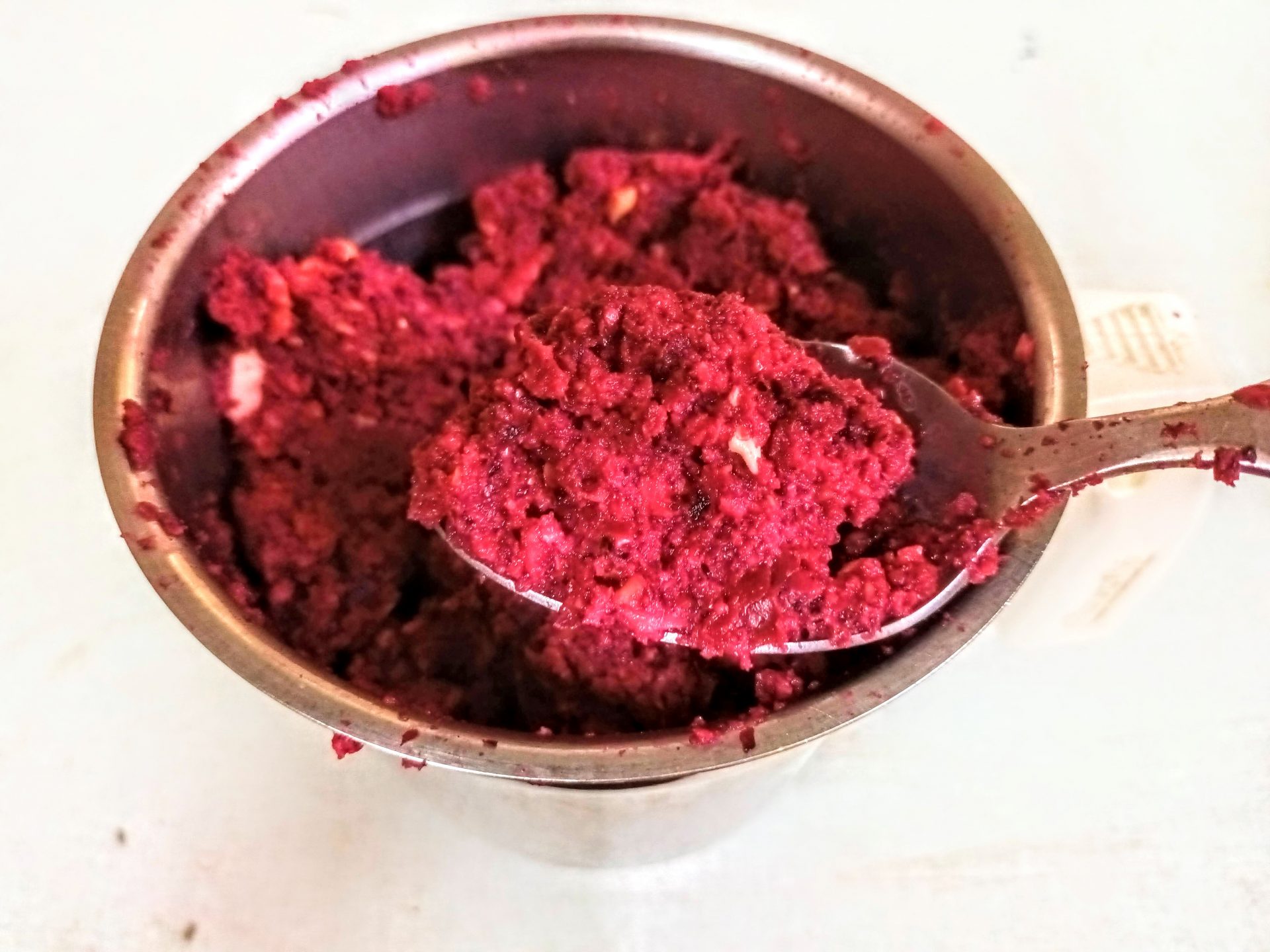 - Now to a blender add the beetroot, the soaked chickpeas(after draining water), green chilli, garlic,cumin seeds, salt, and blitz. The blitzed mixture must be grainy, and not smooth like a puree. No water must be used while grinding.