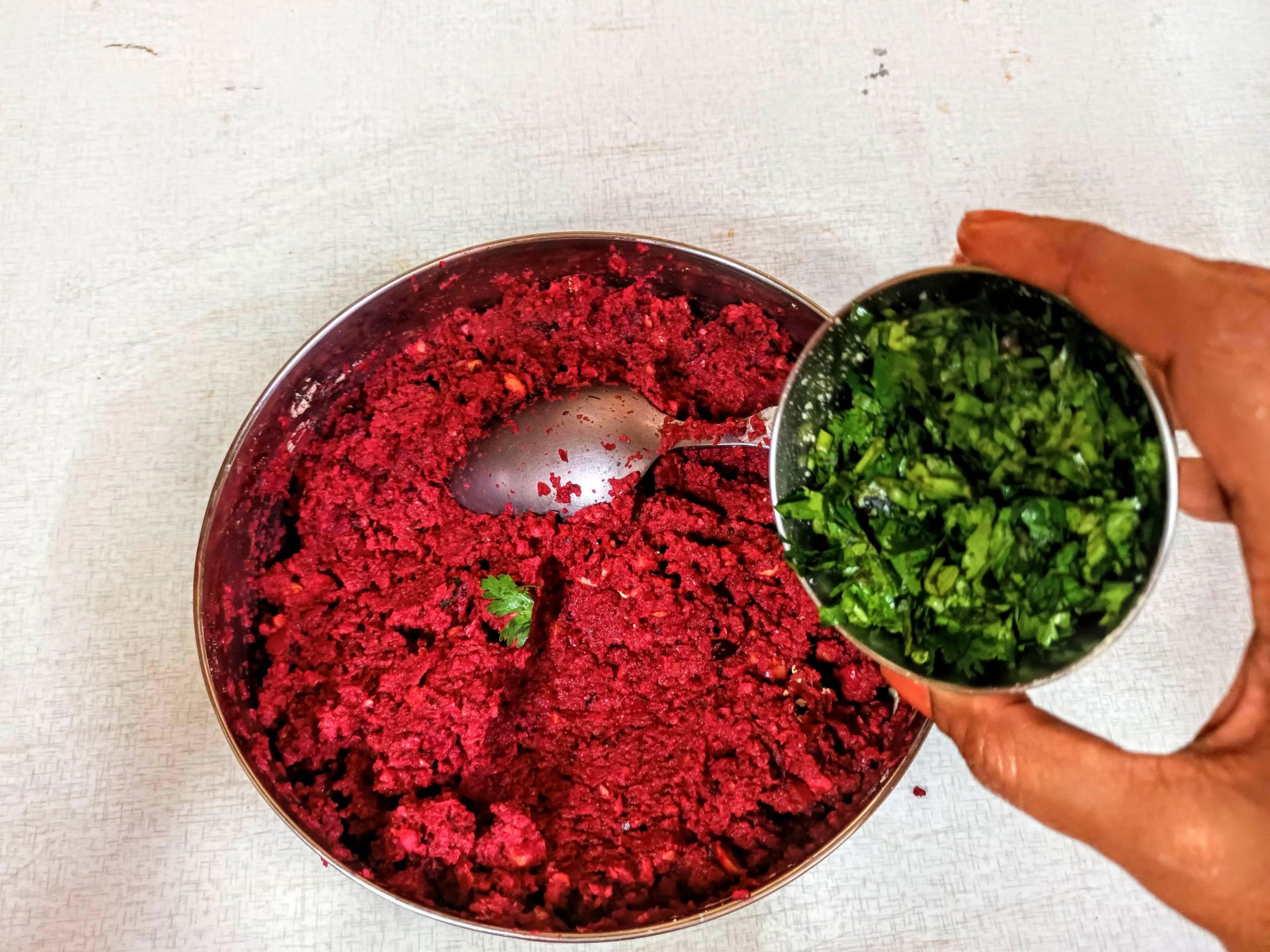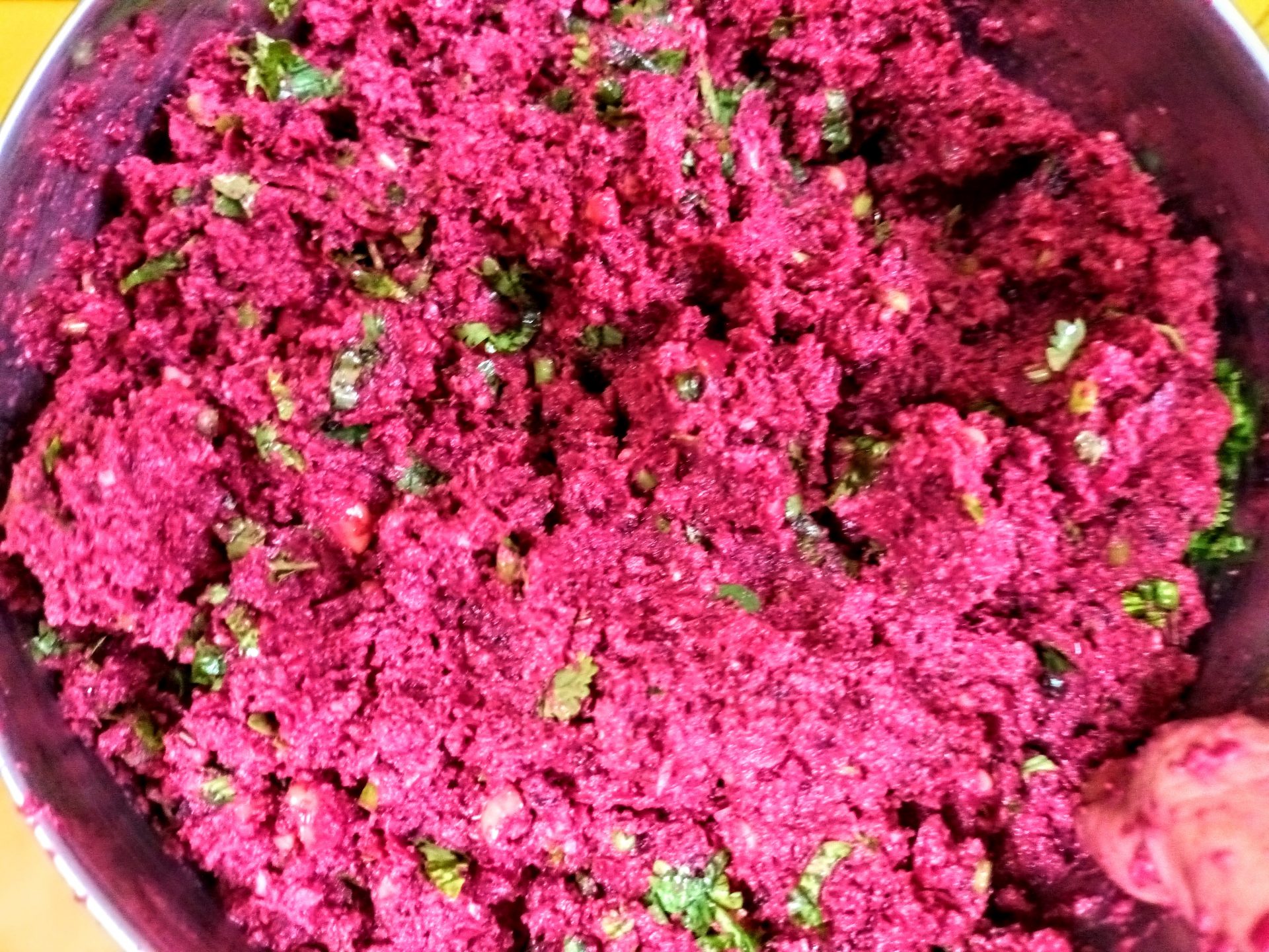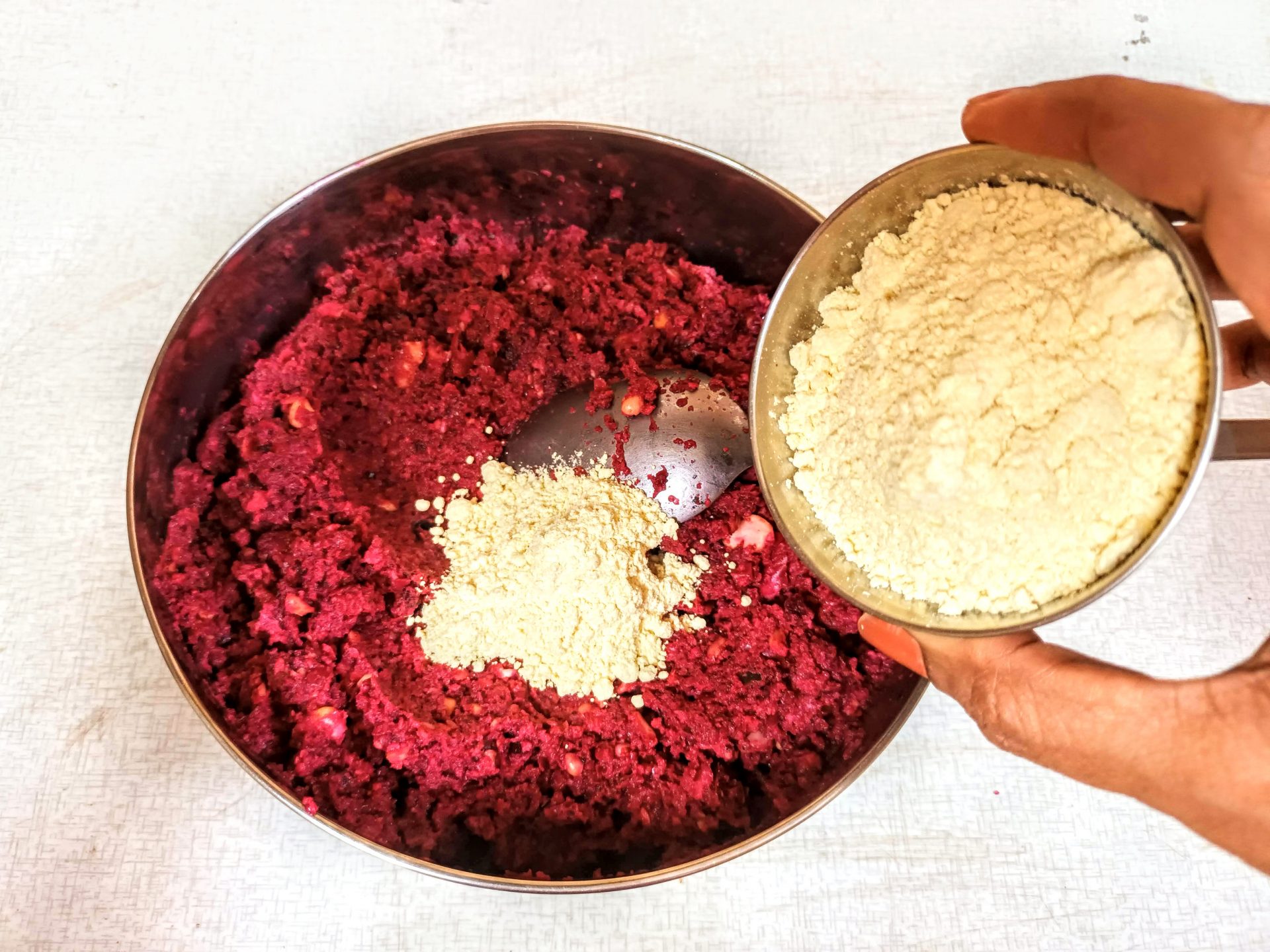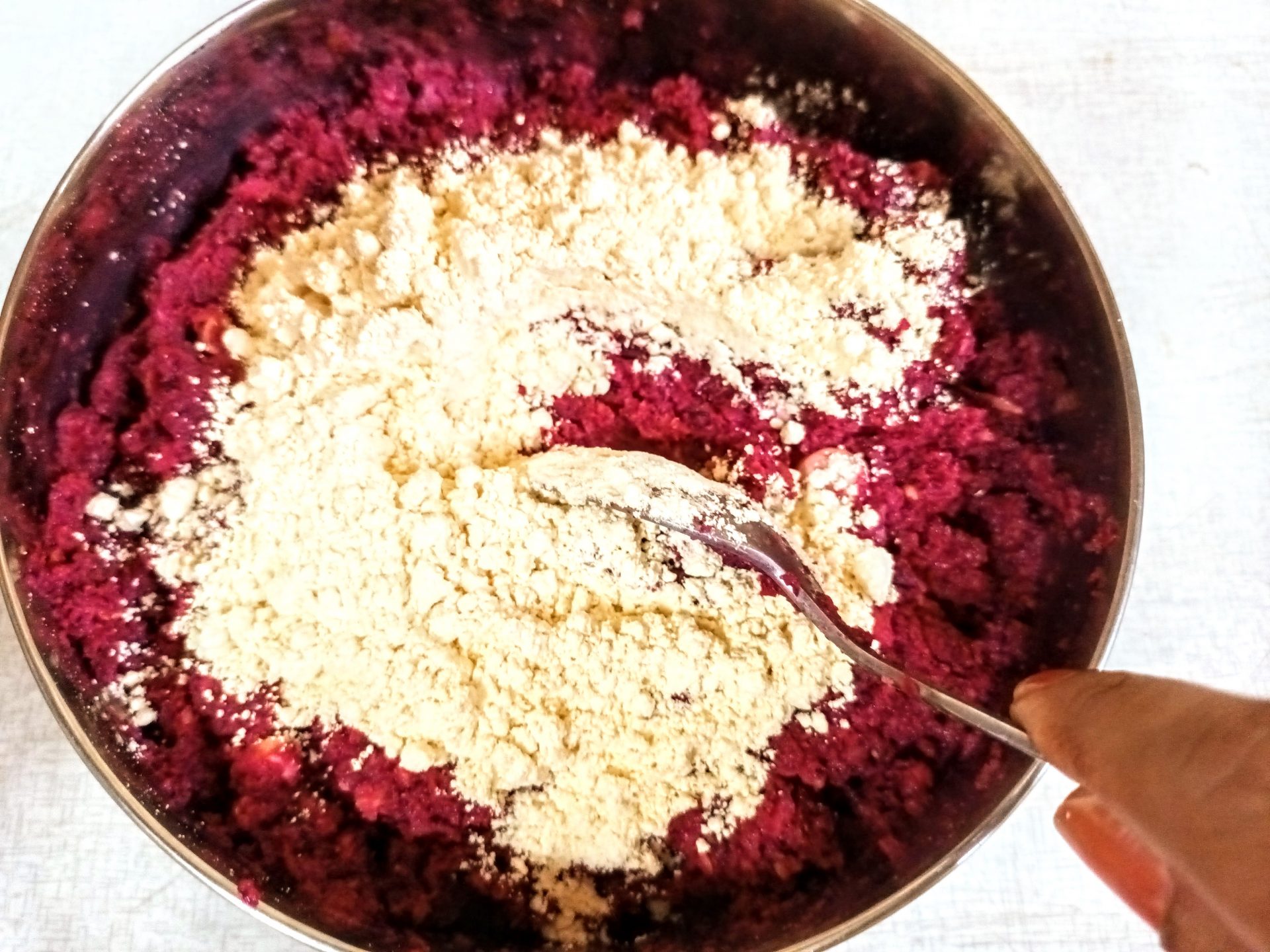 - Do not be tempted to add more beetroot than required, as then the mixture becomes runny, due tothe juiciness of the beetroot and becomes very messy to handle.