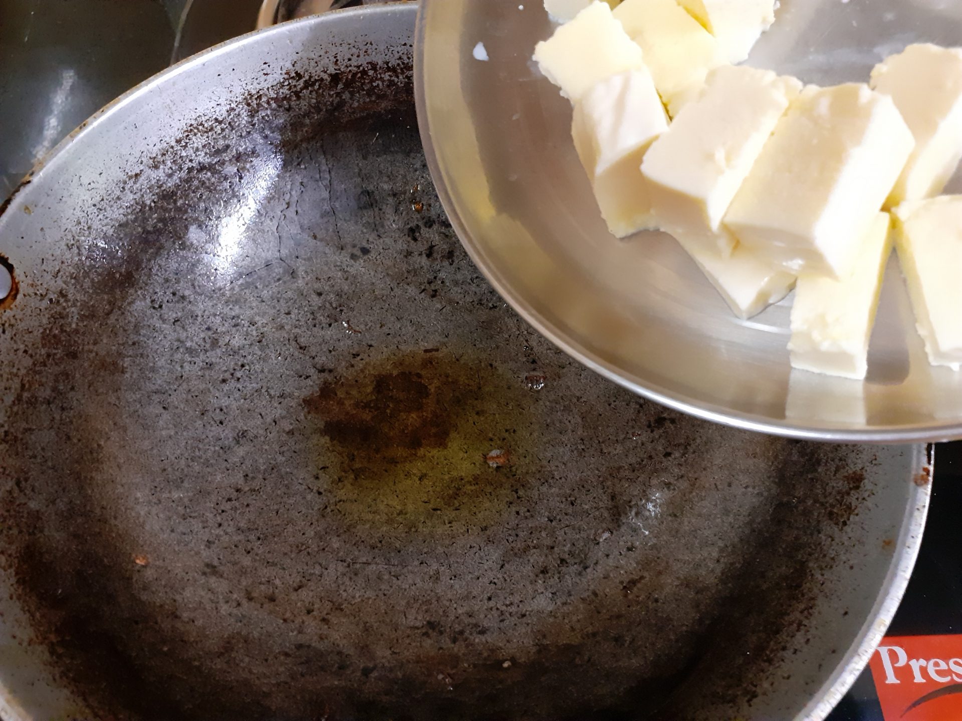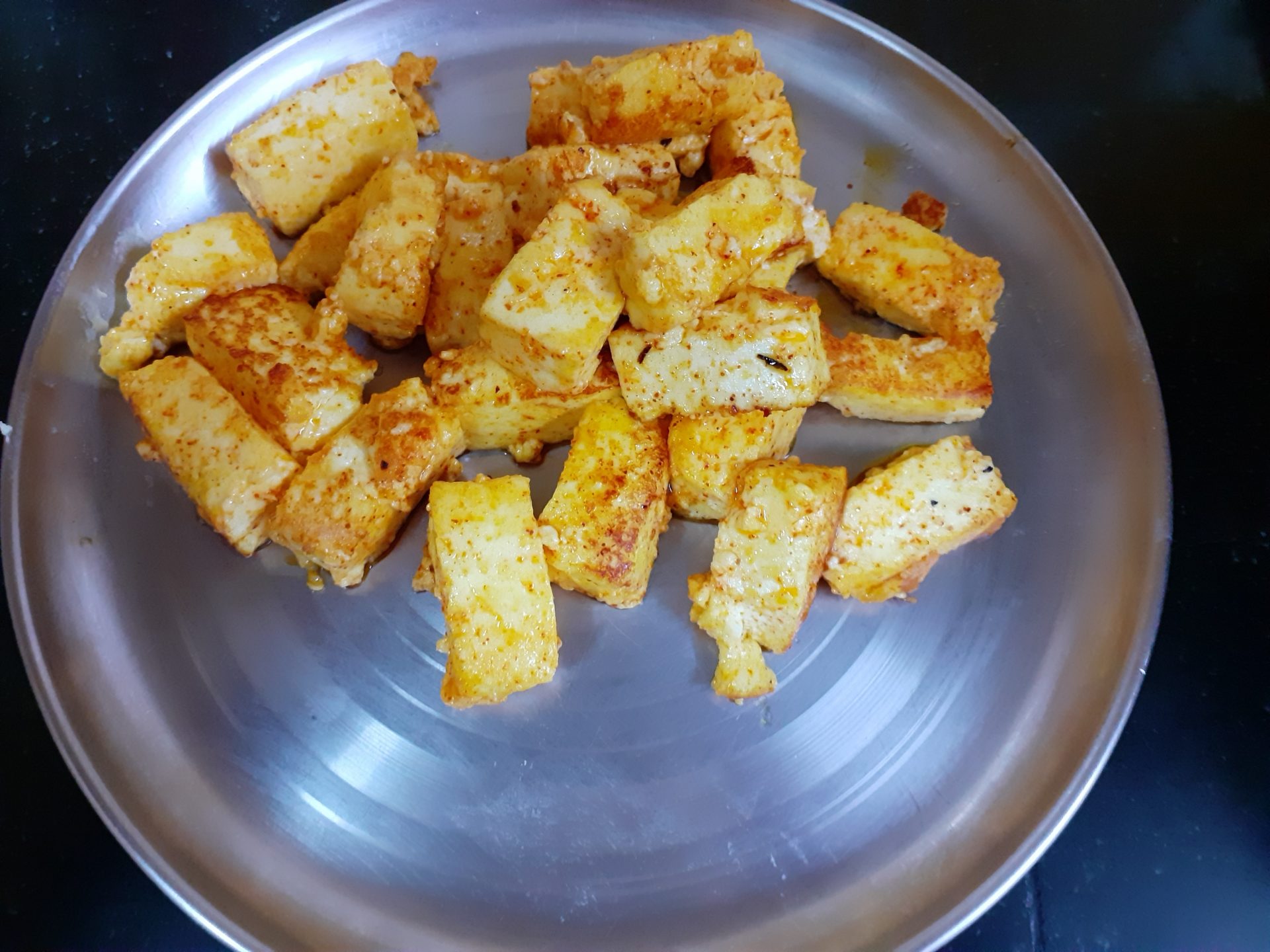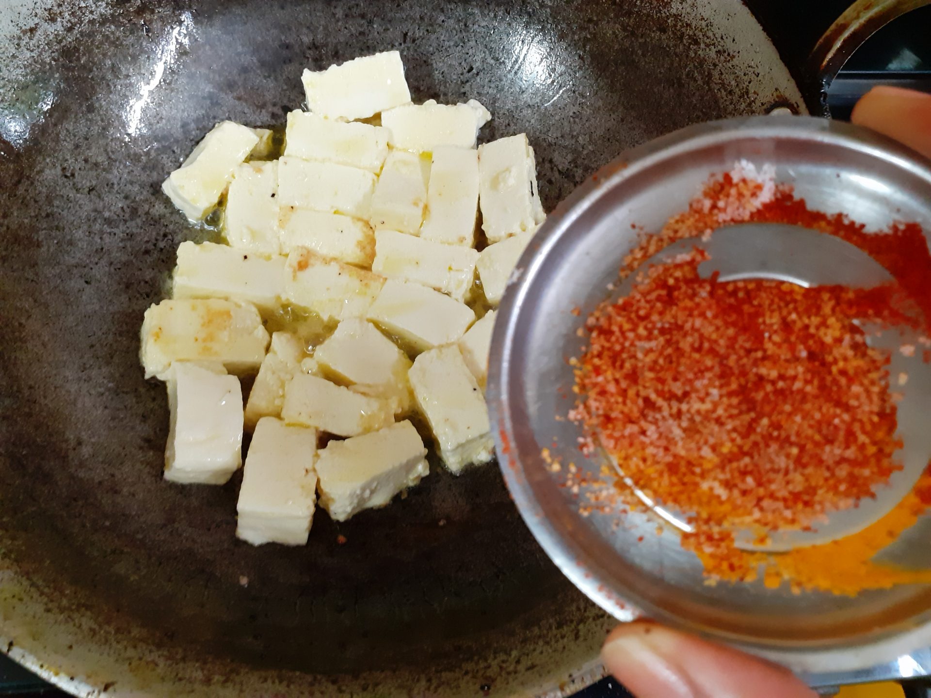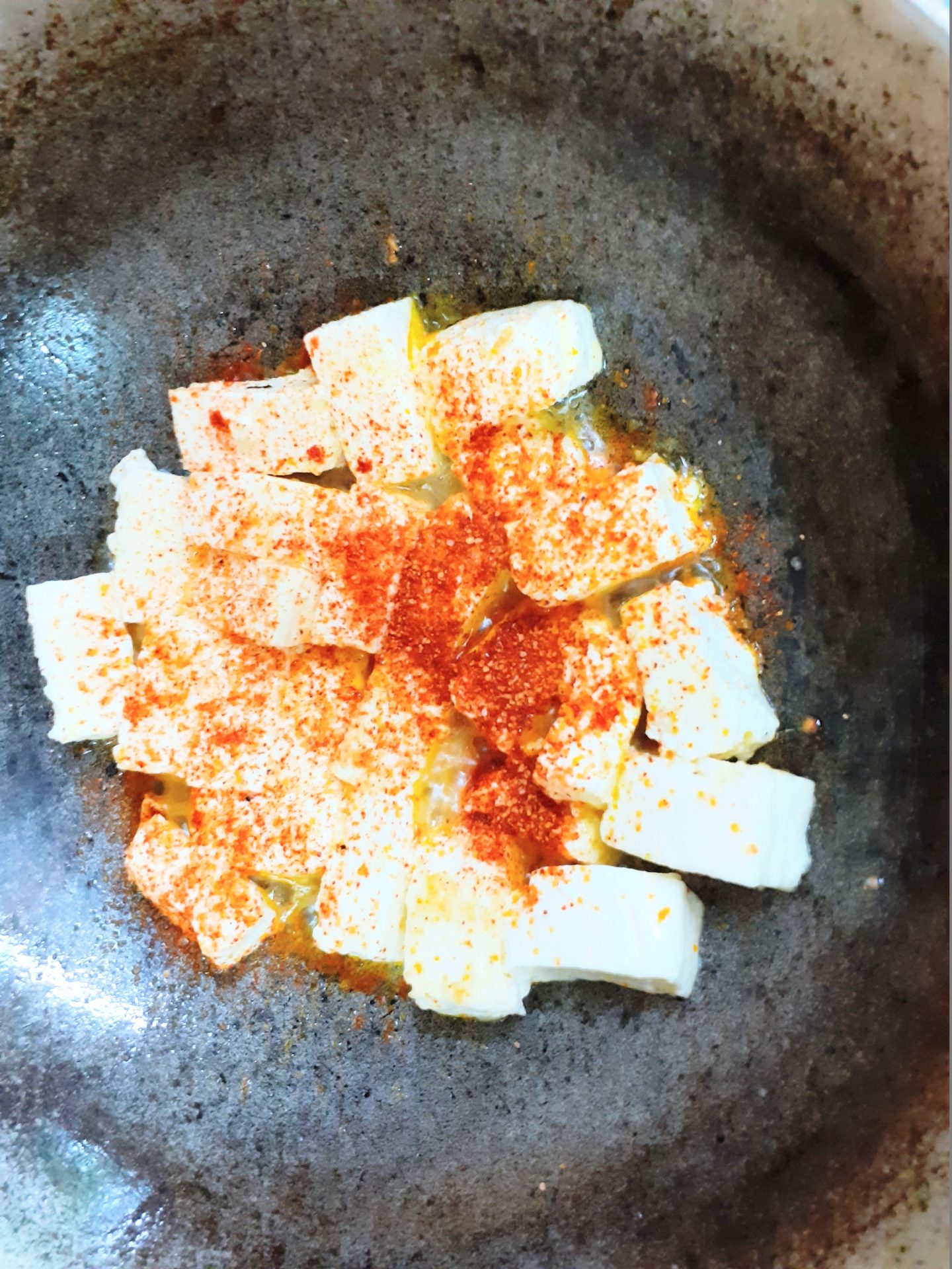 1. Mix 1 tsp red chilli powder, 1/4 tsp turmeric powder and a little salt in a plate and keep it aside. Now in a pan/kadai heat some oil. Add the paneer cubes,followed by the chilli- turmeric powder, and saute. Once the paneer is evenly coated with the masala , remove it onto a plate.