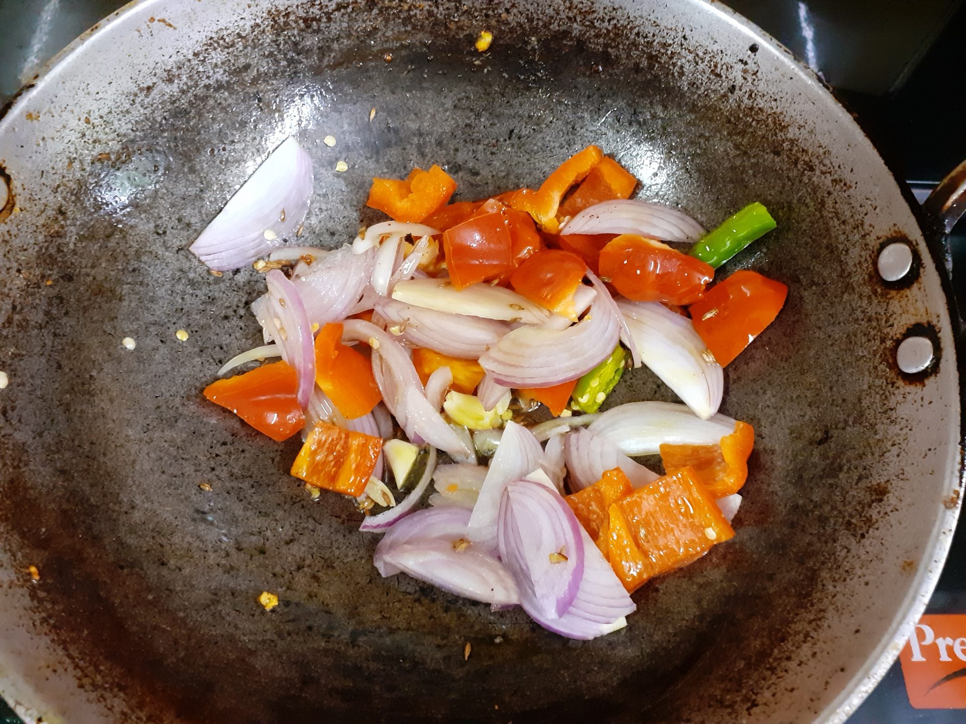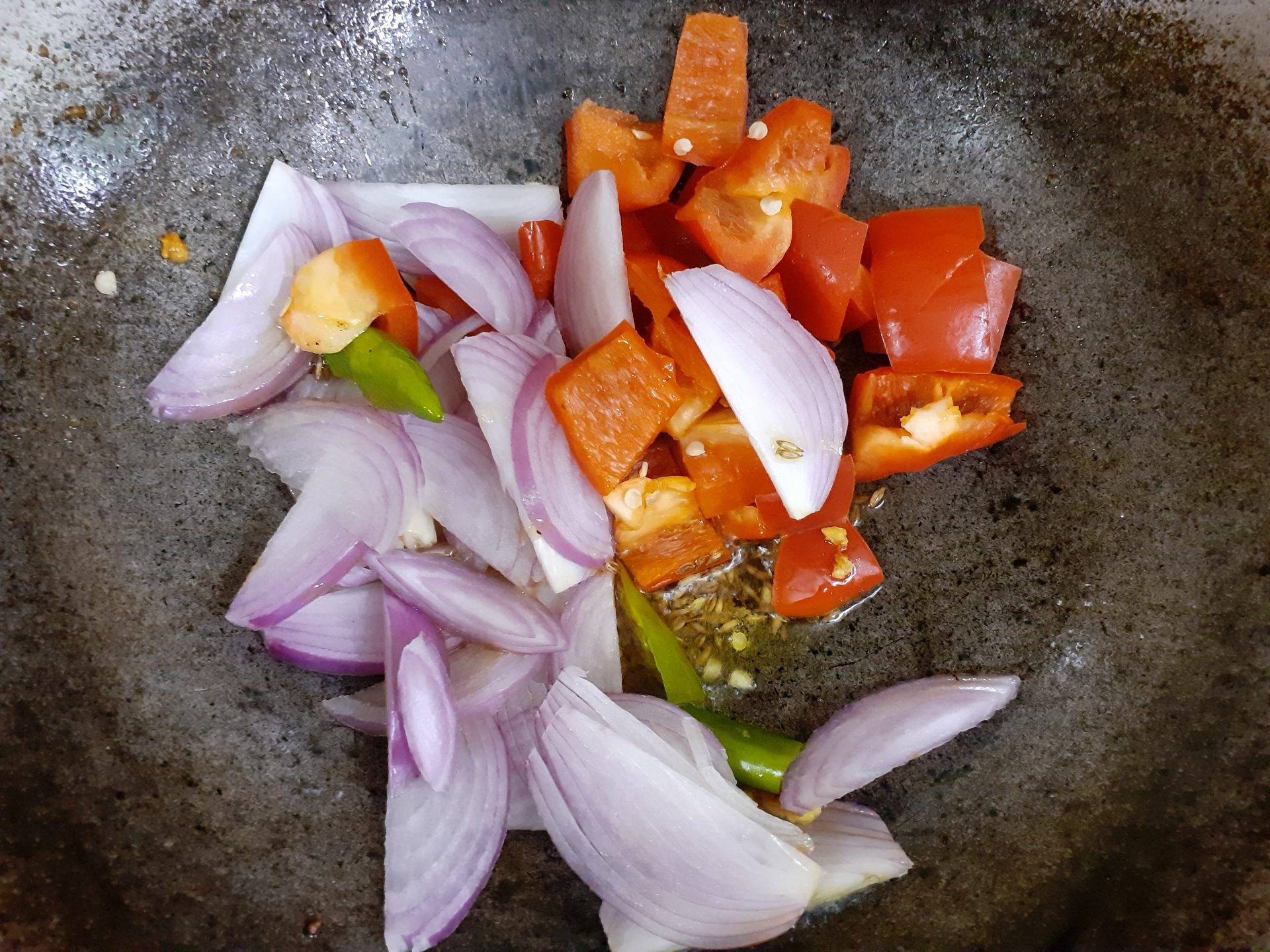 2. Now in the same kadai take a little more oil and heat. Add cumin seeds followed by the Onions, Red bell peppers, green chilli and garlic and saute.