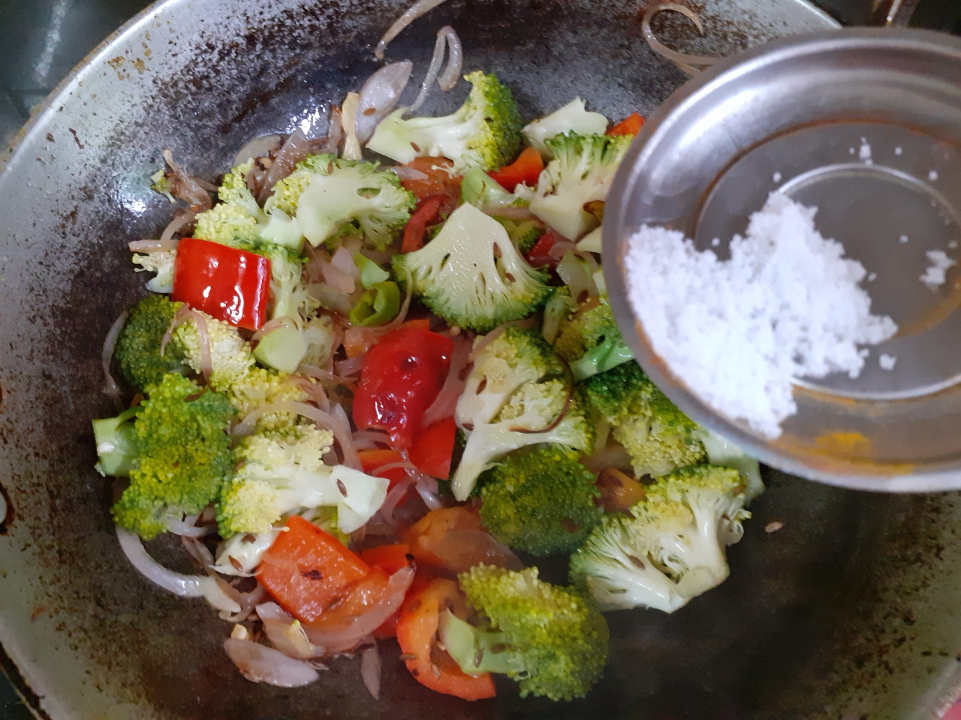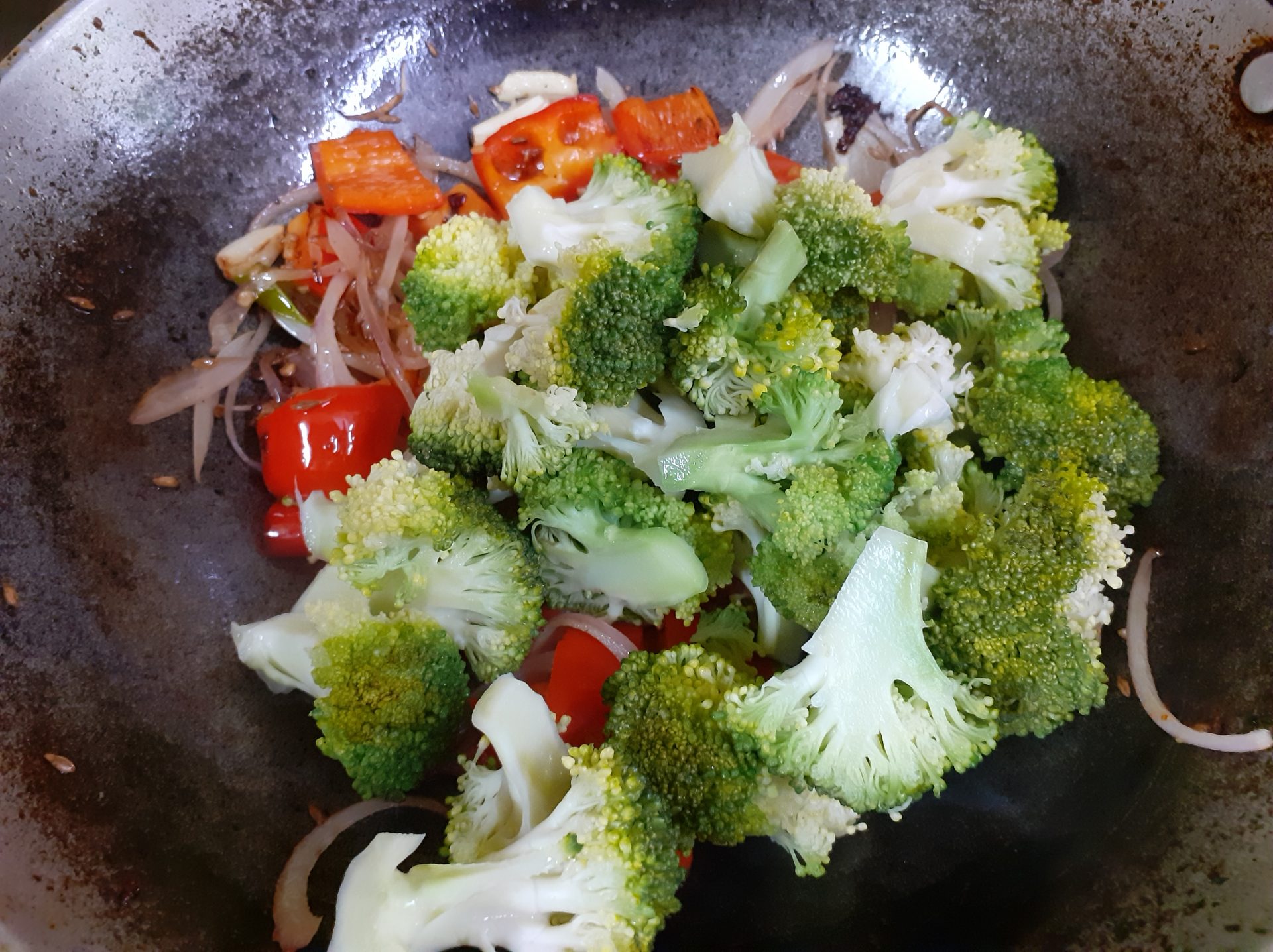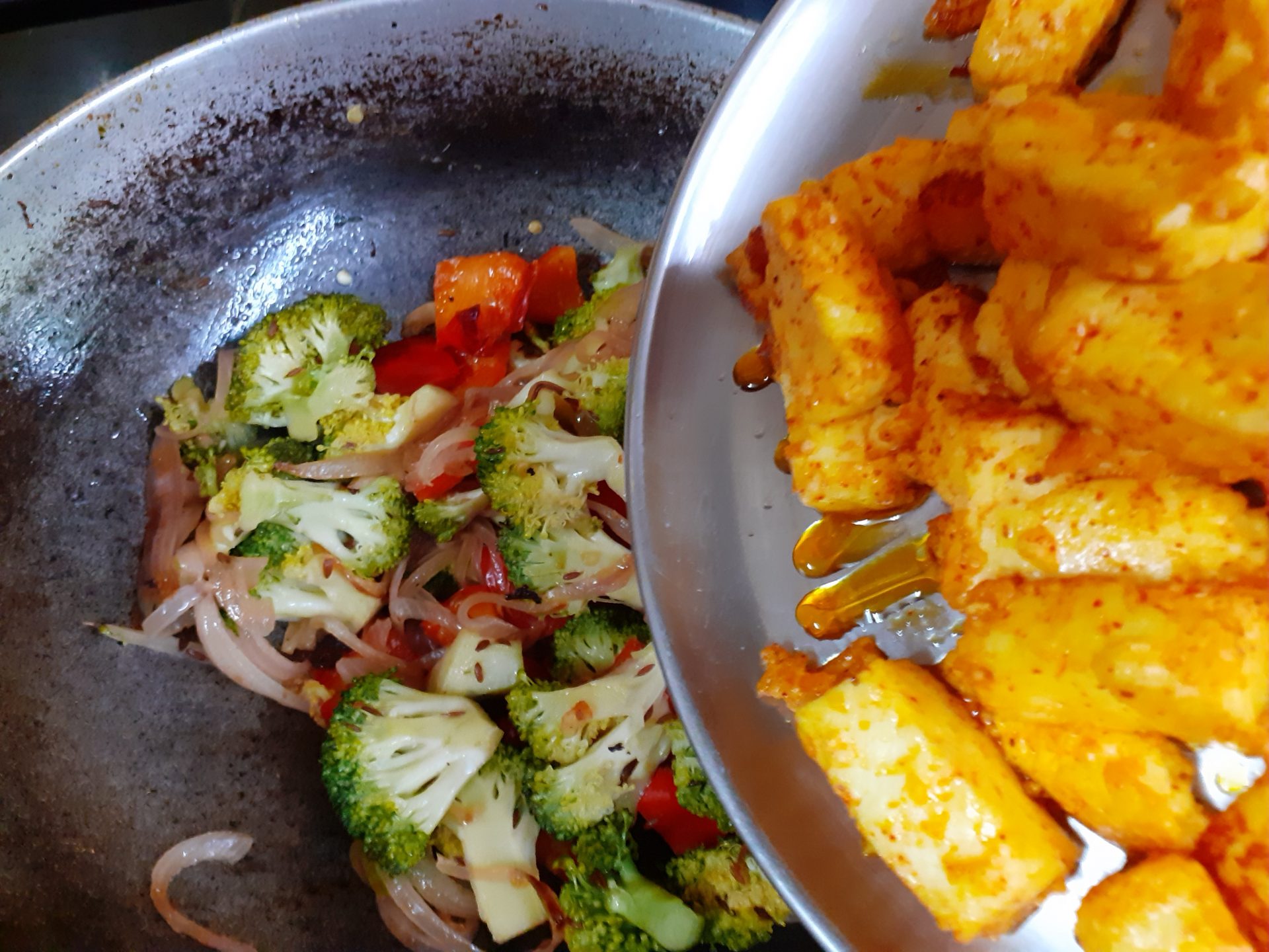 3. When the onions start turning brown, add the broccoli and saute. Saute until the broccoli are almost done, add the sauted paneer to the stir fried vegetables, mix nicely, and transfer the sauteed vegetables into a plate.