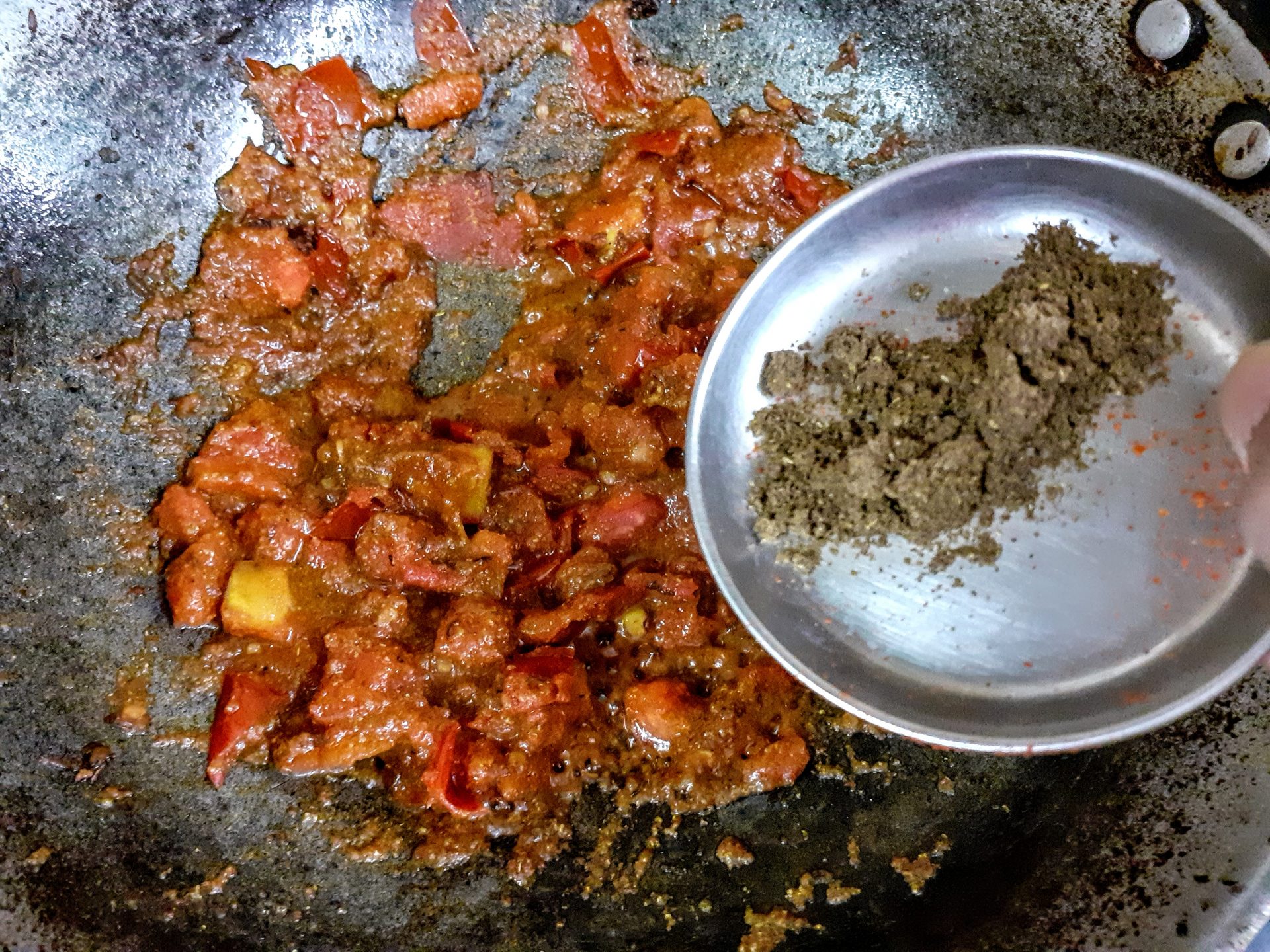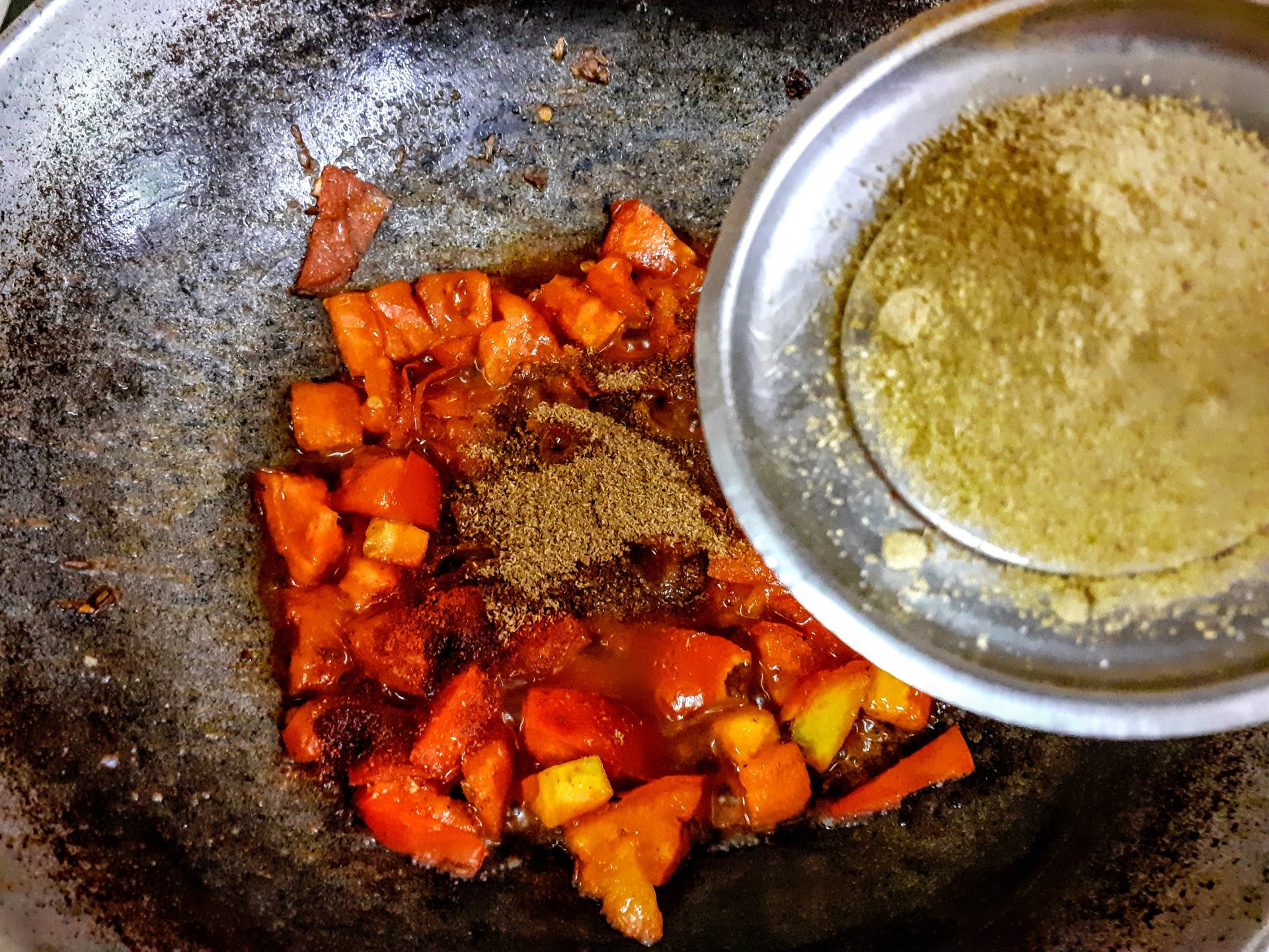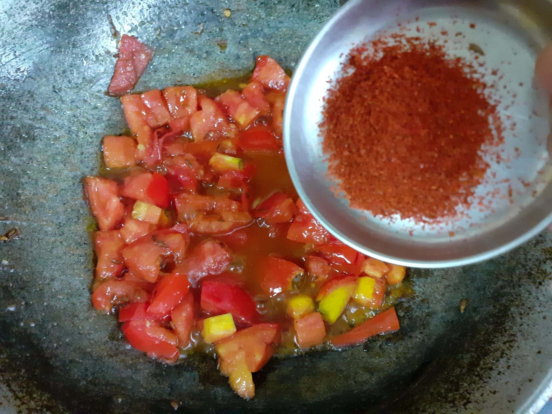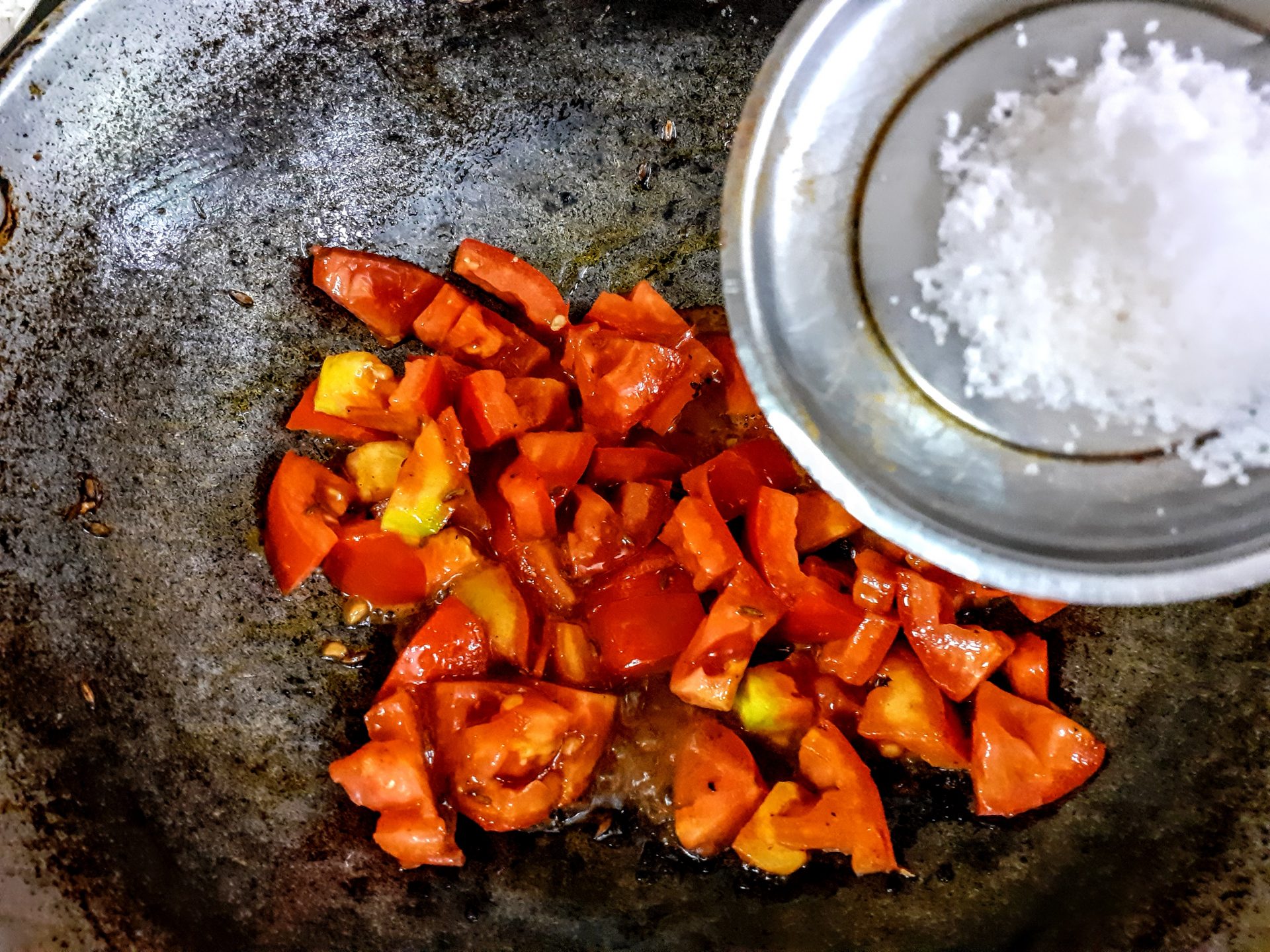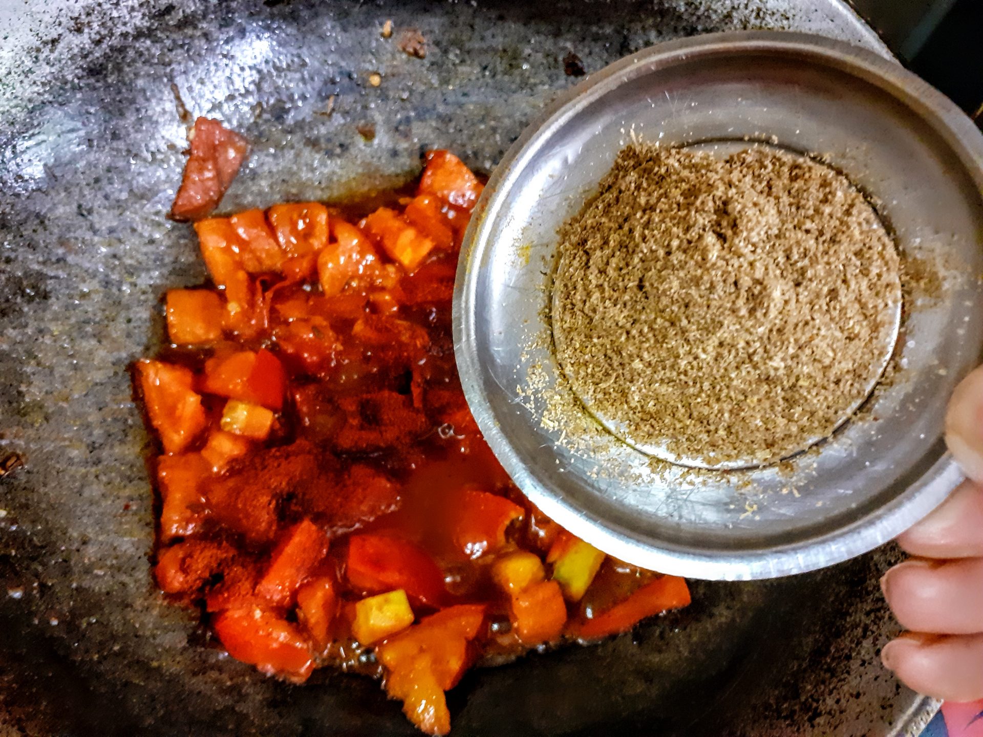 4. Now add a little more Oil to the same Pan/ kadai, add cumin seeds, as they splutter,add the turmeric powder, followed by the tomatoes. Now add salt, red chilli powder, coriander powder, and fennel powder and saute.