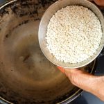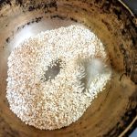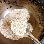 - Heat a kadai or pan and drop in the sesame seeds. Stir continuously and roast them until they are hot to touch. We don’t want them to splutter. So just as a few splutter turn off the stove and transfer the seeds to a plate to cool.