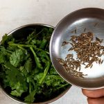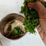 - Now put the cooled seeds into a blender,and add the remaining ingredients- coriander leaves, green chillies, cumin seeds and give it a spin.
