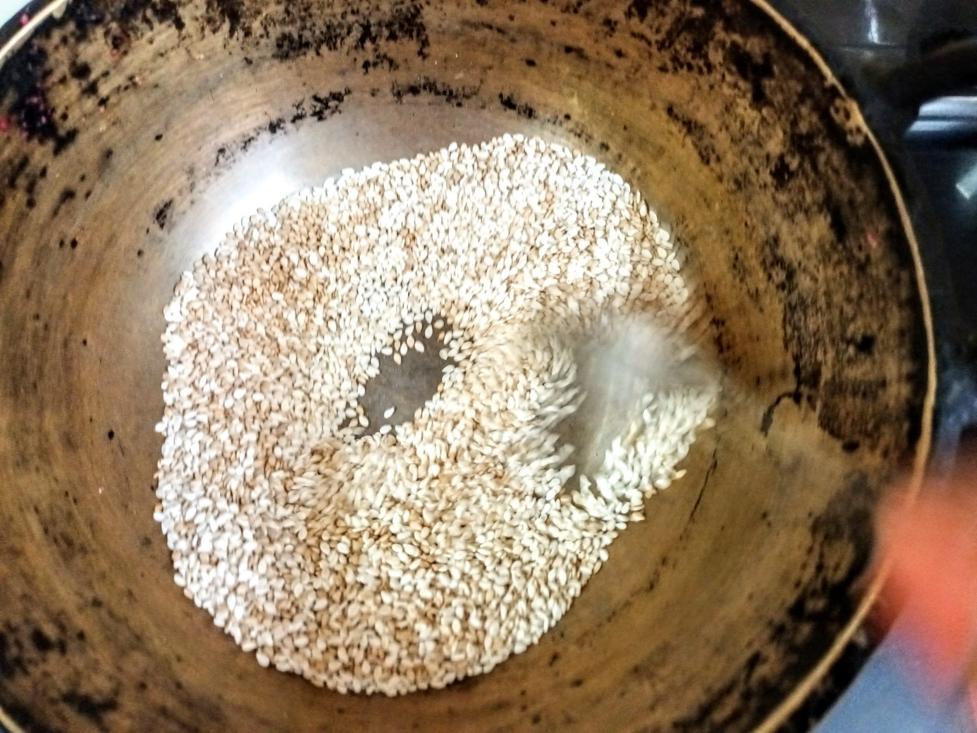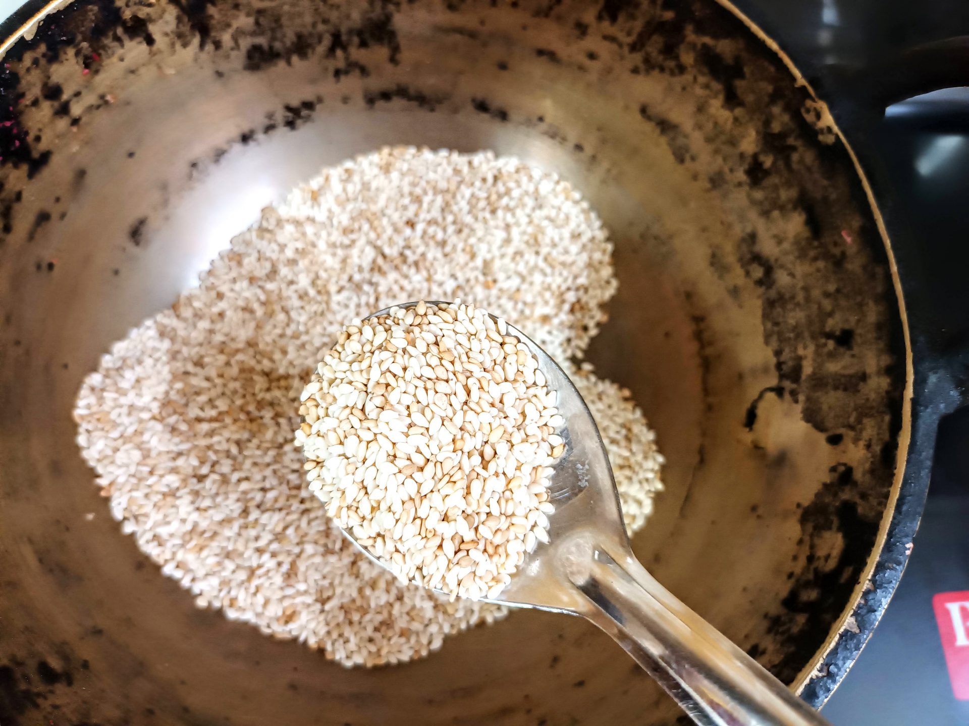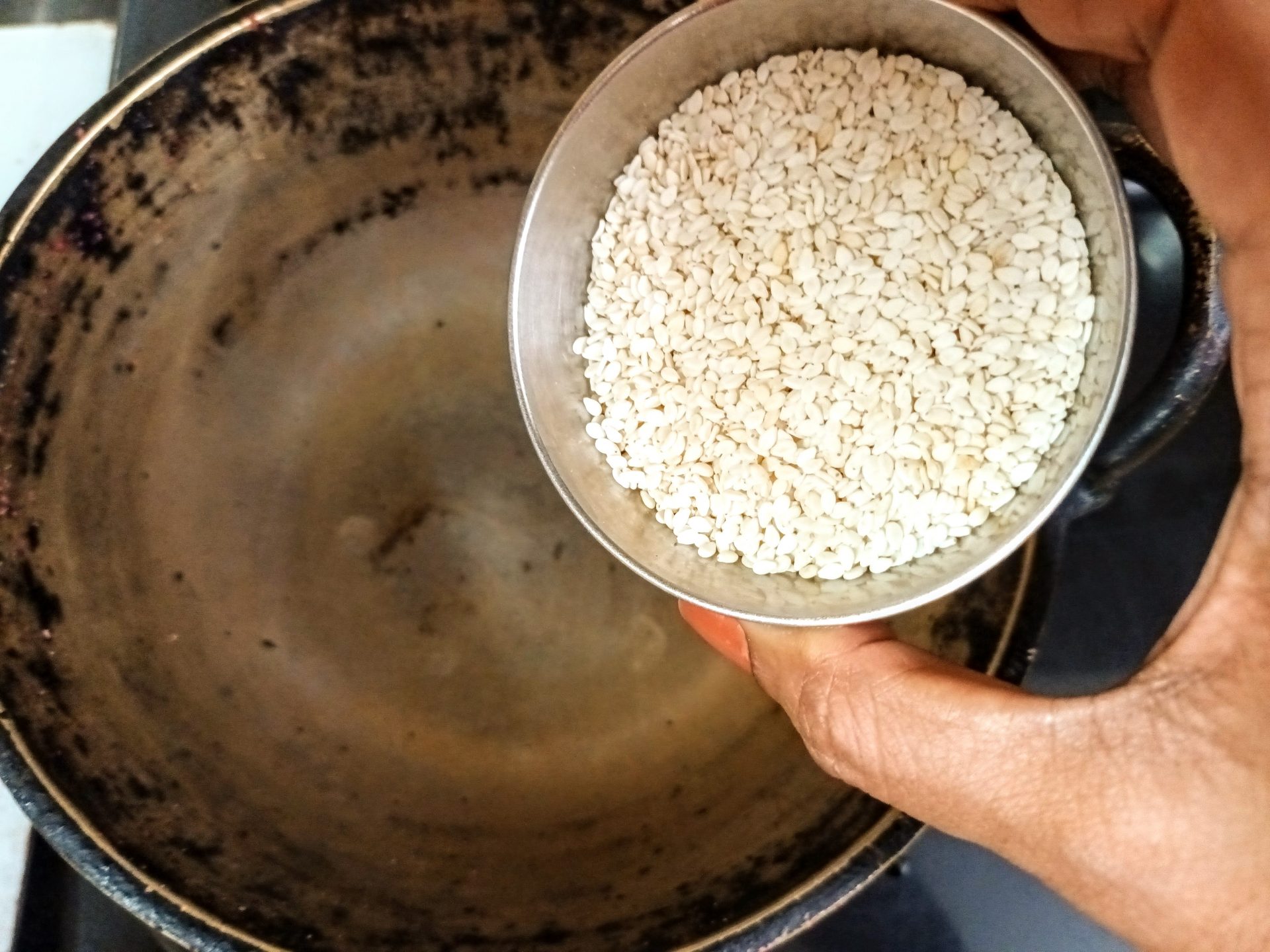 1. Heat a kadai or pan and drop in the sesame seeds. Stir continuously and roast them until they are hot to touch. We don’t want them to splutter. So just as a few splutter turn off the stove and transfer the seeds to a plate to cool.
