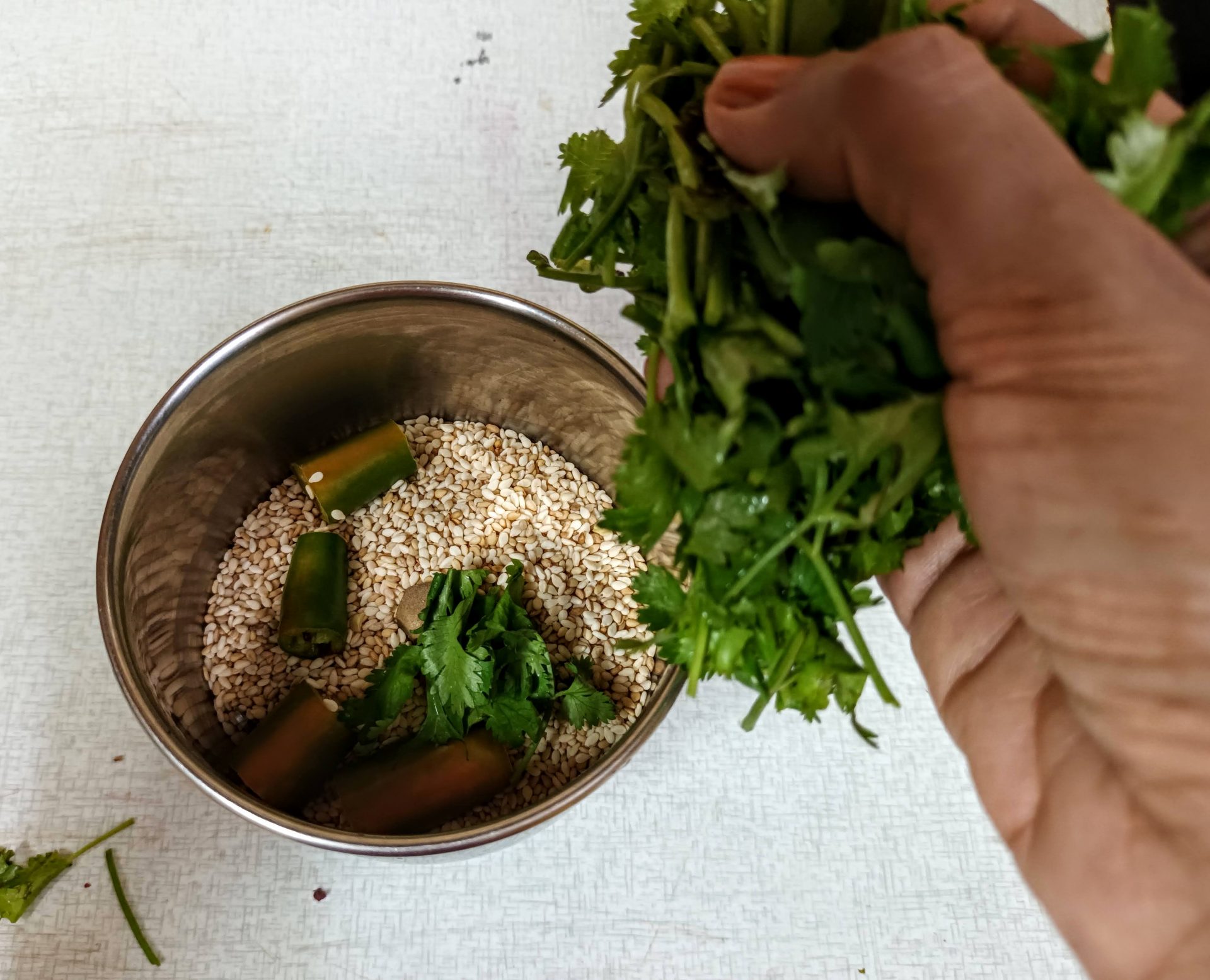 Heat a kadai or pan and drop in the sesame seeds. Stir continuously and roast them until they are hot to touch. We don’t want them to splutter. So just as a few splutter turn off the stove and transfer the seeds to a plate to cool. Now put the cooled seeds into a blender,and add the remaining ingredients- coriander leaves, green chillies, cumin seeds and give it a spin. Now add salt,  followed by a squeeze of lemon and blend again to a semi fine paste. Use water if required. I used about 2 tbsp. The chutney is ready to serve.