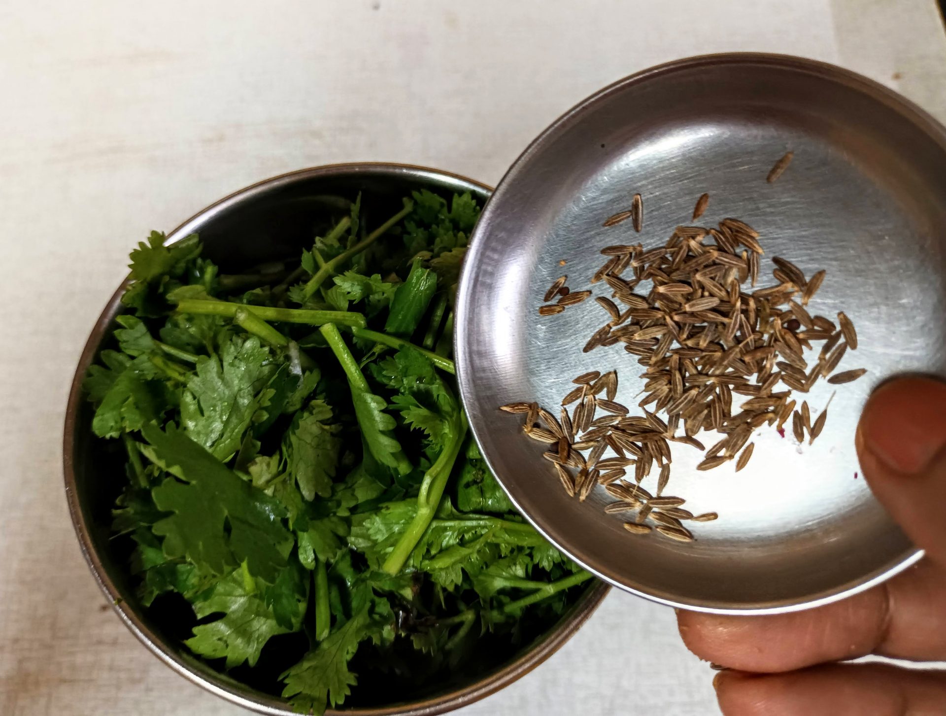 2. Now put the cooled seeds into a blender,and add the remaining ingredients- coriander leaves, green chillies, cumin seeds and give it a spin.