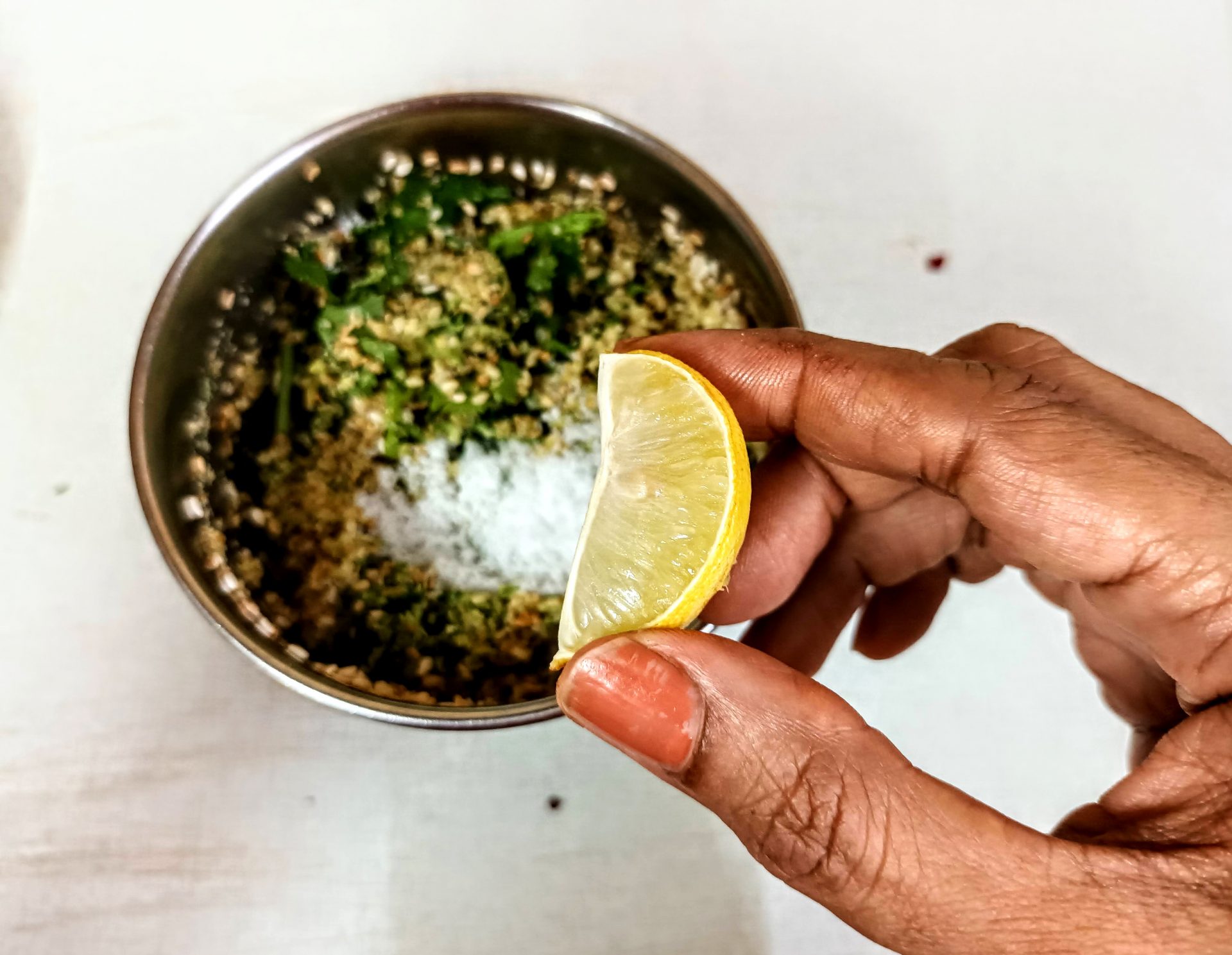 3. Now add salt,  followed by a squeeze of lemon and blend again to a semi fine paste. Use water if required. I used about 2 tbsp. The chutney is ready to serve.