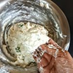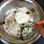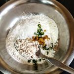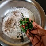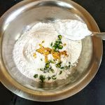 - In a mixing bowl take the Maida/ refined flour, and add the chopped green chillies and ginger, add the rice flour and grated coconut to it. Further add the finely chopped curry leaves.