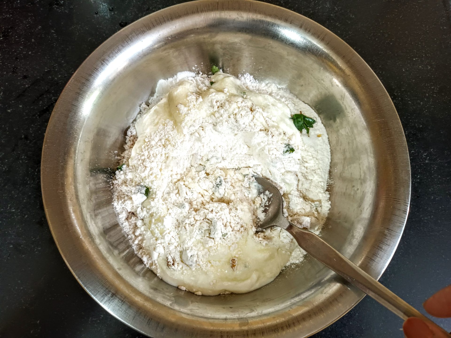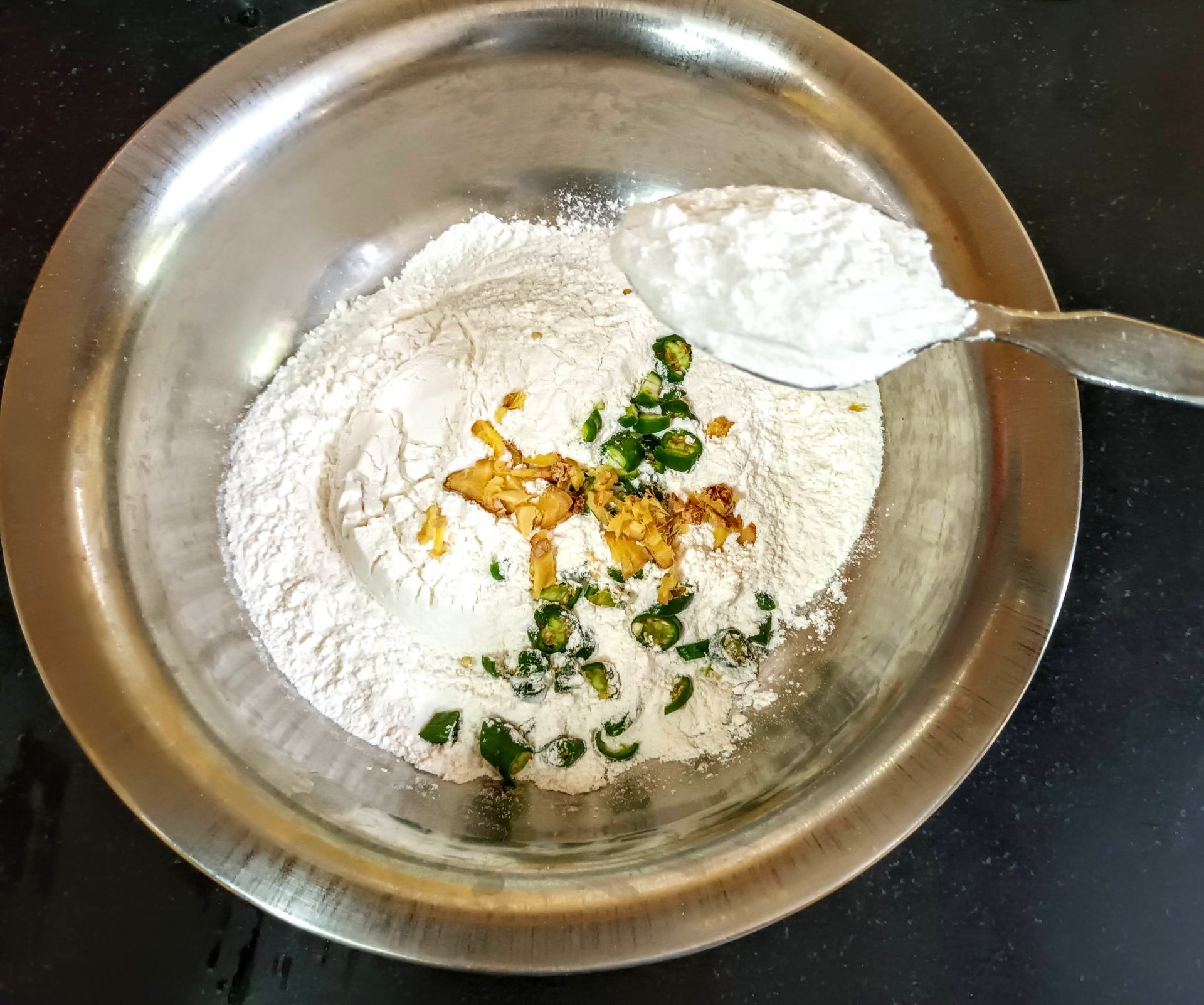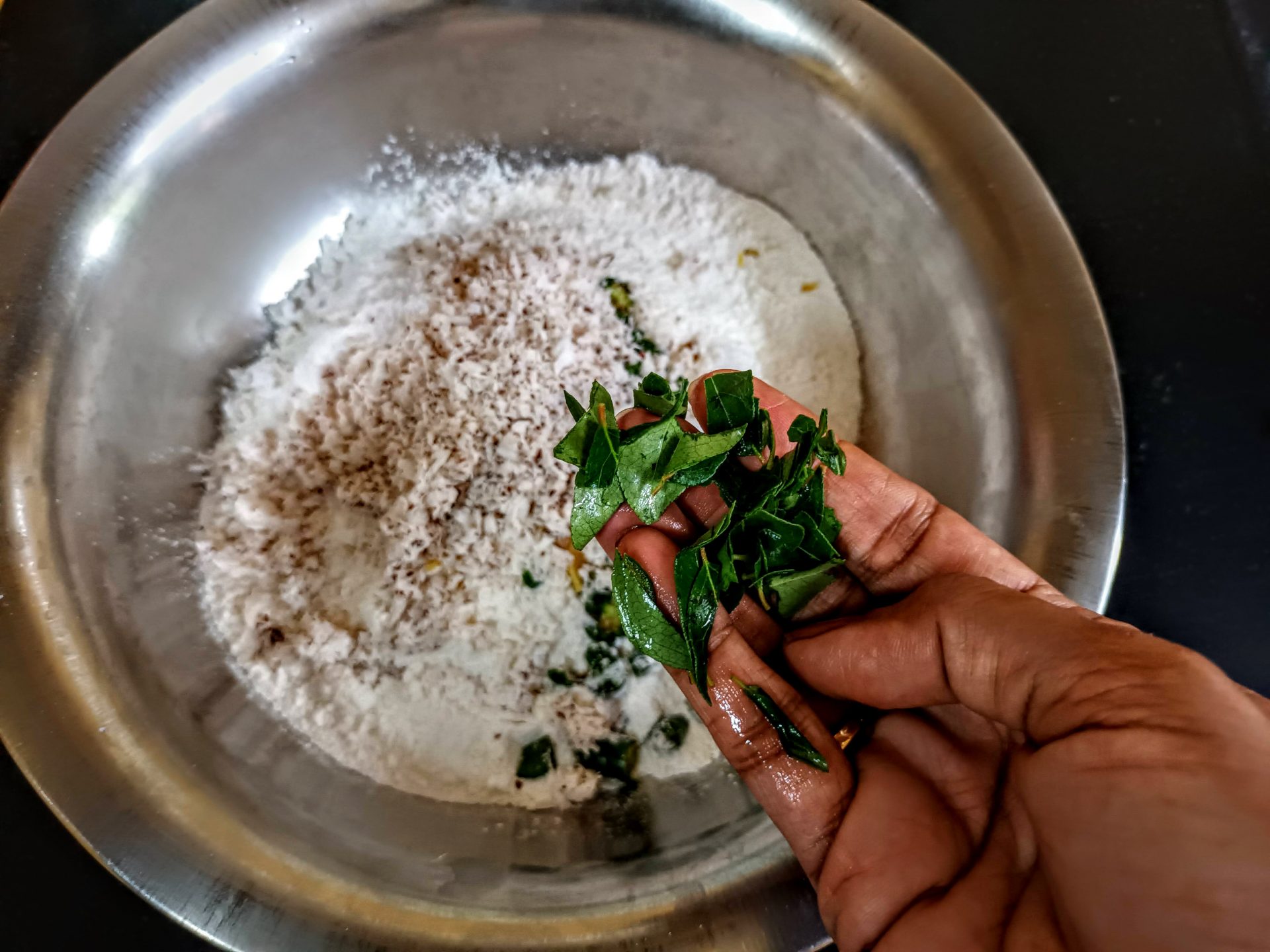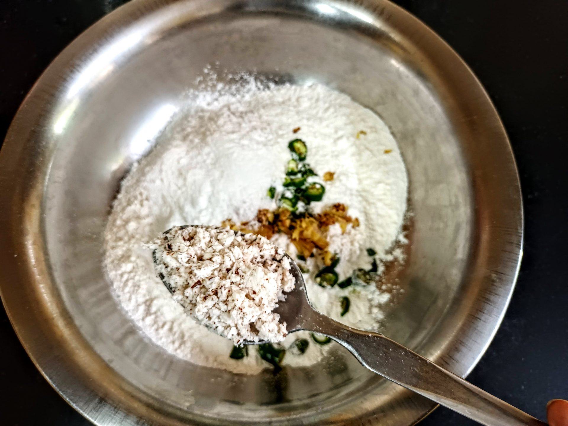 - In a mixing bowl take the Maida/ refined flour, and add the chopped green chillies and ginger, add the rice flour and grated coconut to it. Further add the finely chopped curry leaves.