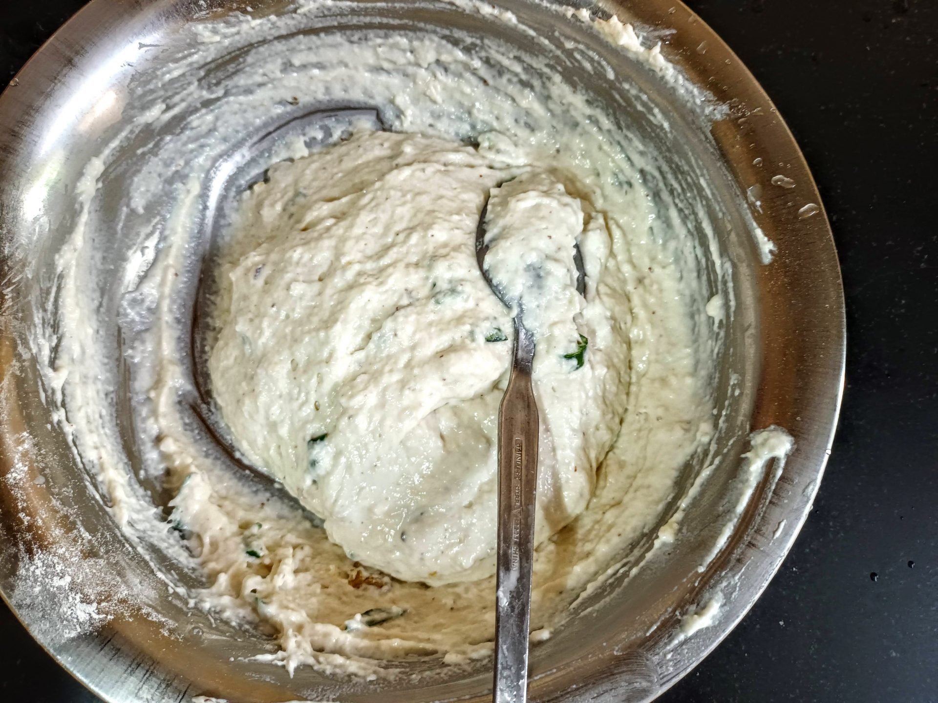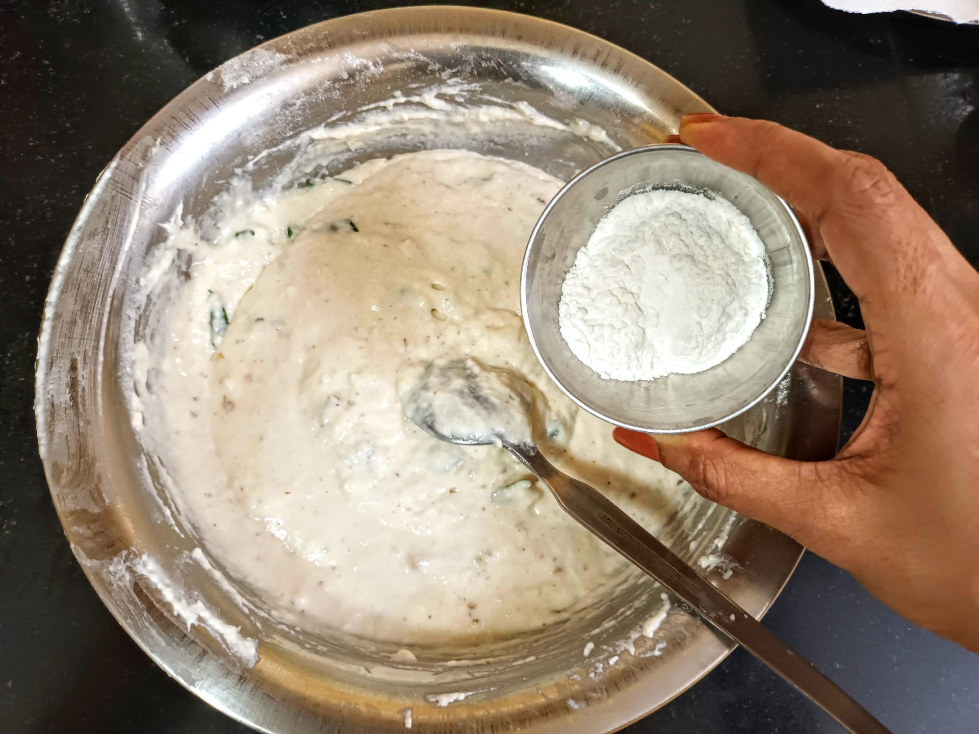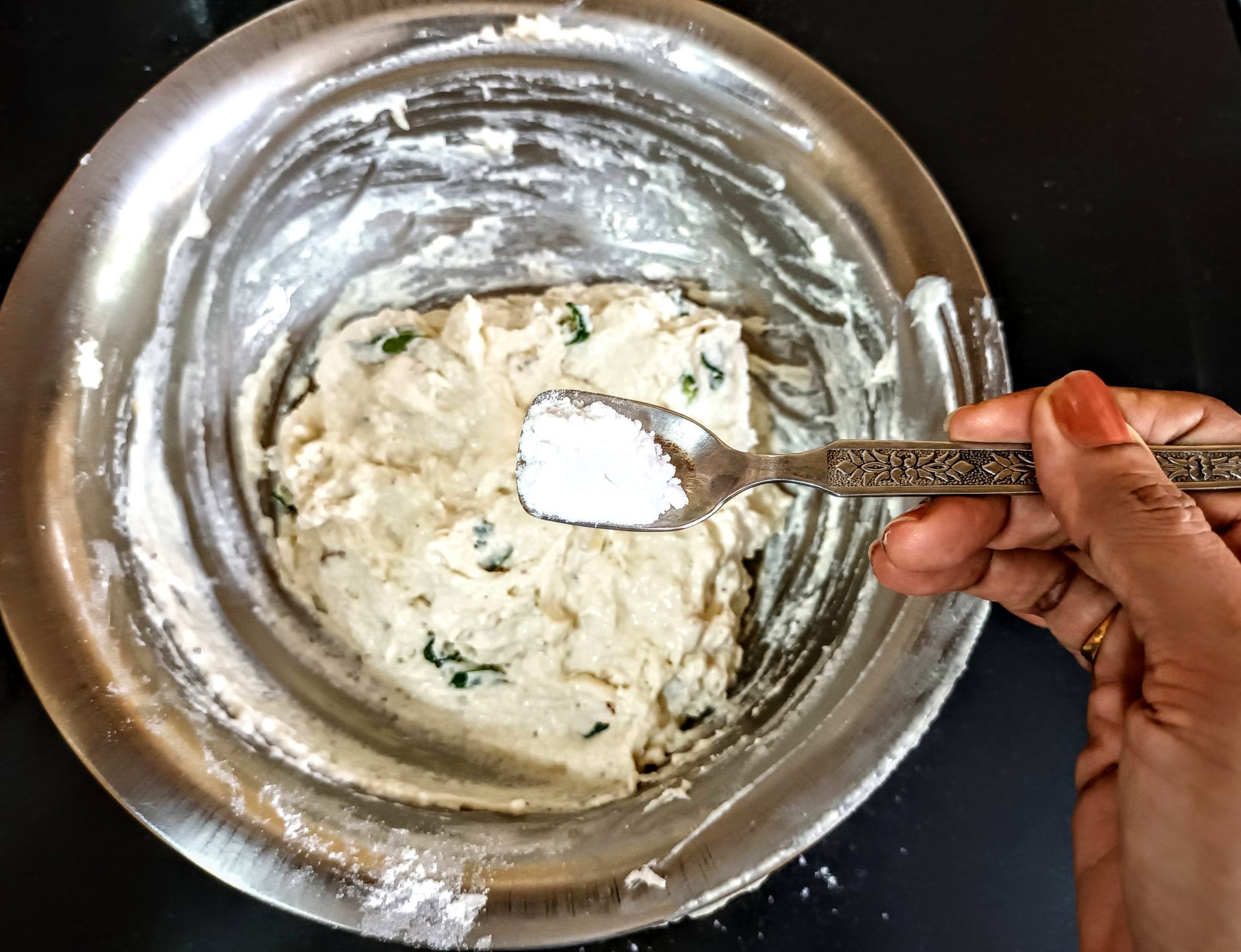 - Mix everything well with a spatula, now add water little by little to make a thick batter. Now add the baking soda, mix well,and leave the batter to ferment for 3 hours.
