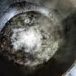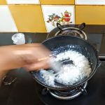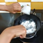 - To make the dough: Take 1.5 cups of water in a heavy bottomed Kadai, add the salt and oil, and roll boil. (Roll boiling is when the water starts bubbling the bubbles rise upfromthe bottom of the kadai and go down again). Keep another 1/2 cup water in a cup close by(to use if required). Now slowly adding the flour with one hand, stir continuously with the other.(see picture). Keep stirring until the whole flour is in the water. Using a spatula mix well,until it comes together, add oil, and transfer the dough to a bowl.