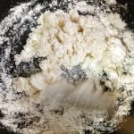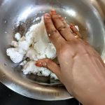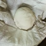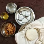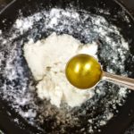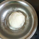 - Now let the dough cool for 5 minutes(don’t let it cool completely). It may appear dry, sprinkle some water over it from the 1/2cup water ,and knead the dough well. The dough should be smooth and crack free. Test the dough by pinching a small portion, and try to shape it. Ifthe dough is cracking up,or falling apart,the dough is dry. sprinkle more water and knead the dough again. Now form a ball of the dough, apply little oil, and keep it covered in a wet cloth until further use. The can rest while the stuffing is made.