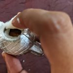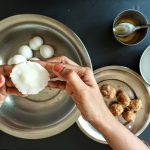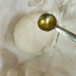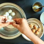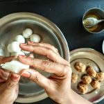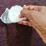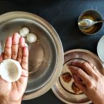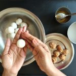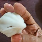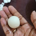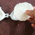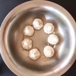 - To Shape the Modaks with hand: Grease palms, pinch Lemon sized balls from the dough,and keep covered. Take one one ball at a time(ensure the dough is crack free and smooth), start by first flattening the outer edges with your thumb and index finger, as shown in the picture. Now with your thumb finger press the bulgy center part inwards,forming a well. Now widen then well and start giving the shape of a cup that is a little deep, so that the Purnam/filling fits comfortably. Now place the coconut Purnam in the center.