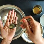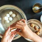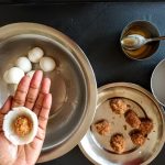 Folklore has it that, once Lord Shiva(Ganesha’s father),along with Parvathi and Son Ganesha visited Anusuya. Anusuya is the wife of Rishi Atri. Anusuya said that she would feed the little Ganesha first,and then Lord Shiva,and Parvathi. Anusuya offered many delicacies to Lord Ganesha(who was a child then). He kept eating whatever was offered, without getting satiated. Lord Shiva was getting impatient,and wanted to leave(as per custom,we never send our guests away without feeding them). So Ausuya feeds Ganesha a steamed sweet dumpling,after which he burps loudly,signaling satiation. Parvathi wanted to know what is the sweet that finally made her son satiated. Upon learning that it is the Modak, she expresses that – from then on His devotees must offer Him Modak. This tradition from then on,has passed from one generation to the next. Usually 21 Modaks or 100 are offered to Lord Ganeshas prasad.