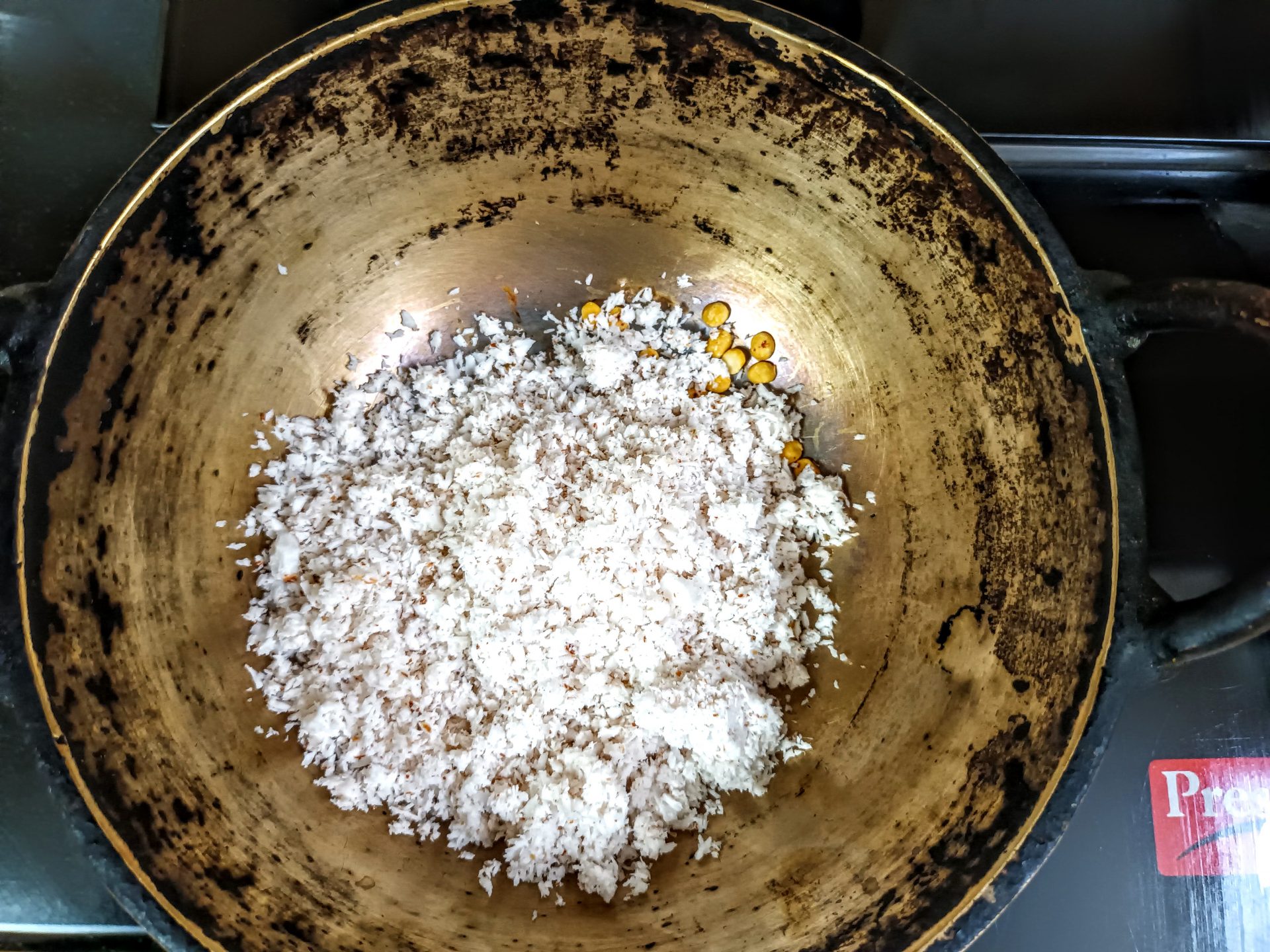 5. To make the Coconut filling/Purnam: Take the Chana Dal soaked in water for 10 minutes. Drain the water completely,and pat dry all the moisture. Put the chana dal, in a heavy bottomed kadai, and roast untilwarm, add the grated coconut ,and the jaggery(powder the jaggery before use). Without adding any water keep stirring. The jaggery will start melting from the moisture from the coconut. Stir constantly until the mixture comes together. Add the cardamom powder. Allow to cool completely. The mixture solidifies a little on cooling. Grease your hands with sesame oil or ghee, pinch small portions and make tiny balls and set aside.