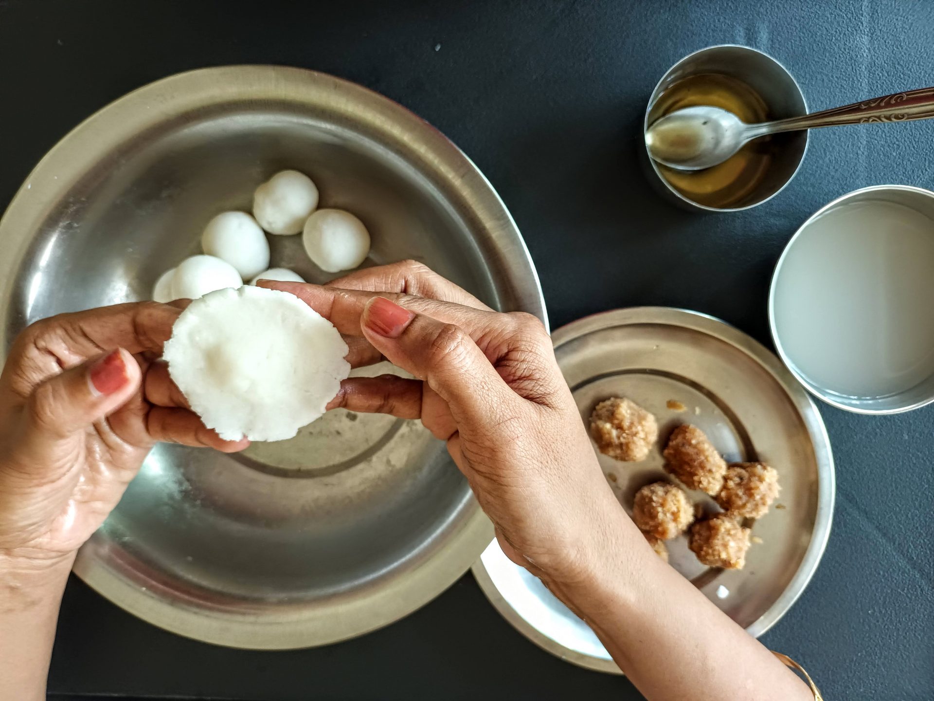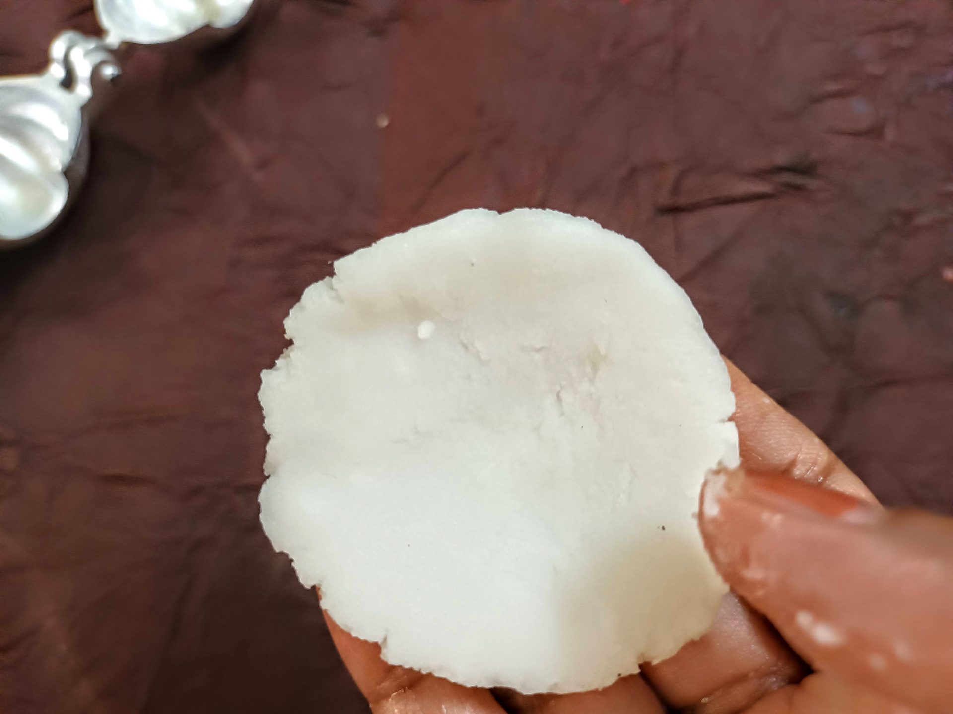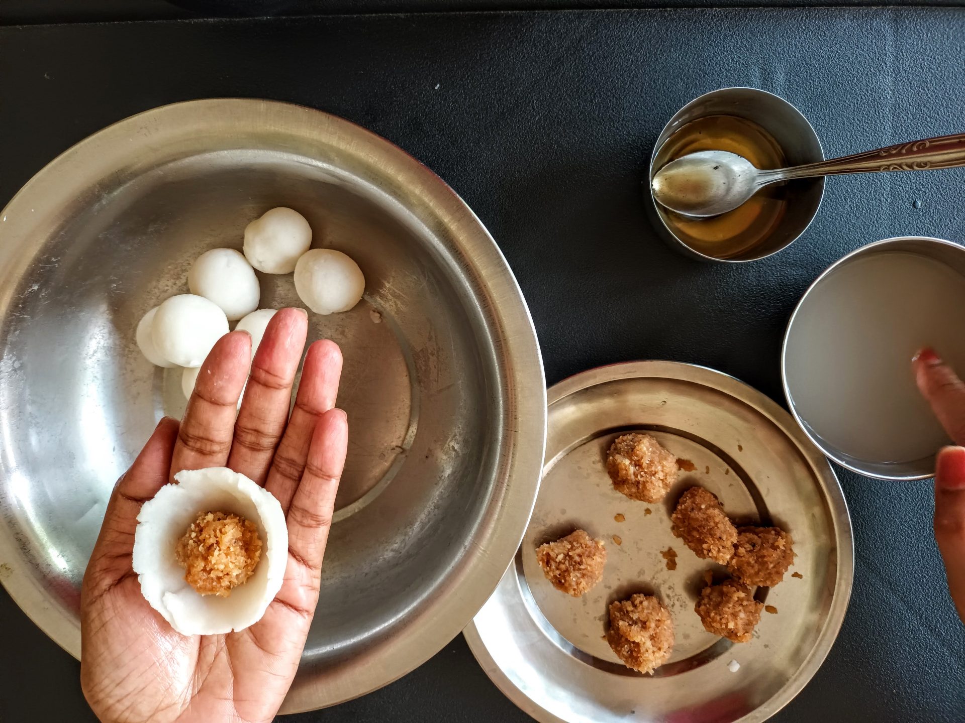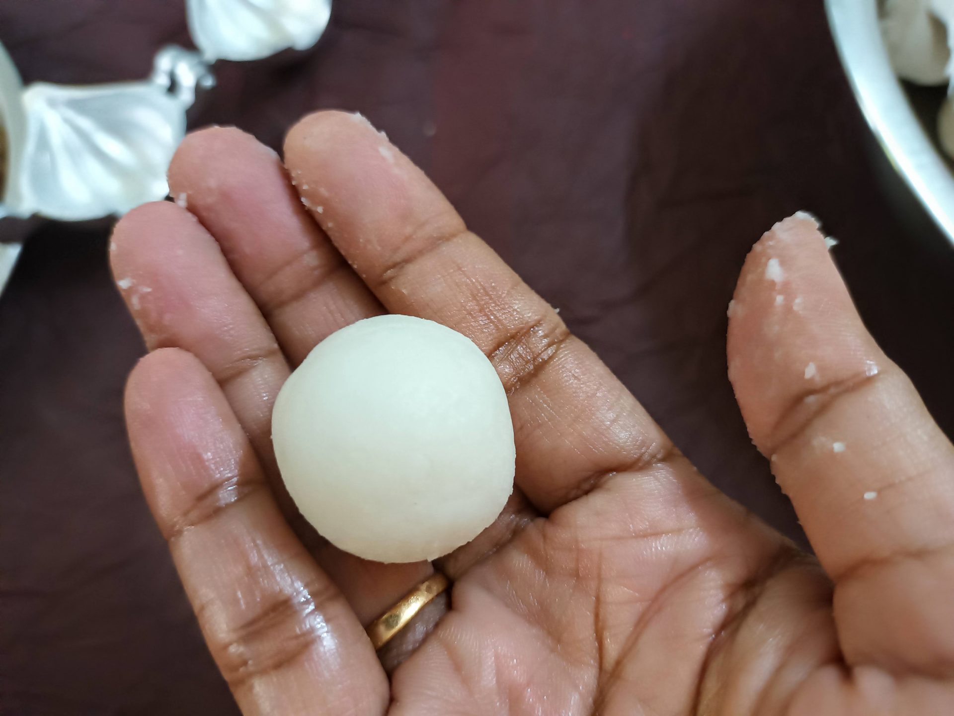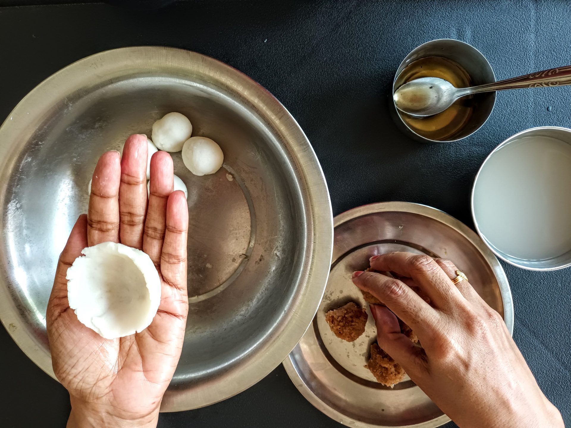 7. To Shape the Modaks with hand: Grease palms, pinch Lemon sized balls from the dough,and keep covered. Take one one ball at a time(ensure the dough is crack free and smooth), start by first flattening the outer edges with your thumb and index finger, as shown in the picture. Now with your thumb finger press the bulgy center part inwards,forming a well. Now widen then well and start giving the shape of a cup that is a little deep, so that the Purnam/filling fits comfortably. Now place the  coconut Purnam in the center.