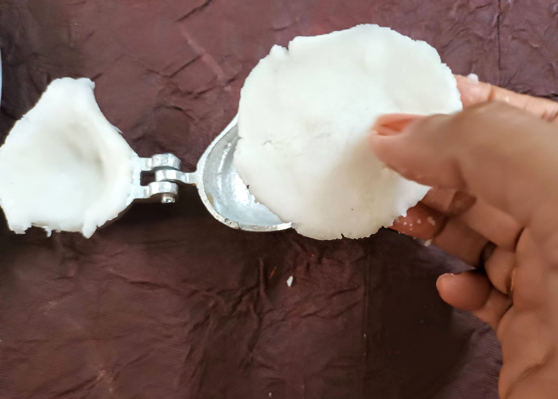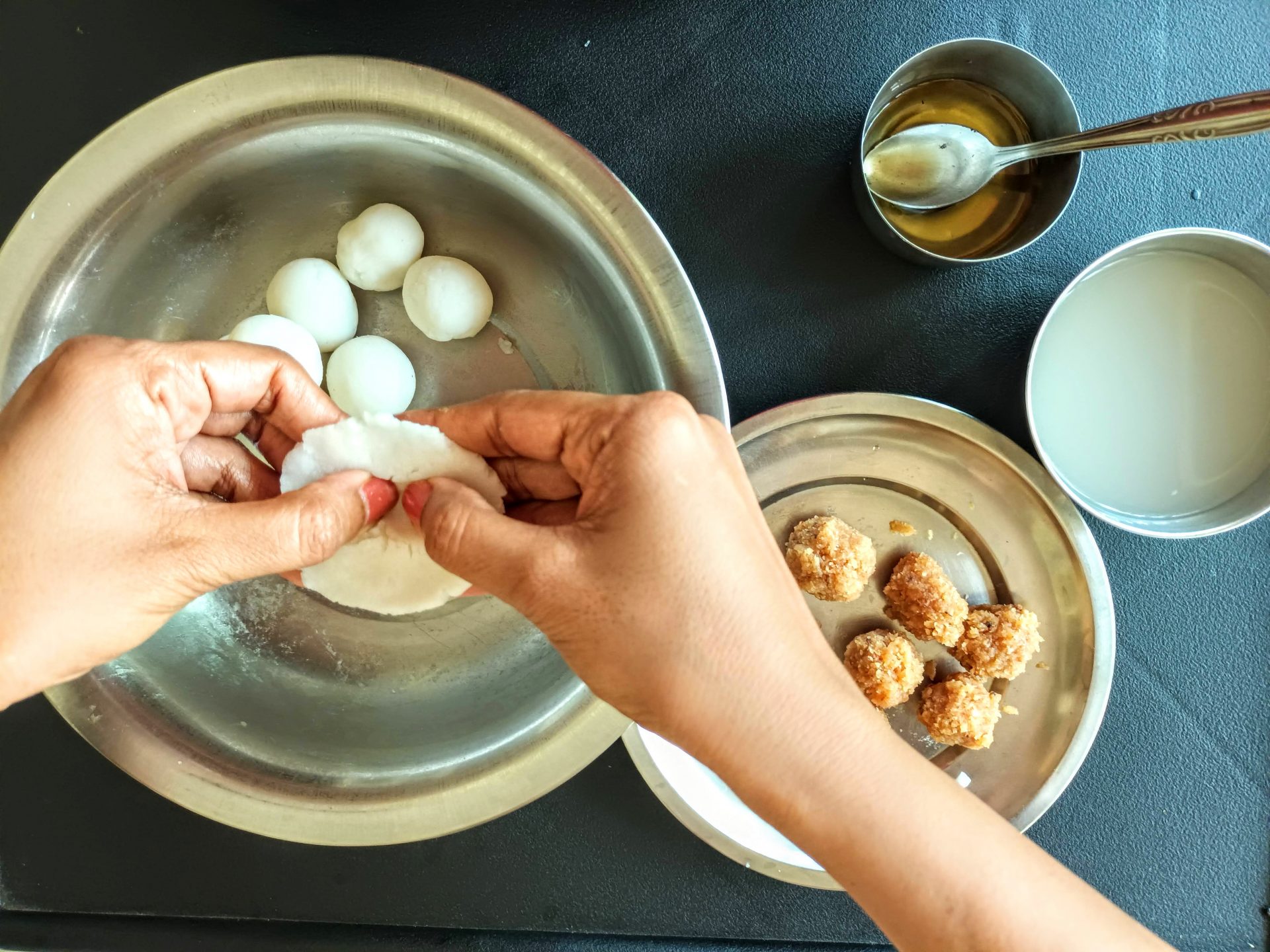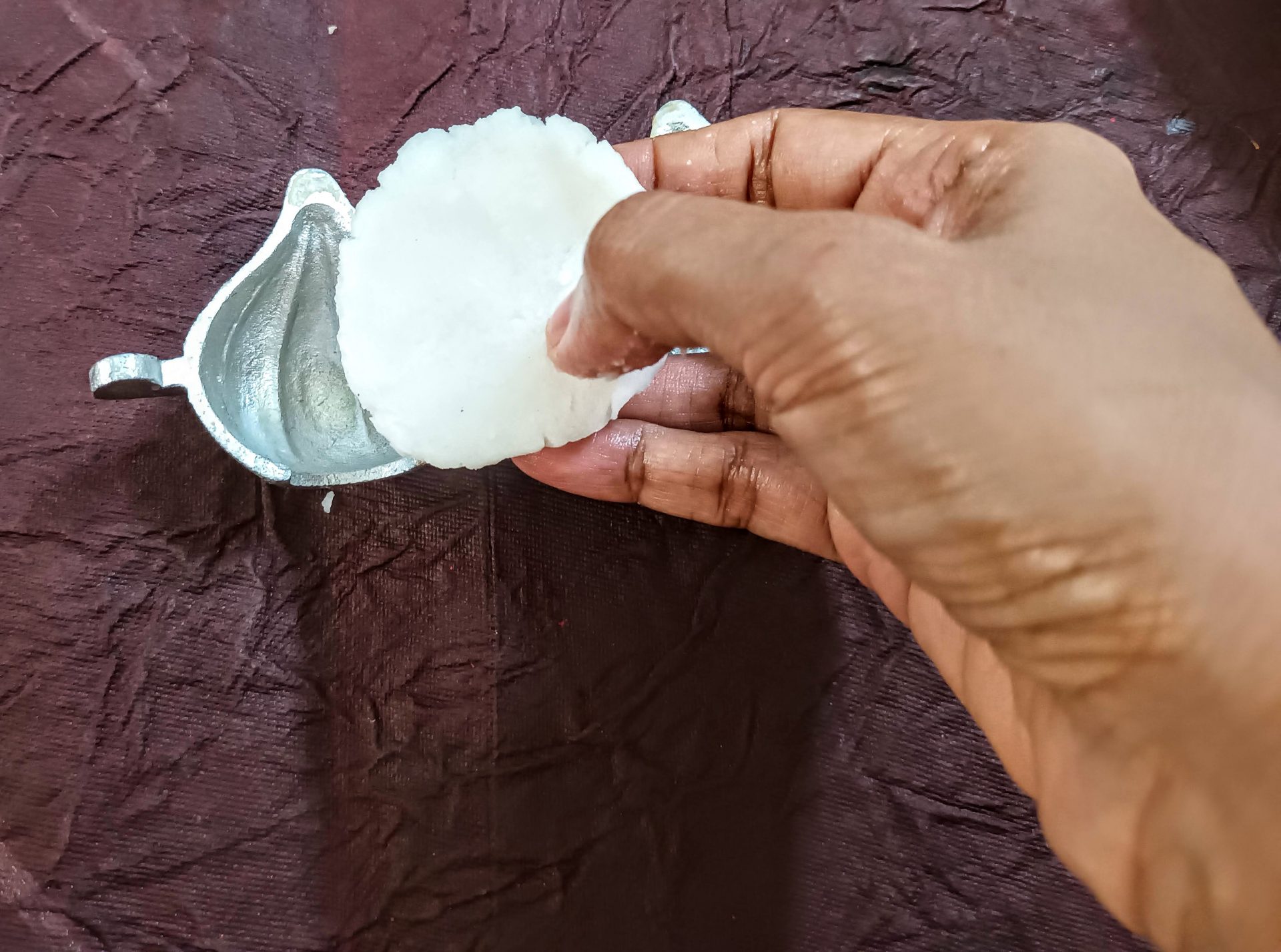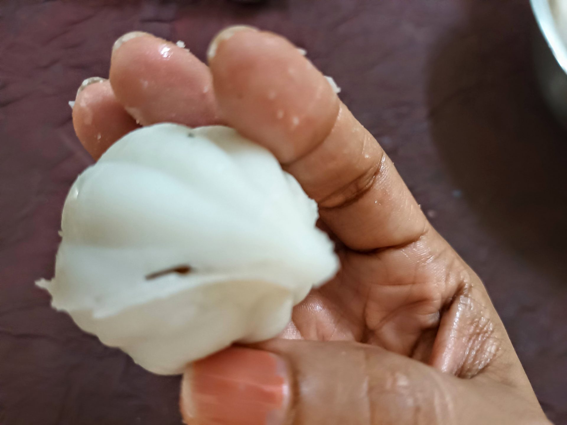 7. To Shape the Modaks with hand: Grease palms, pinch Lemon sized balls from the dough,and keep covered. Take one one ball at a time(ensure the dough is crack free and smooth), start by first flattening the outer edges with your thumb and index finger, as shown in the picture. Now with your thumb finger press the bulgy center part inwards,forming a well. Now widen then well and start giving the shape of a cup that is a little deep, so that the Purnam/filling fits comfortably. Now place the  coconut Purnam in the center.