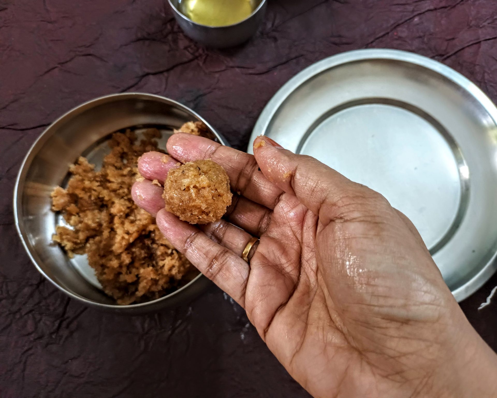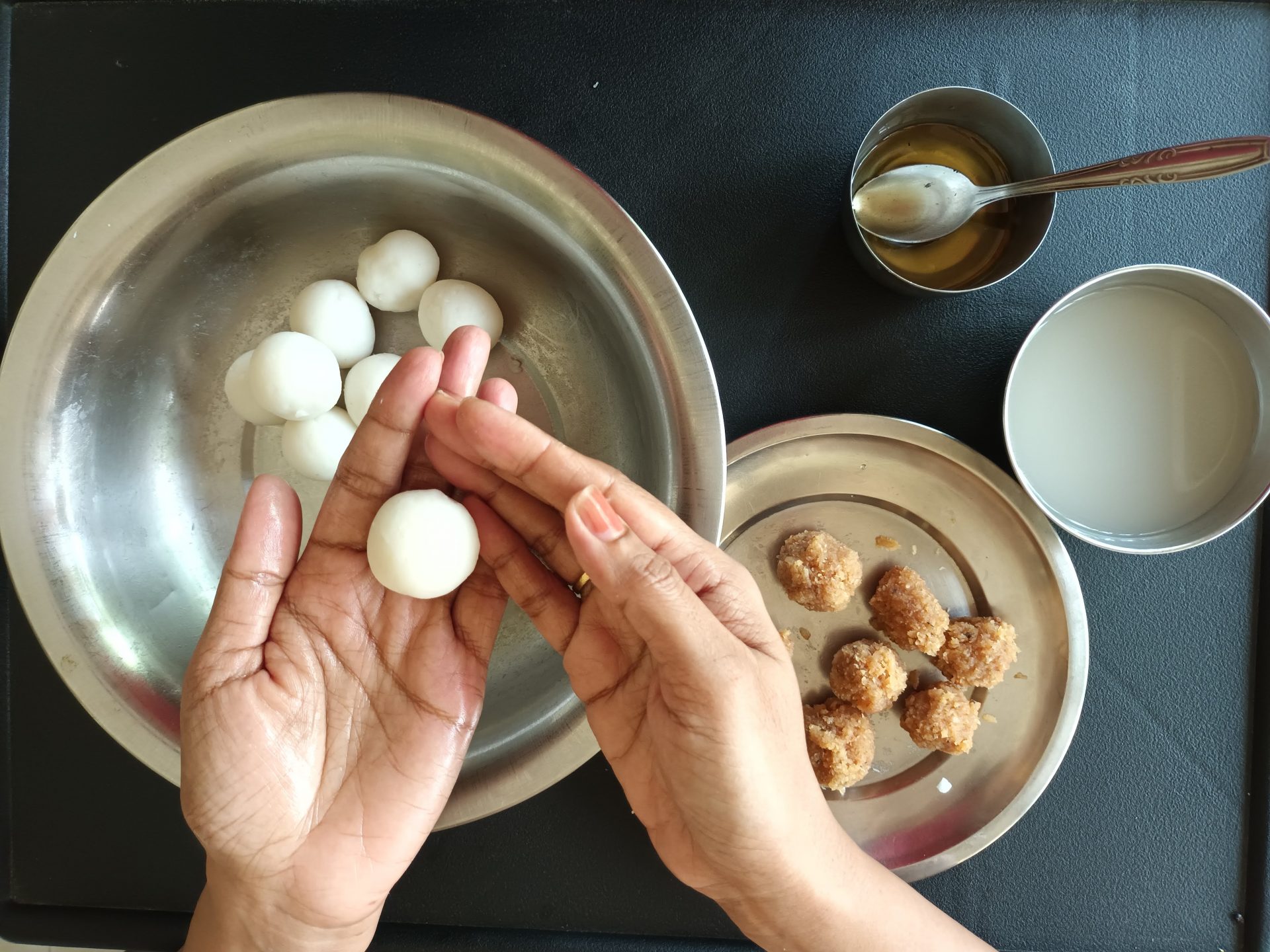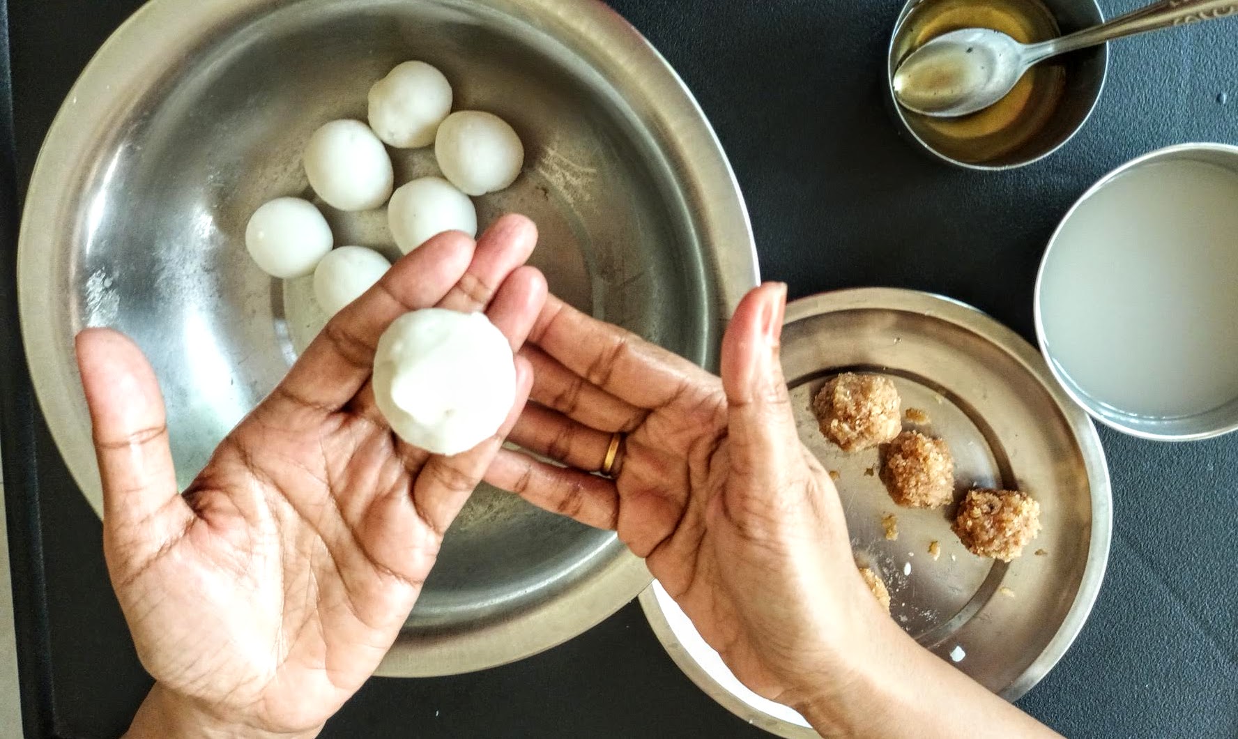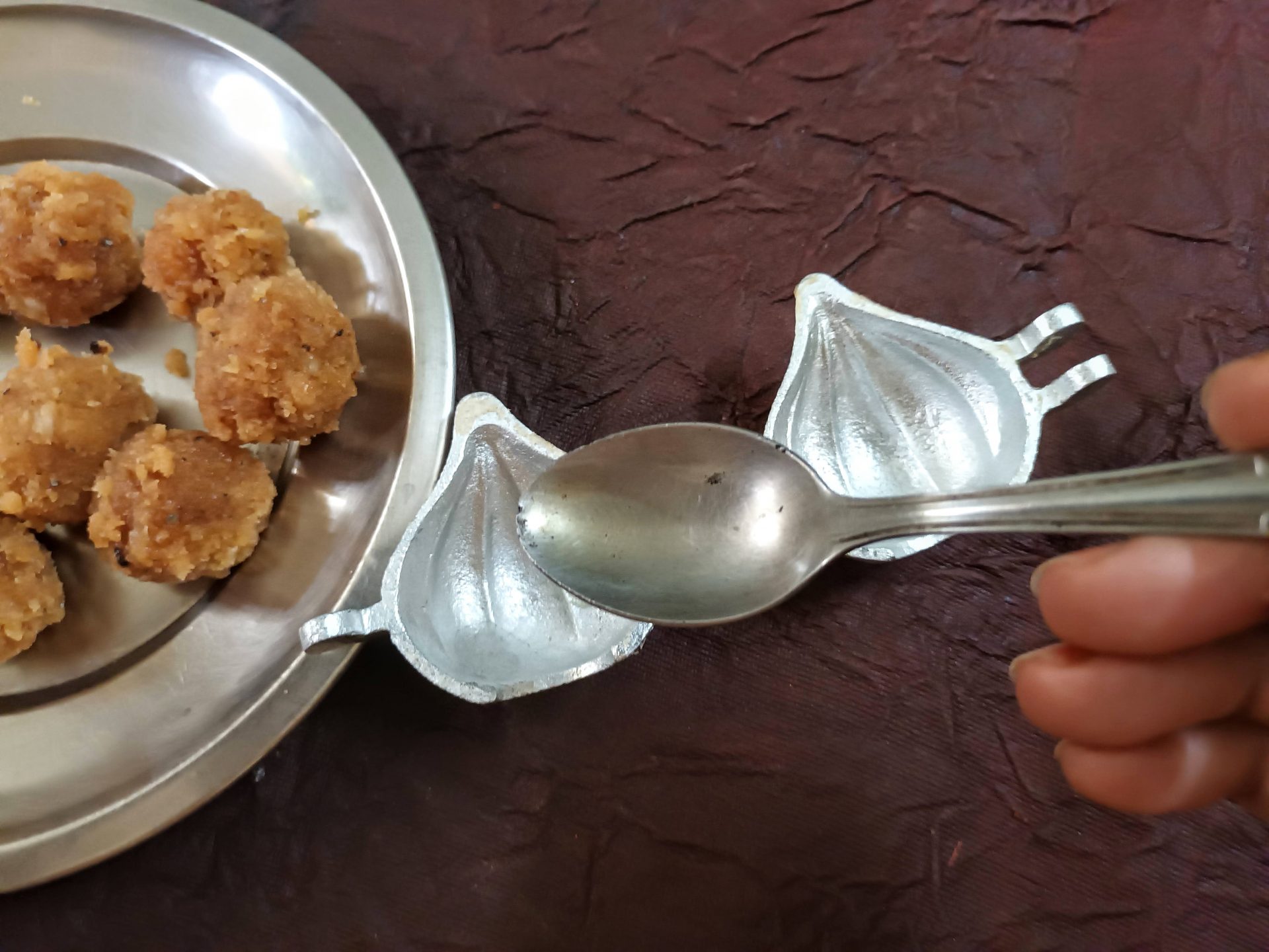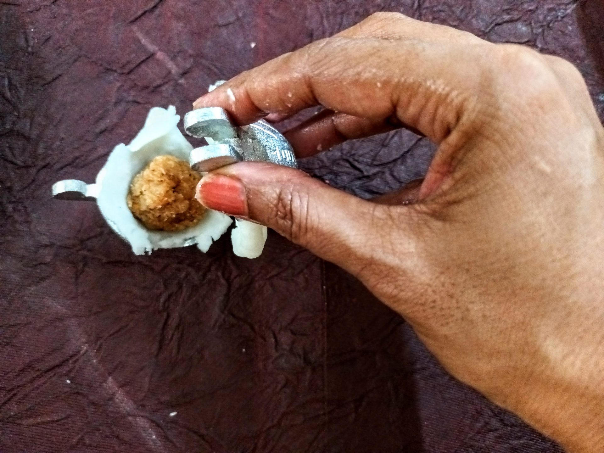 7. To Shape the Modaks with hand: Grease palms, pinch Lemon sized balls from the dough,and keep covered. Take one one ball at a time(ensure the dough is crack free and smooth), start by first flattening the outer edges with your thumb and index finger, as shown in the picture. Now with your thumb finger press the bulgy center part inwards,forming a well. Now widen then well and start giving the shape of a cup that is a little deep, so that the Purnam/filling fits comfortably. Now place the  coconut Purnam in the center.