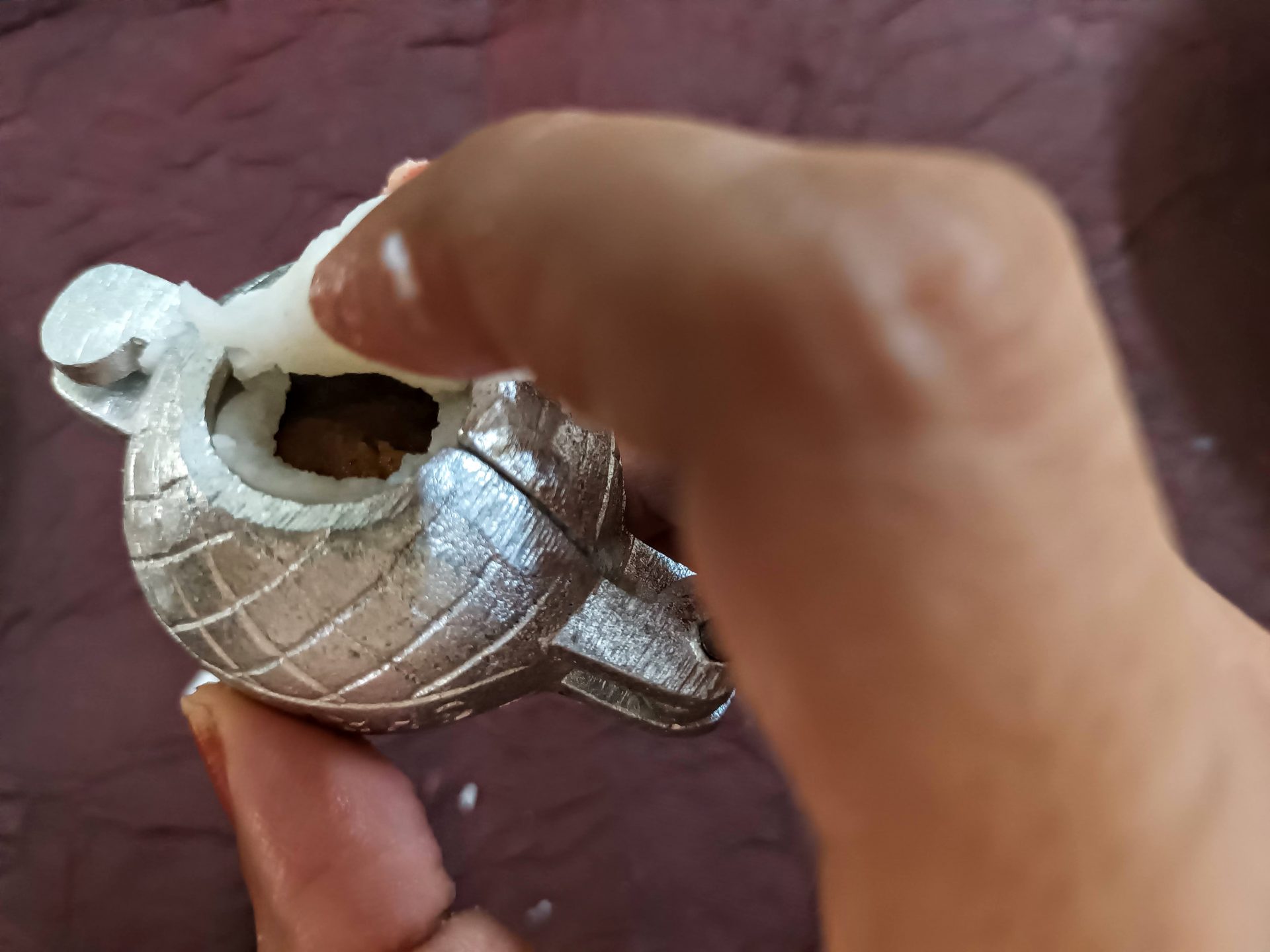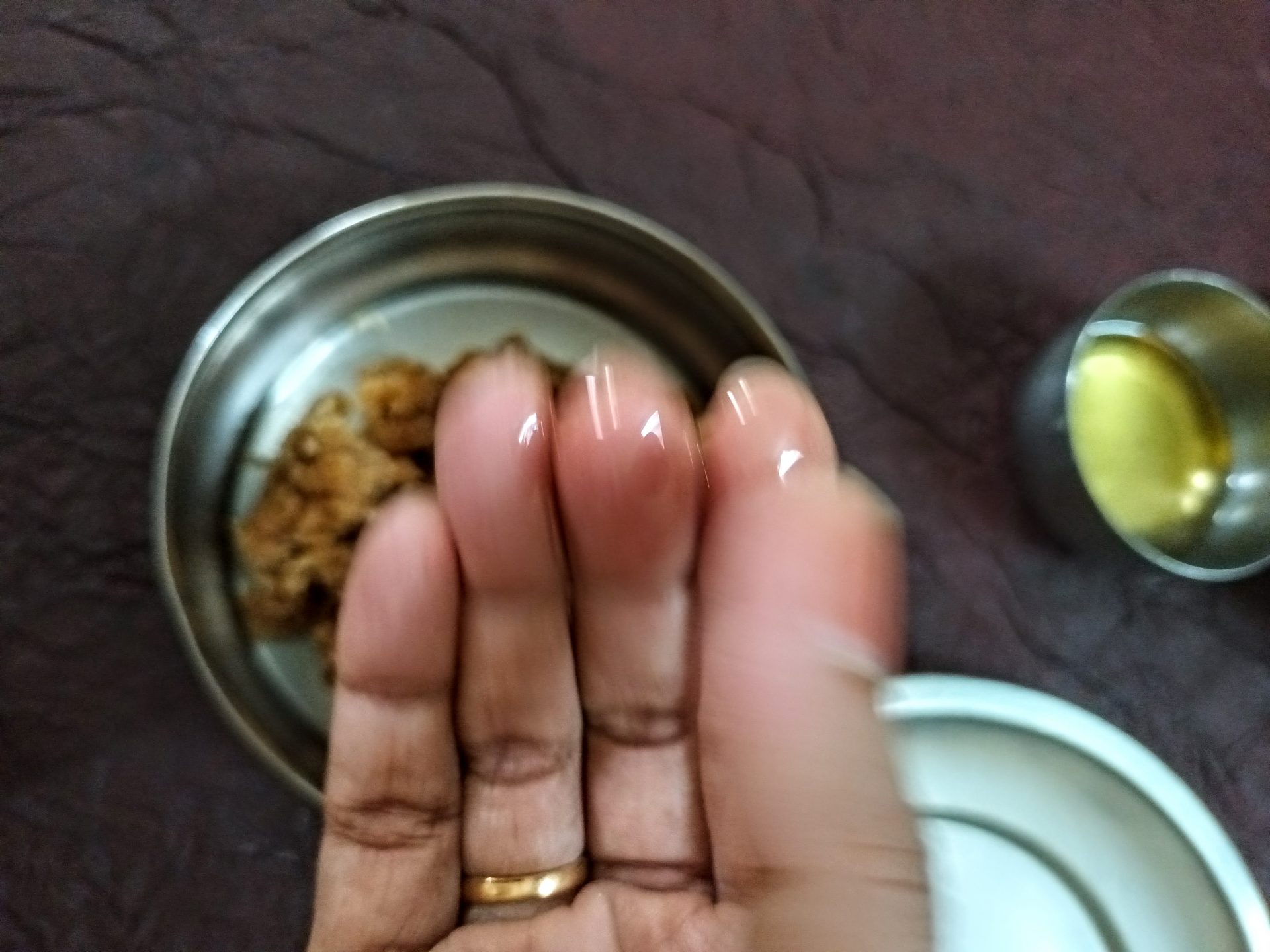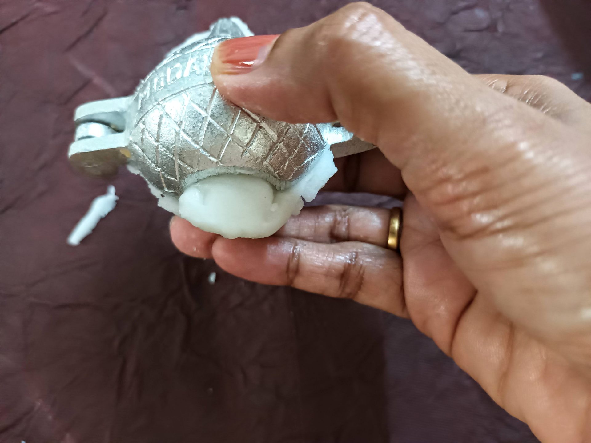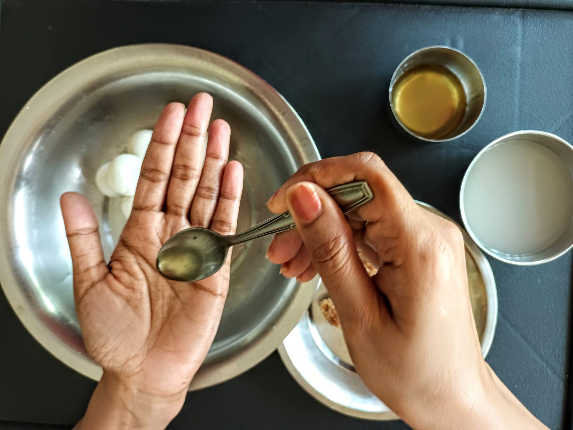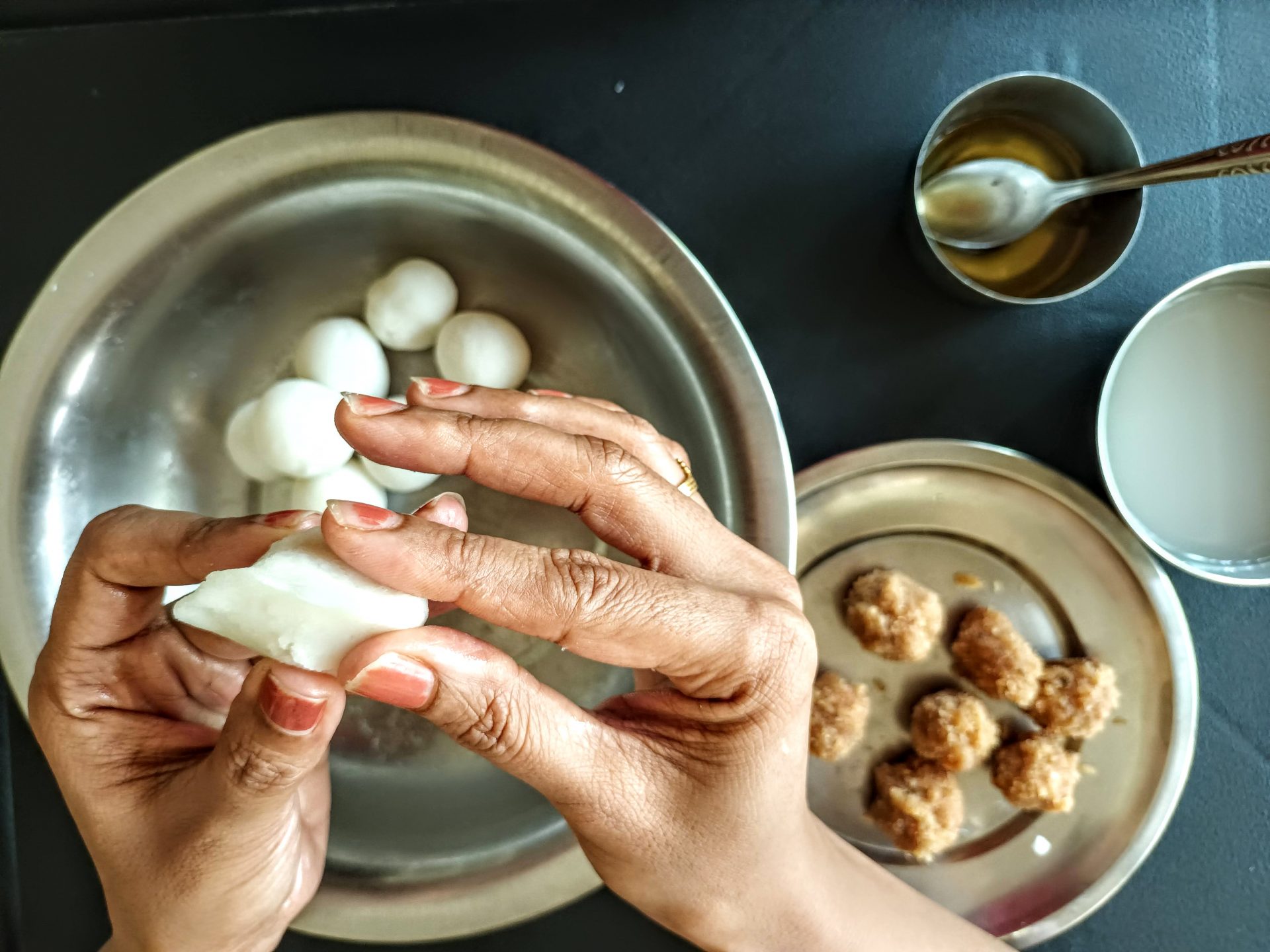 7. To Shape the Modaks with hand: Grease palms, pinch Lemon sized balls from the dough,and keep covered. Take one one ball at a time(ensure the dough is crack free and smooth), start by first flattening the outer edges with your thumb and index finger, as shown in the picture. Now with your thumb finger press the bulgy center part inwards,forming a well. Now widen then well and start giving the shape of a cup that is a little deep, so that the Purnam/filling fits comfortably. Now place the  coconut Purnam in the center.