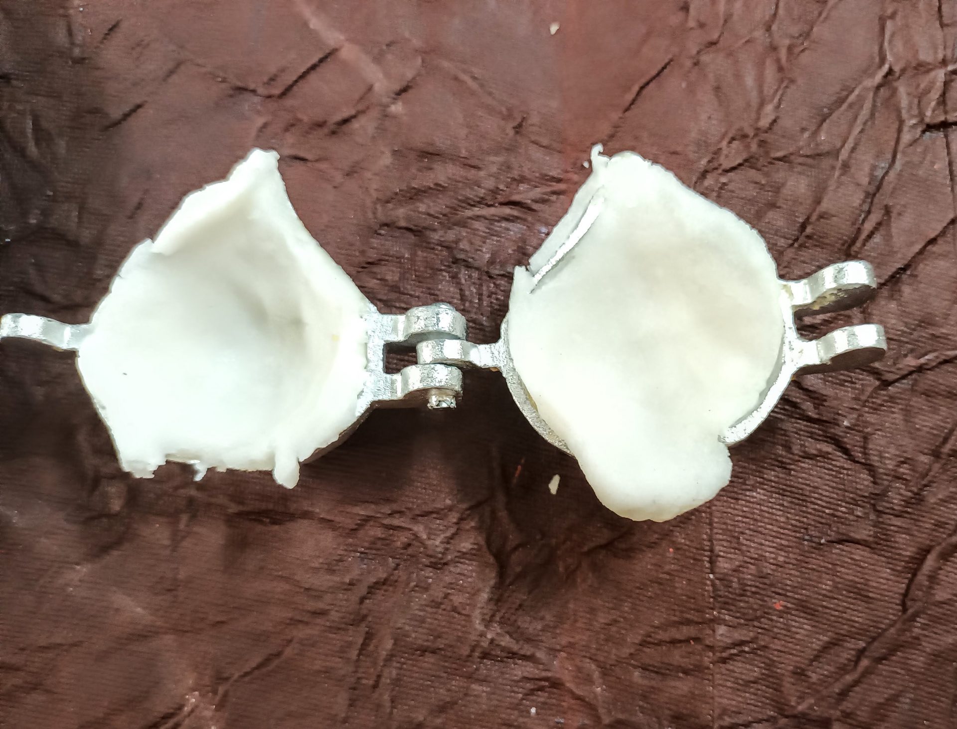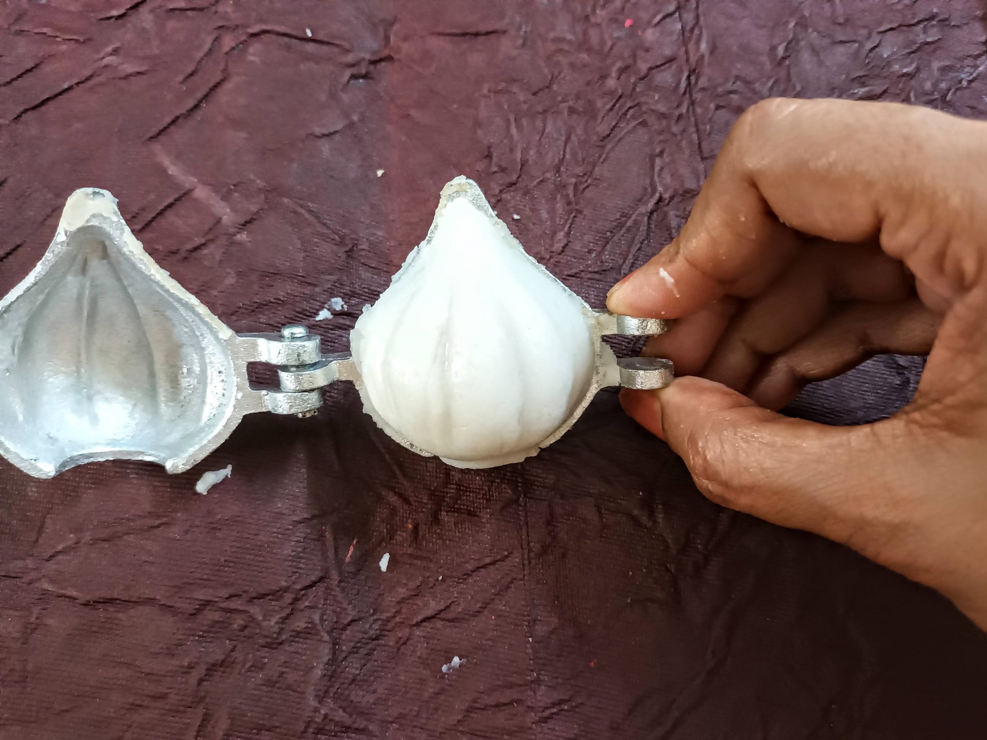 6. To shape the Modaks with mould: Grease palms with sesame oil. Pinch small portions and make Gooseberry sized balls from the dough. Grease both sides of the mould with oil nicely. Now take one ball,and flatten it. Fit it into one half of the mould. Repeat,and spread the dough into the other half of the mould also. Now take the stuffing, and place it in the center of one side of the mould, close the mould to bring the sides together. With the dough overhang seal the bottom portion also. Now open the mould, and remove the modak gently. Check for any gaps,and seal them. Repeat for the entire dough. Get the steamer or cooker ready, and steam the Modaks for 10-12 minutes.