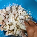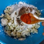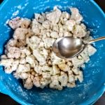 - Now add the Refined flour/maida, corn flour, salt, pepper powder, and red chilli powder, to the florets and mix them well using your fingers. Now add water teaspoon by teaspoon, so that the flour sticks well to the florets. I used about 4 teaspoons of water.