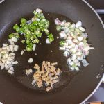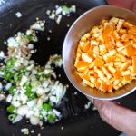 - Take the corn flour in a cup and add cold water to it, mix and make a slurry, and keep it aside. Now Take Olive oil/ refined oil in a Pan and heat. Add the garlic, ginger, green chillies, spring onion and greens, the Orange rind julienne, retaining about 2 tsp for garnish. Saute on high heat for a minute. Remove it onto a plate and set aside.