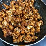 - Drop the fried/baked cauliflower florets into the sauce and mix well, such that the florets are well coated by the sauce. Now add the sauteed onion-garlic-chilli , to the cauliflower, and give it all a goof mix. Garnish with reserved Orange rind,and serve.