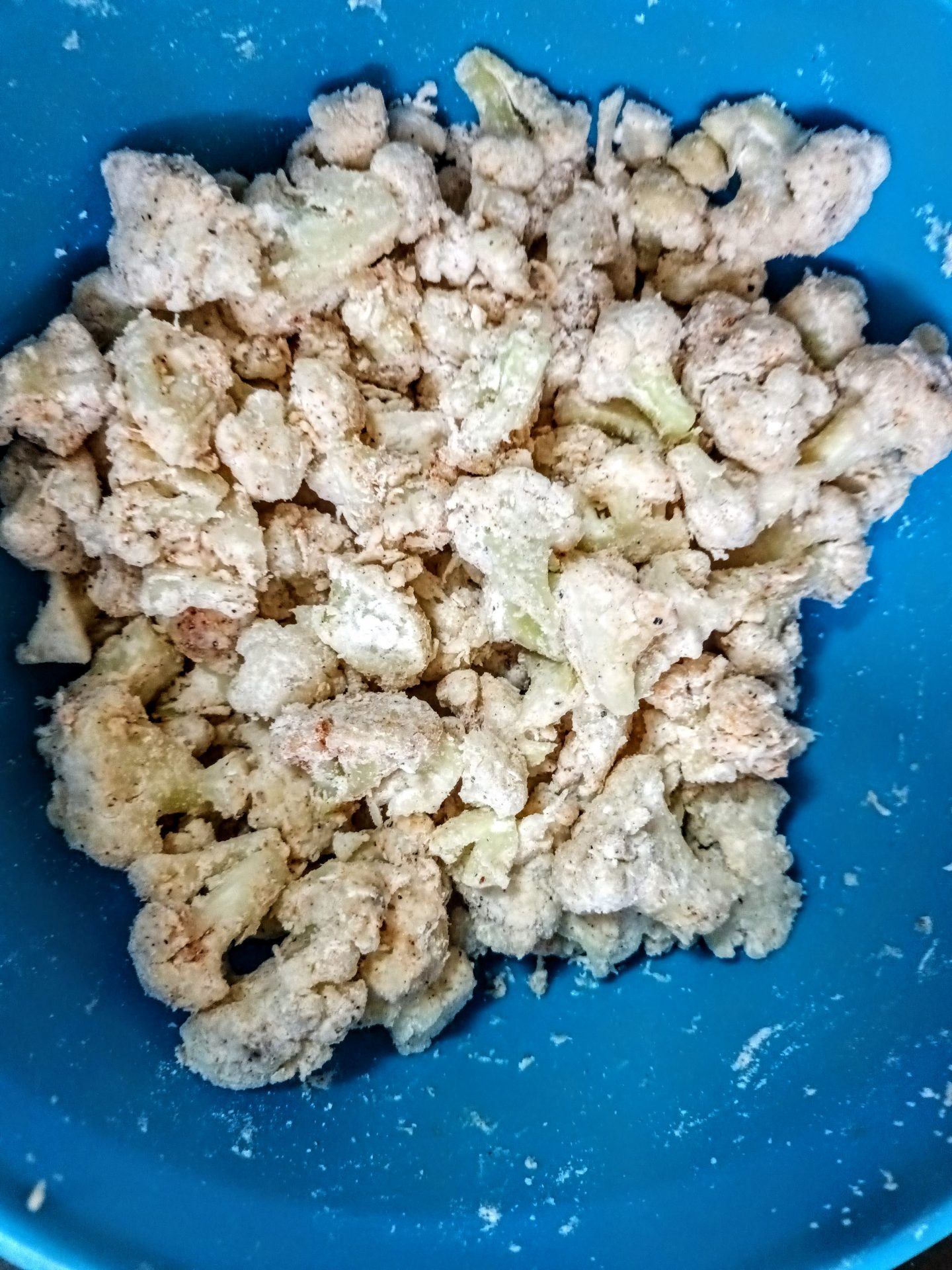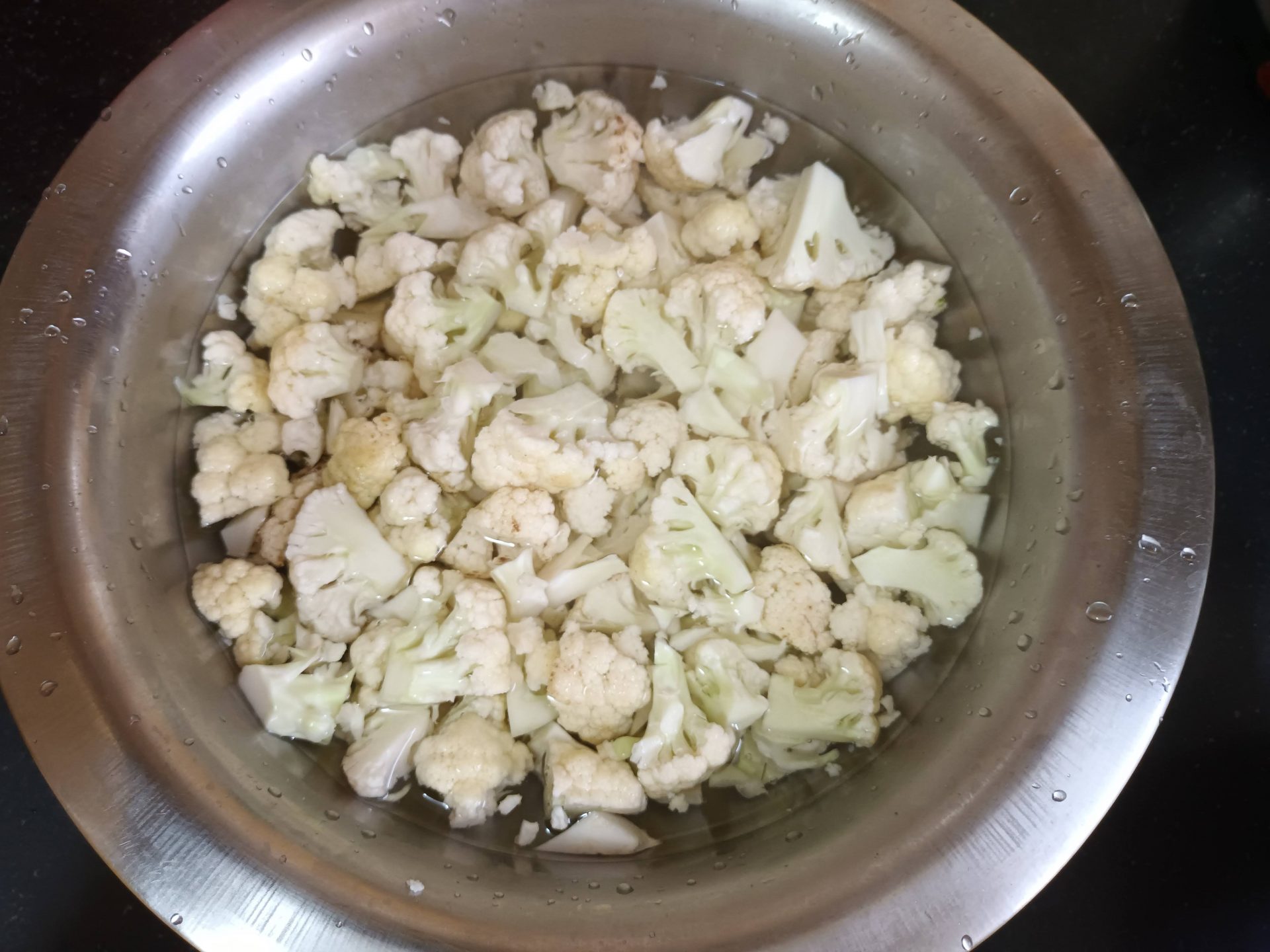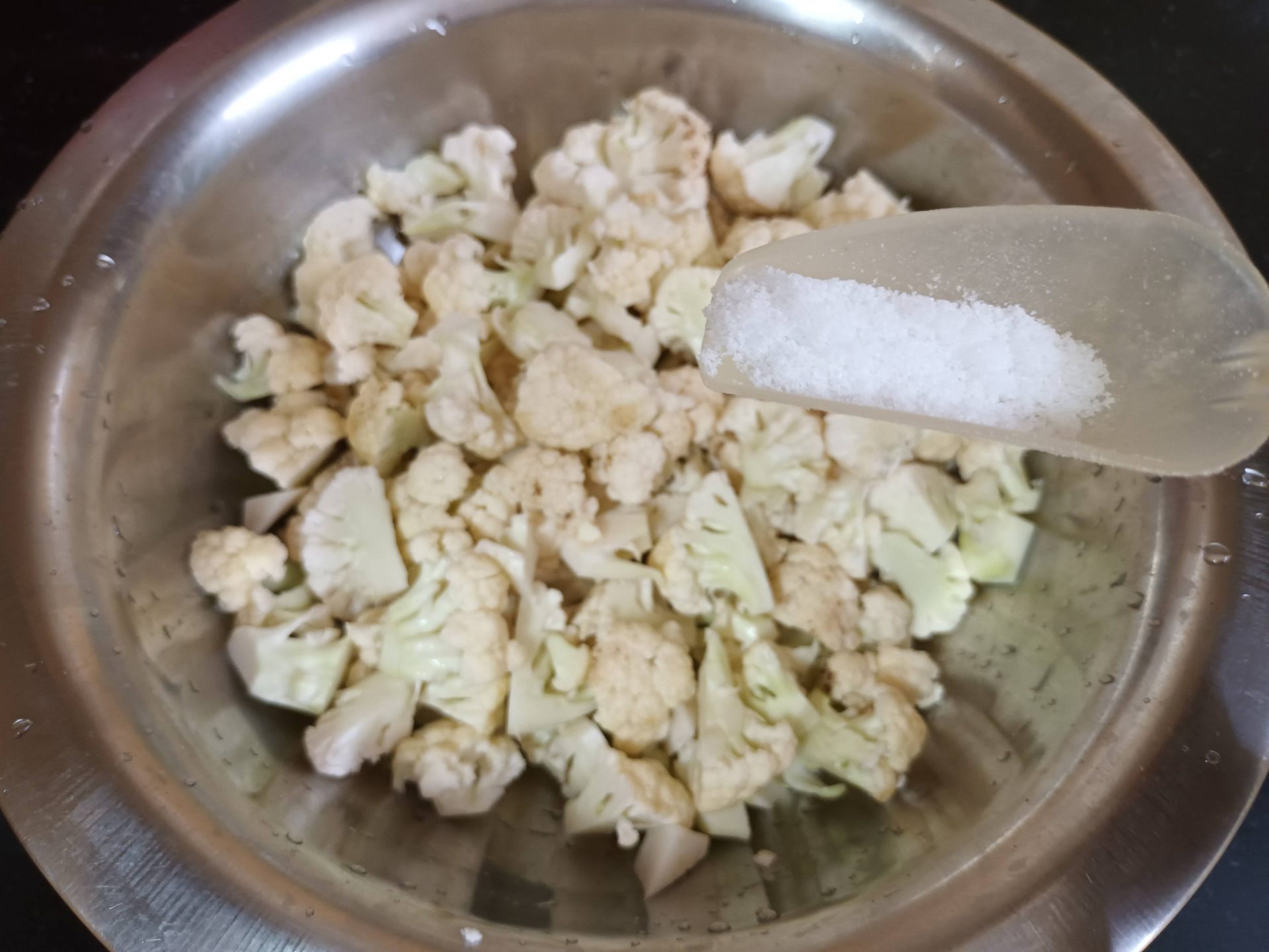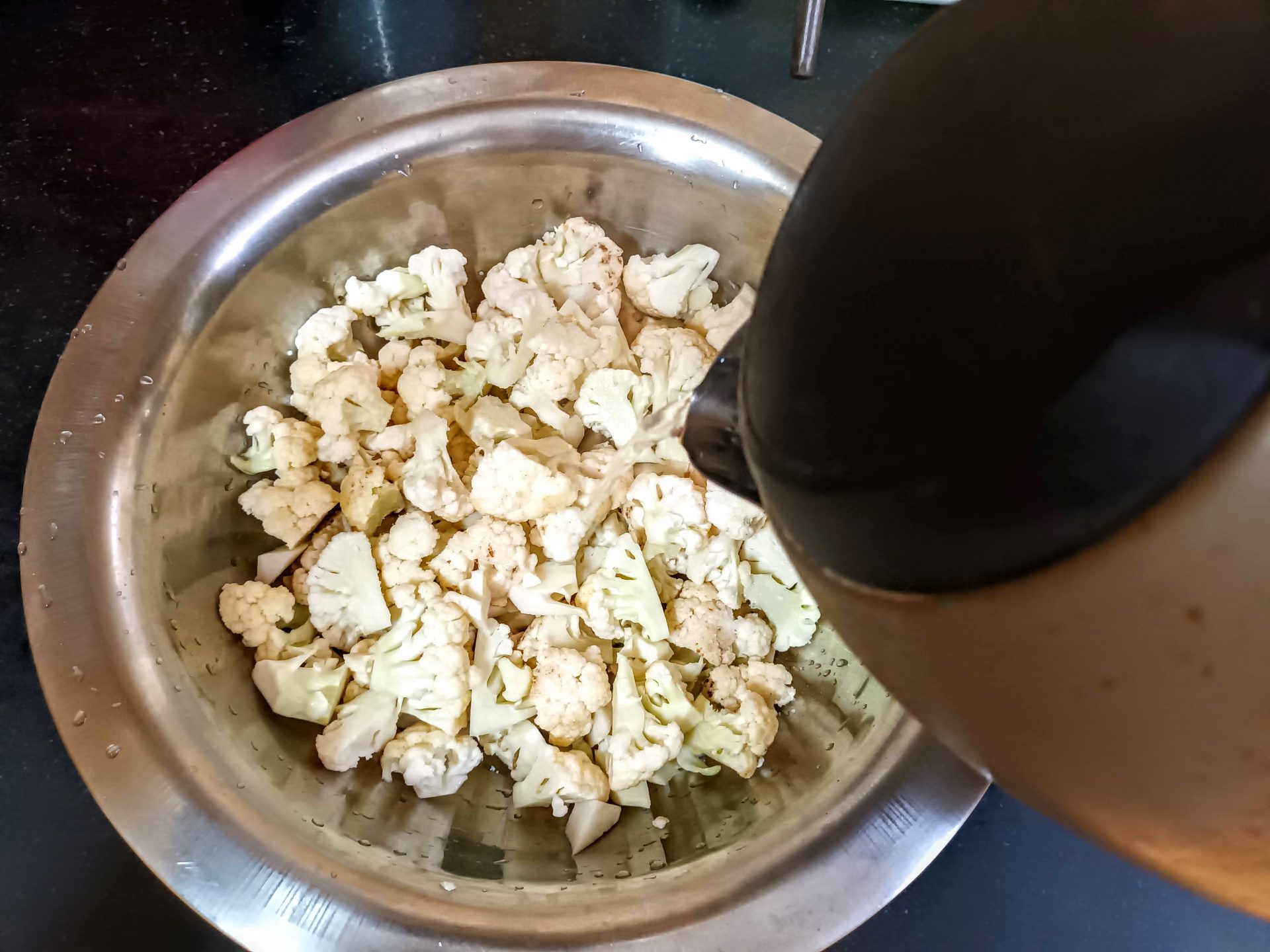 - Chop the cauliflower to florets, pour boiling water over them, add 1/2 tsp salt,and keep it covered for 10 minutes. After 10 minutes drain water and let the florets cool down.