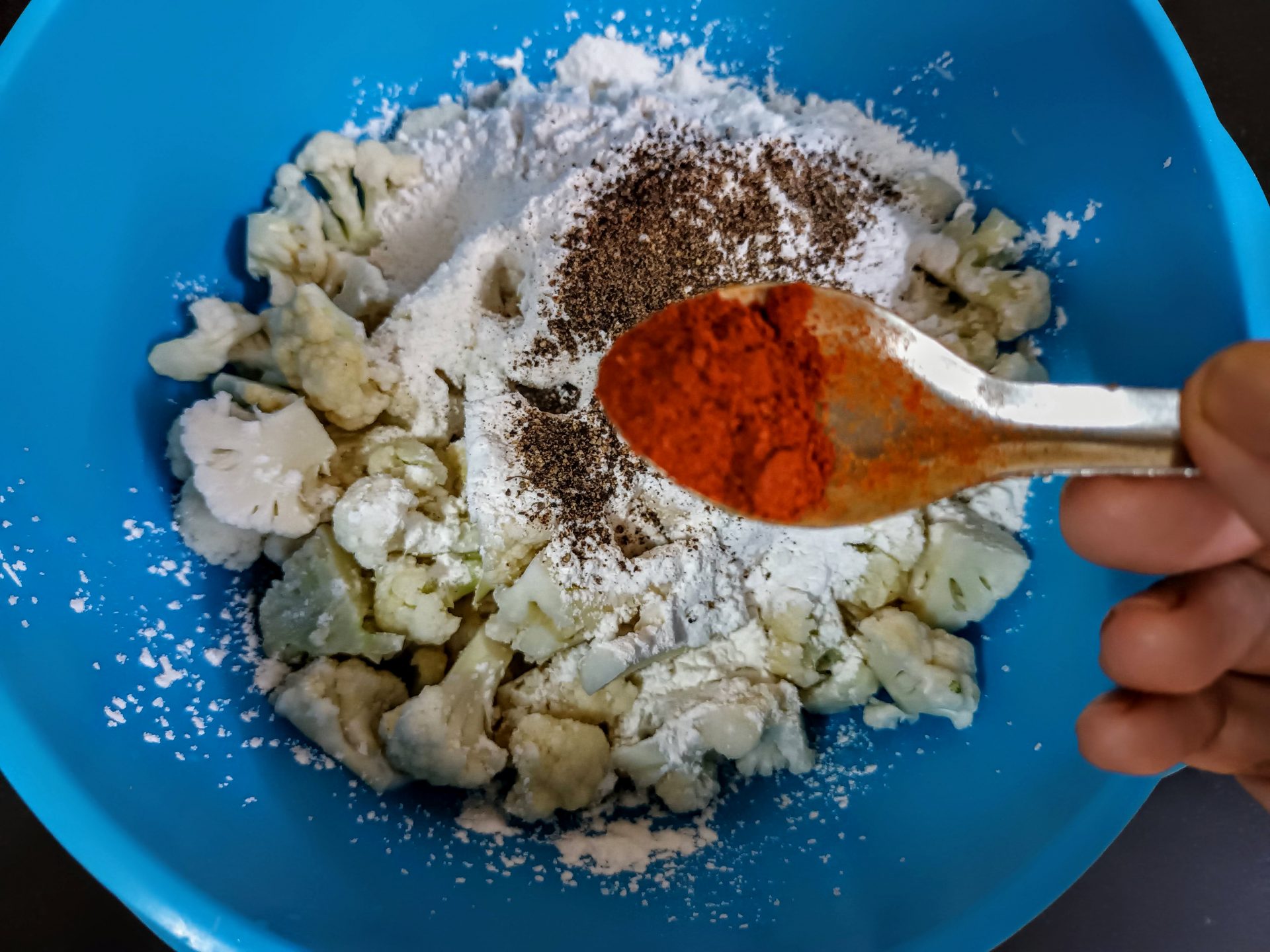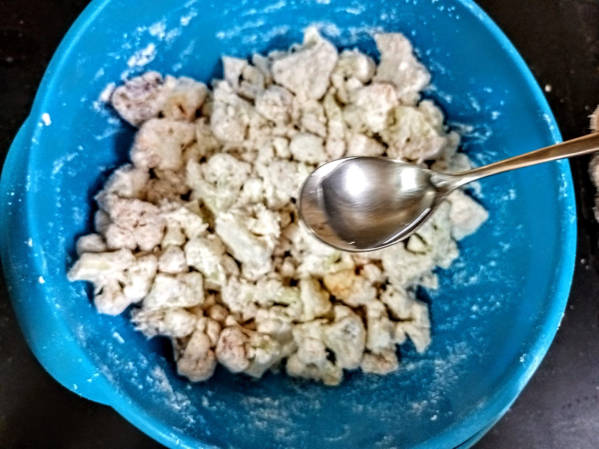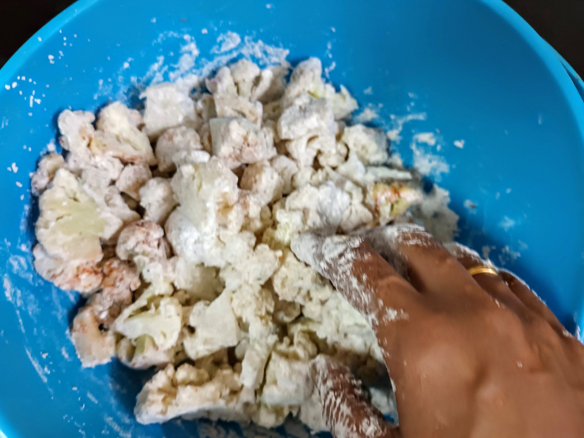- Now add the Refined flour/maida, corn flour, salt, pepper powder, and red chilli powder, to the florets and mix them well using your fingers. Now add water teaspoon by teaspoon, so that the flour sticks well to the florets. I used about 4 teaspoons of water.