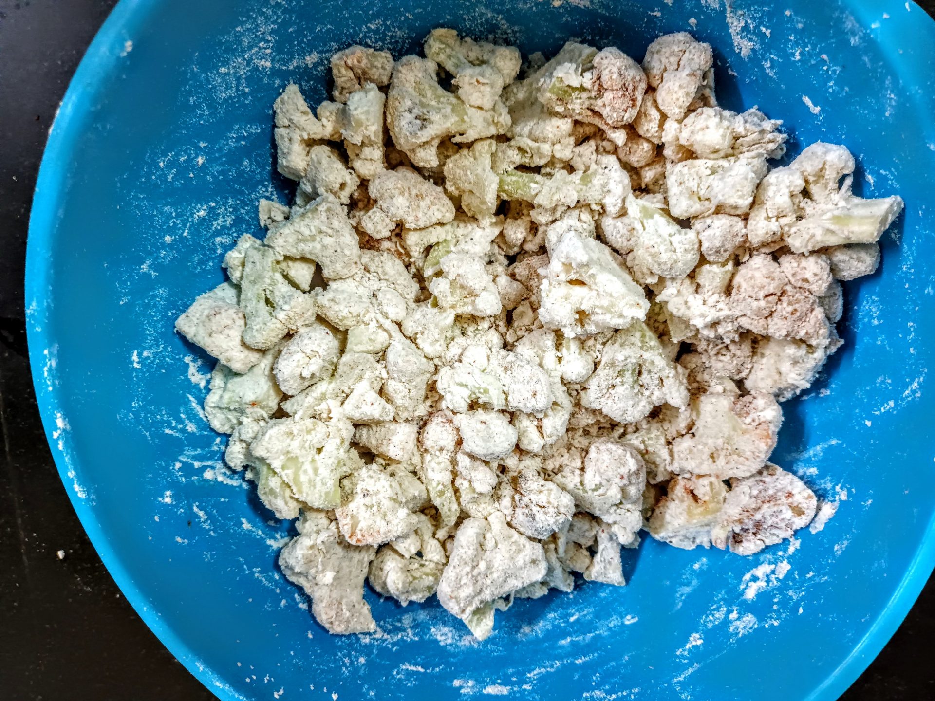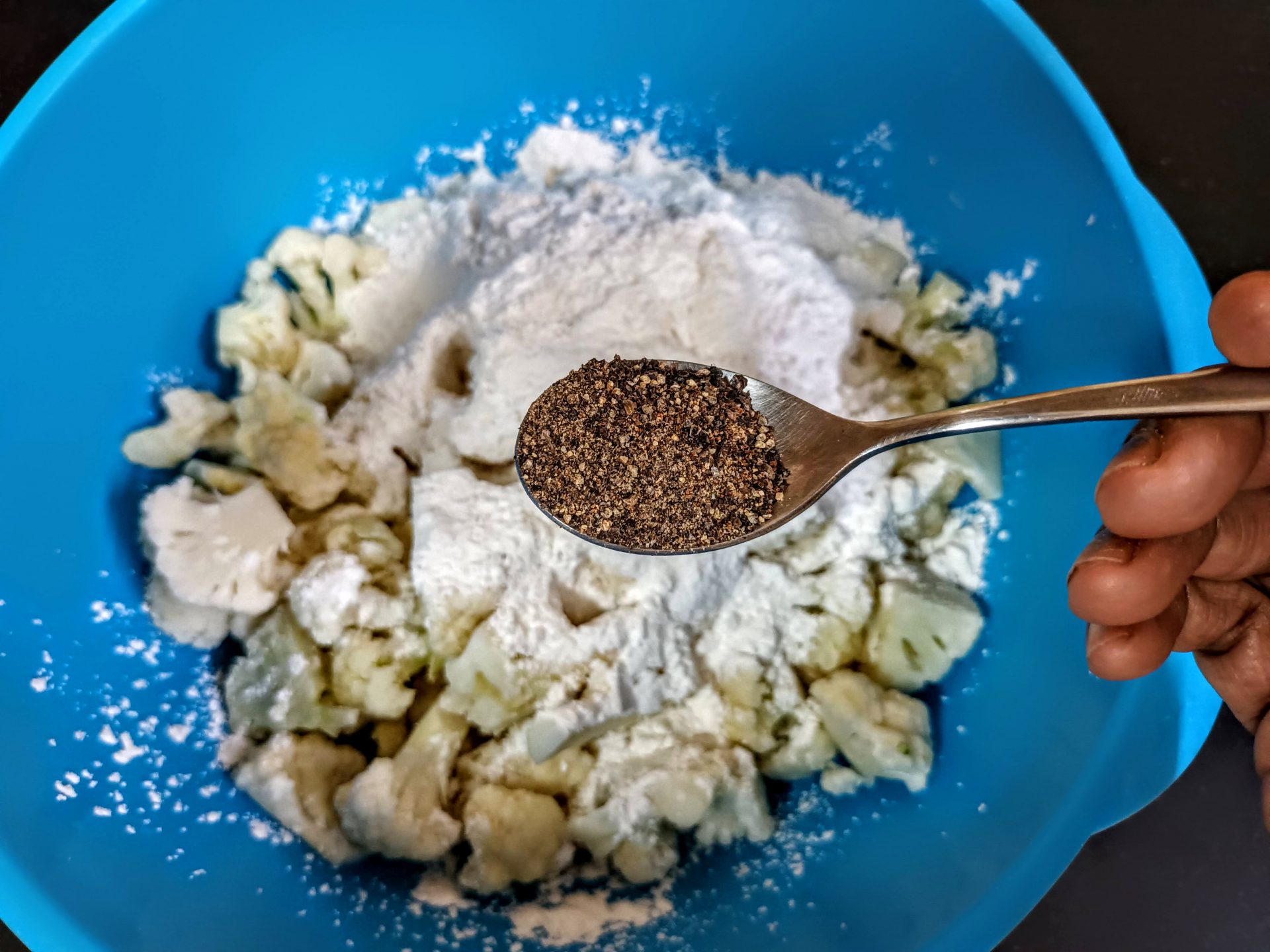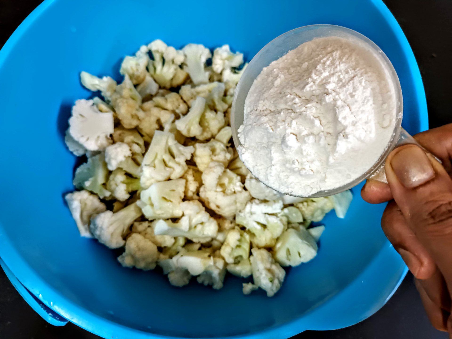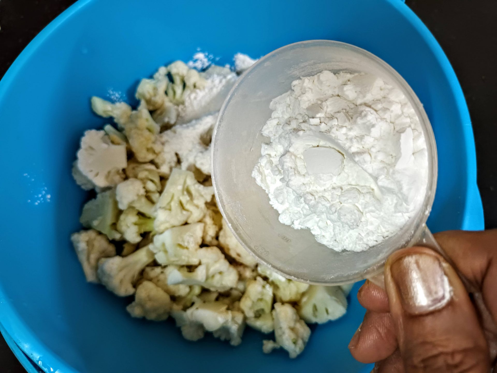 - Now add the Refined flour/maida, corn flour, salt, pepper powder, and red chilli powder, to the florets and mix them well using your fingers. Now add water teaspoon by teaspoon, so that the flour sticks well to the florets. I used about 4 teaspoons of water.