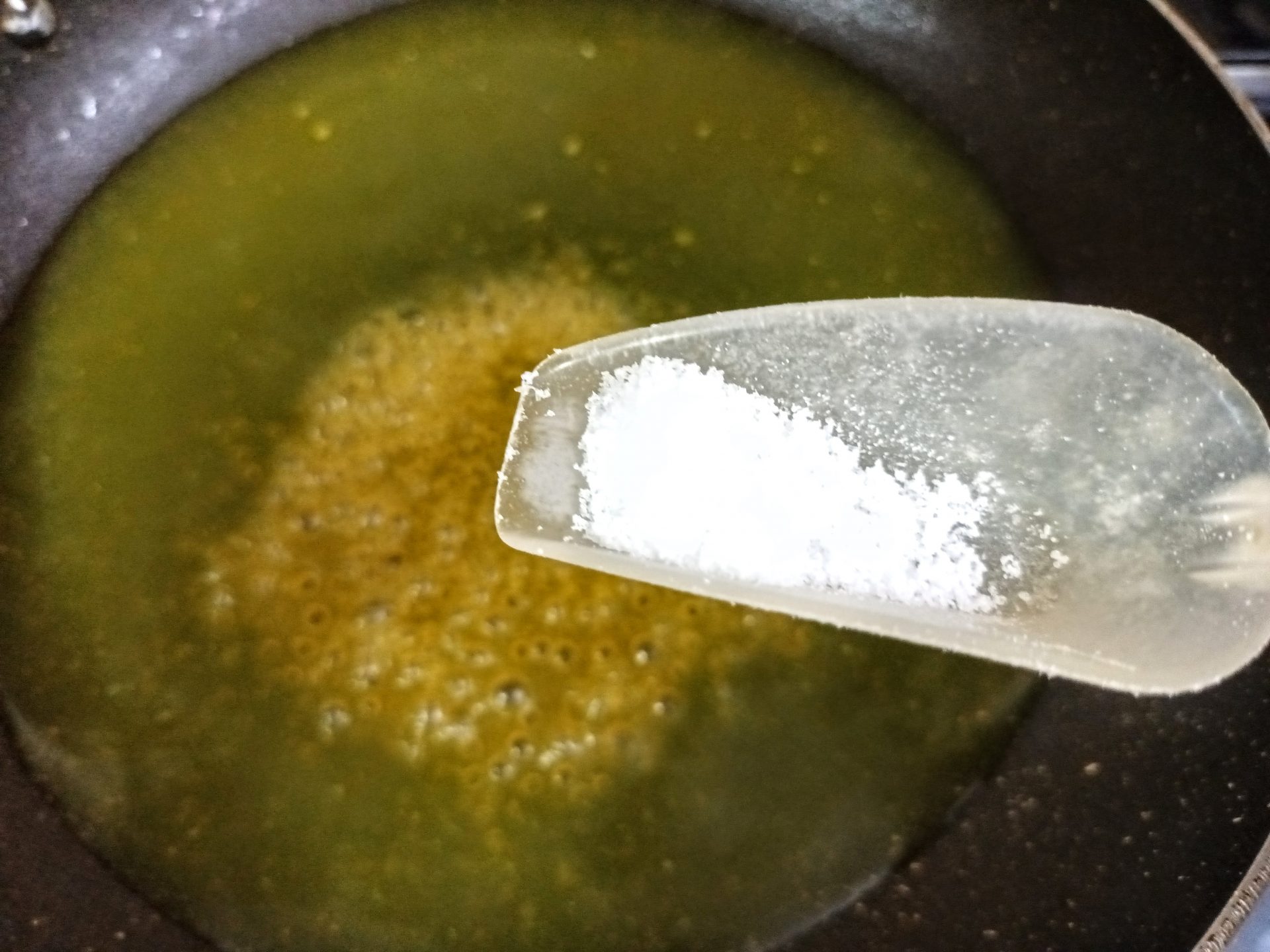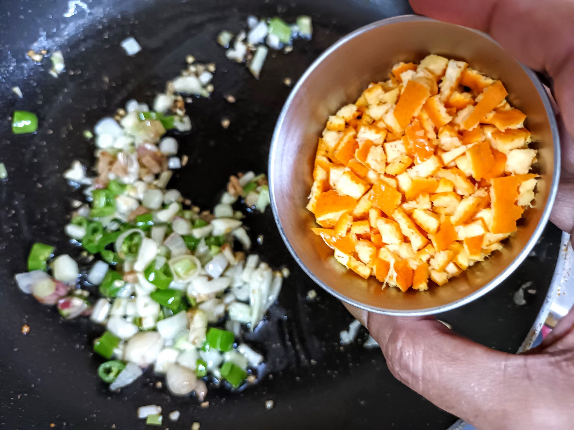 - Take the corn flour in a cup and add cold water to it, mix and make a slurry, and keep it aside. Now Take Olive oil/ refined oil in a Pan and heat. Add the garlic, ginger, green chillies, spring onion and greens, the Orange rind julienne, retaining about 2 tsp for garnish. Saute on high heat for a minute. Remove it onto a plate and set aside.