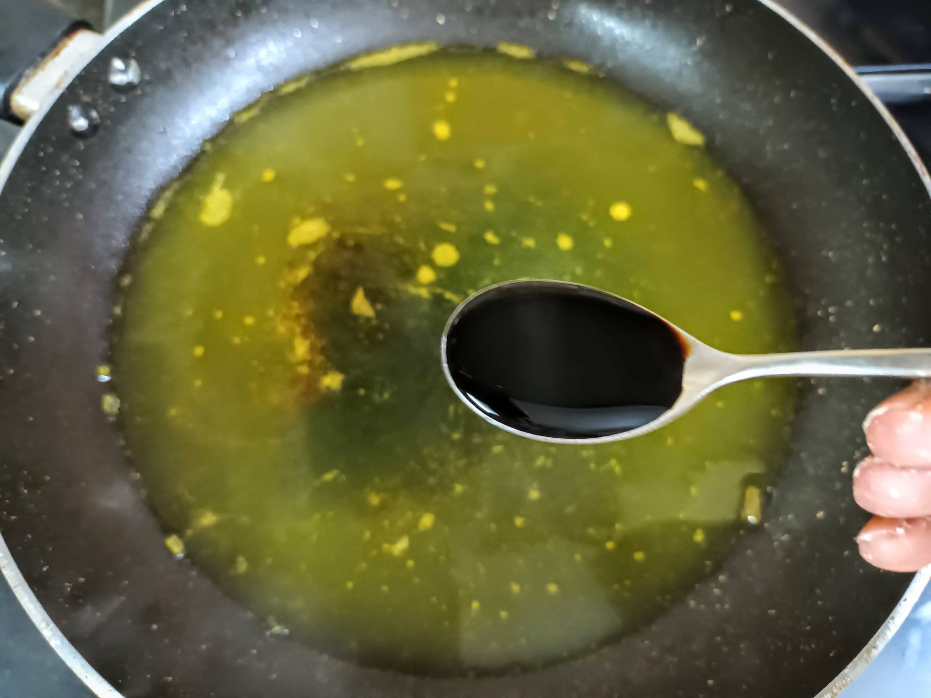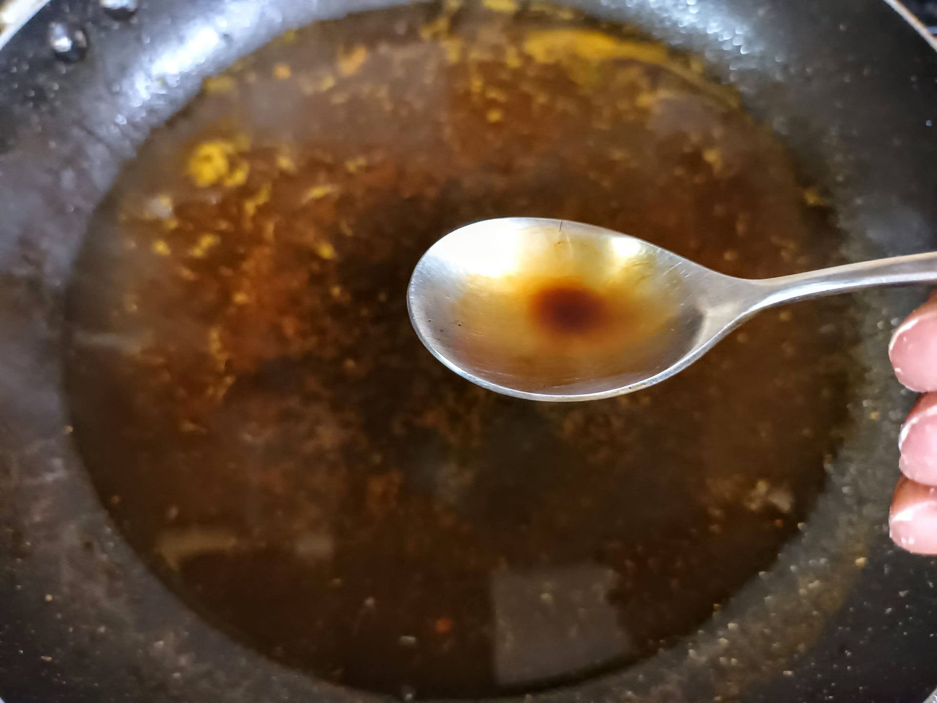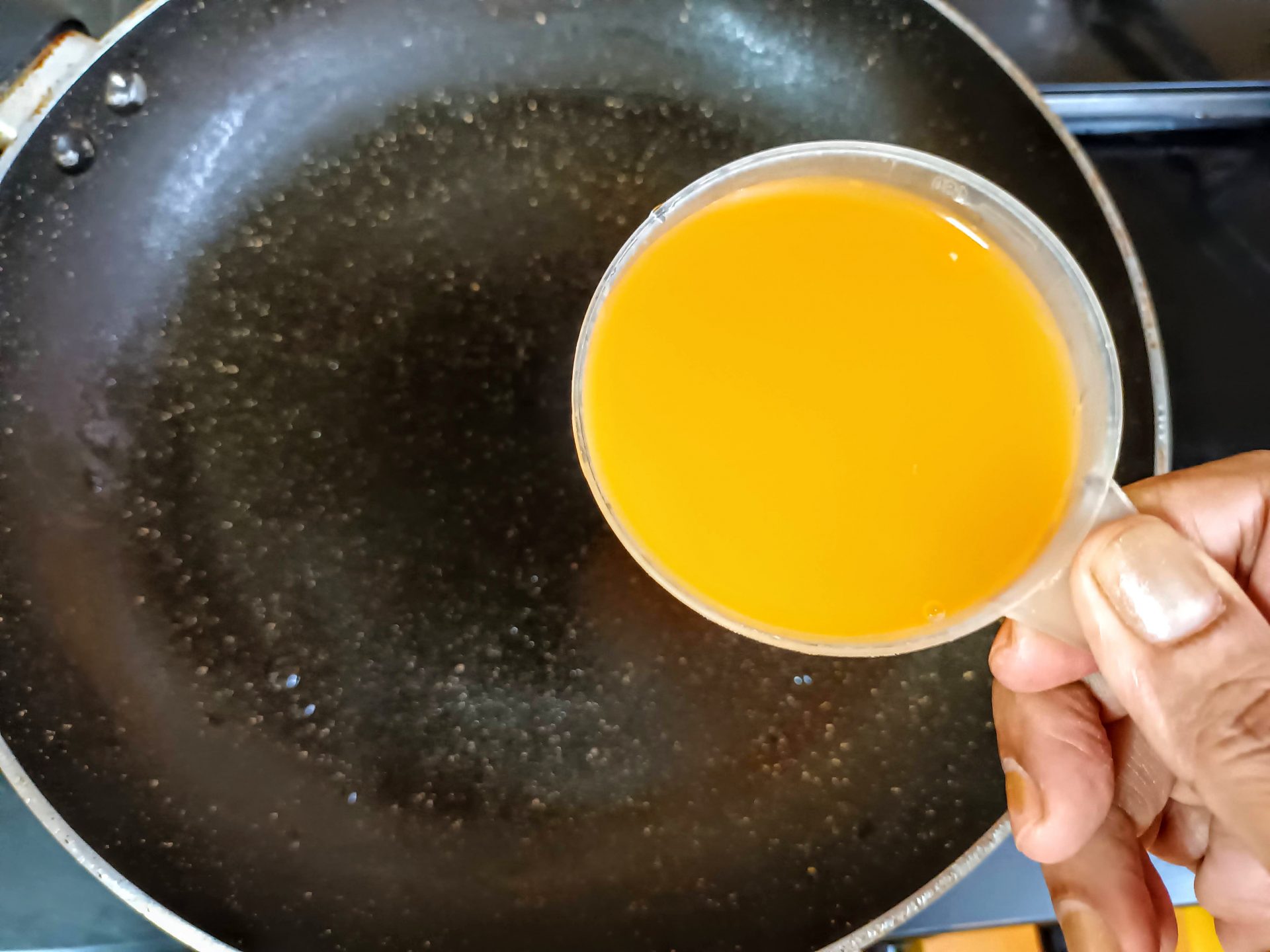 - Now to the same pan add 1 cup of the Orange juice, and bring it to a boil. Add salt, Soy Sauce, Red Chilli sauce (or a mix of 2 tbsp Red chilli sauce plus 1 tbsp of Schezwan sauce/chutney), Apple Cider Vinegar, and mix well.