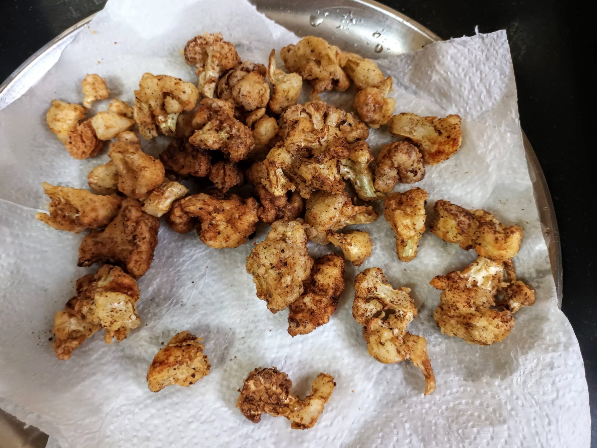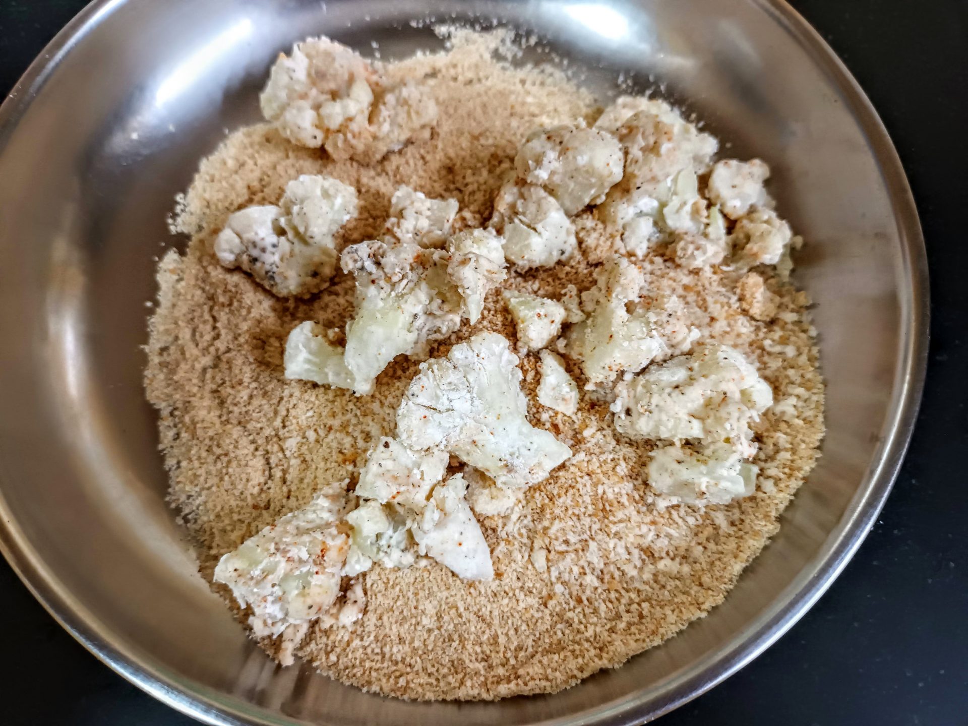 - Now take one floret at a time, roll it on the bread crumbs and drop it gently into hot oil, and deep fry. Drain on absorbent paper. Alternately arrange the florets on a baking tray lined with greased butter paper, and bake at 200 C for 15 minutes, or until the cauliflowers turn a light brown.