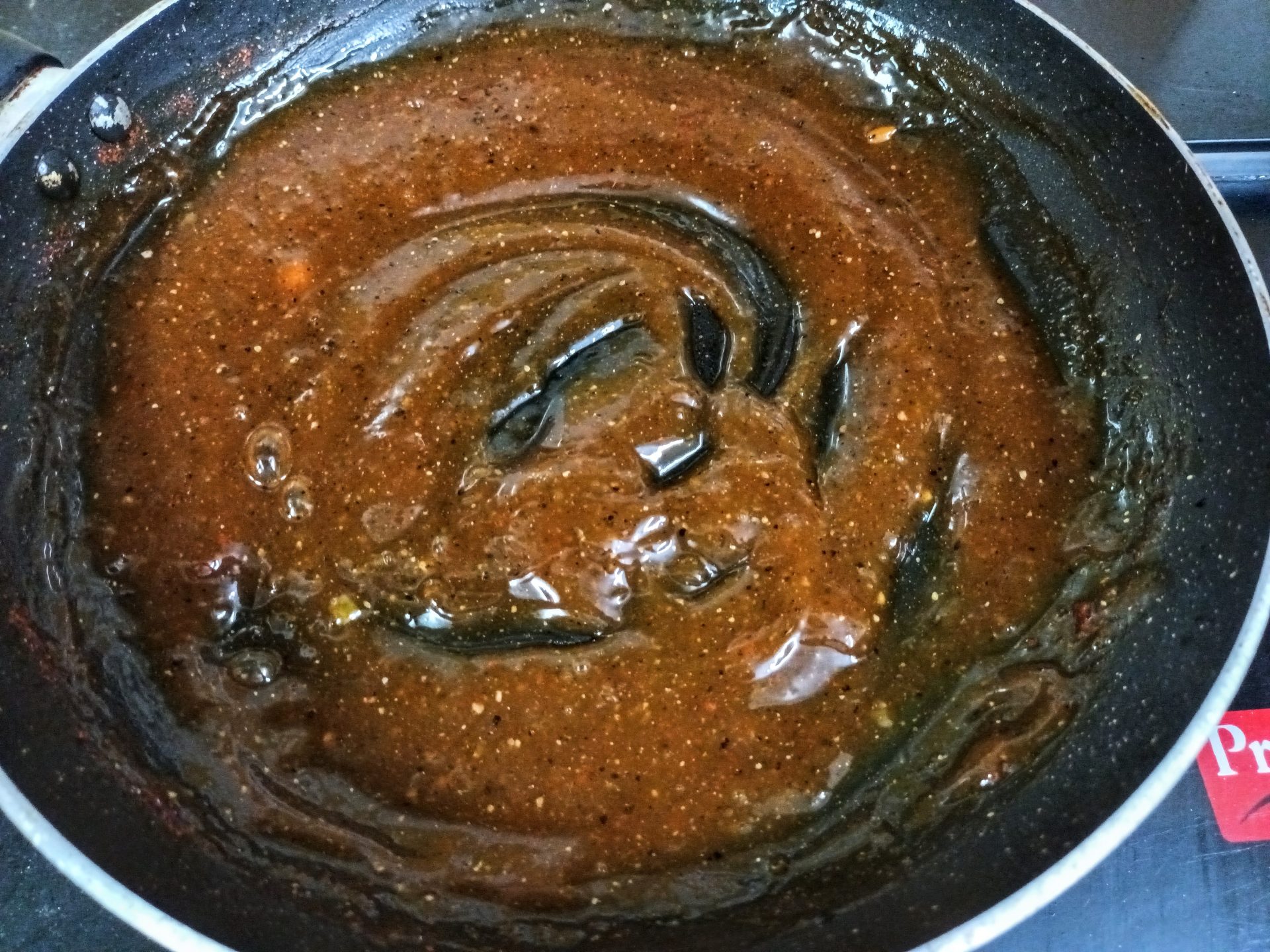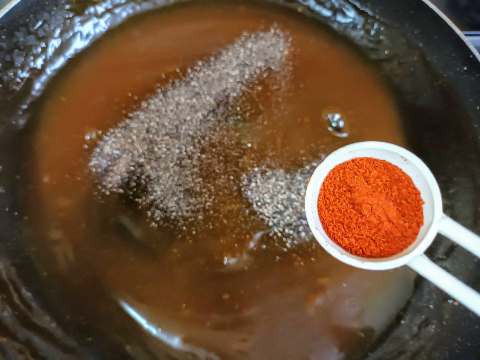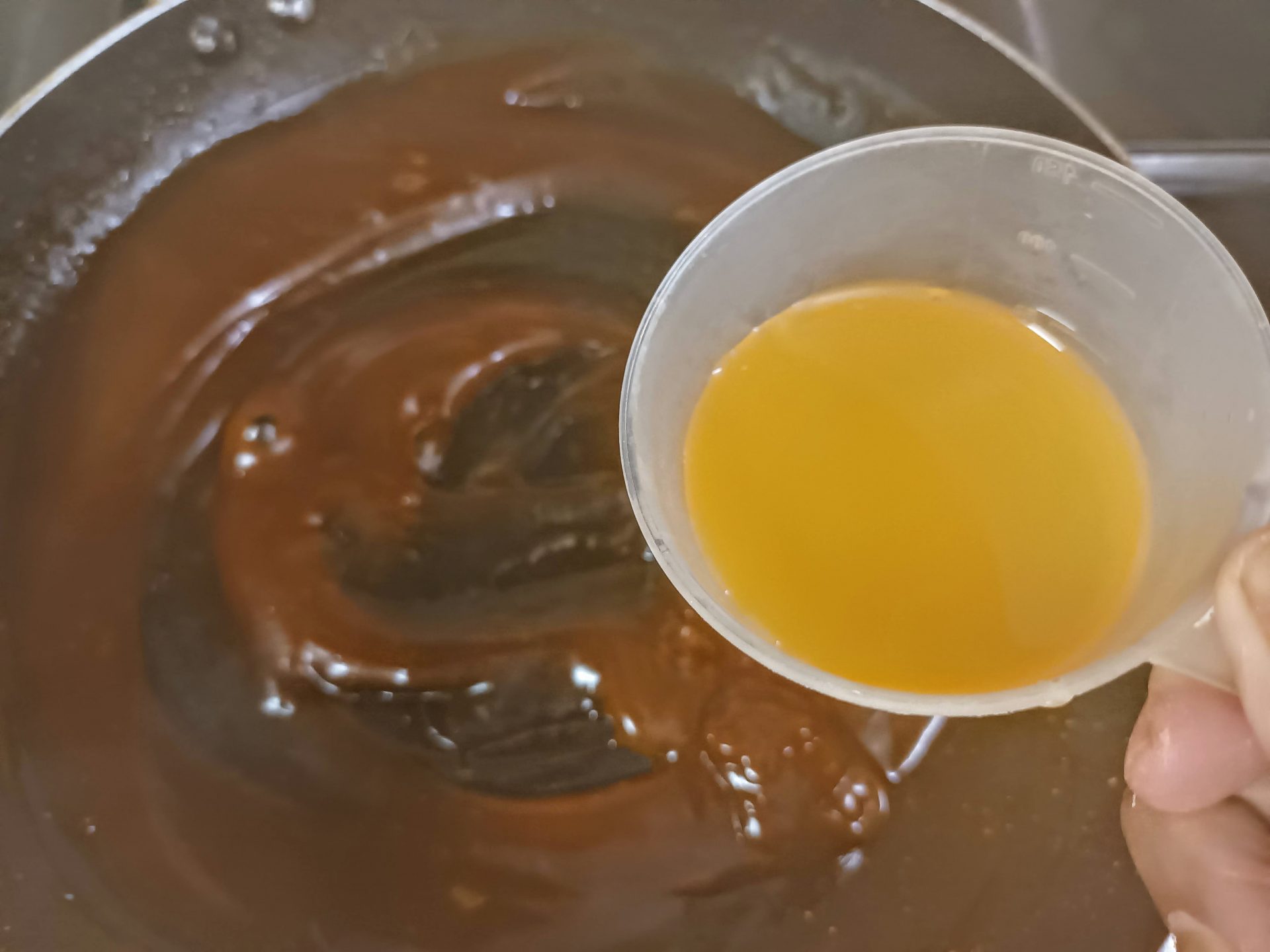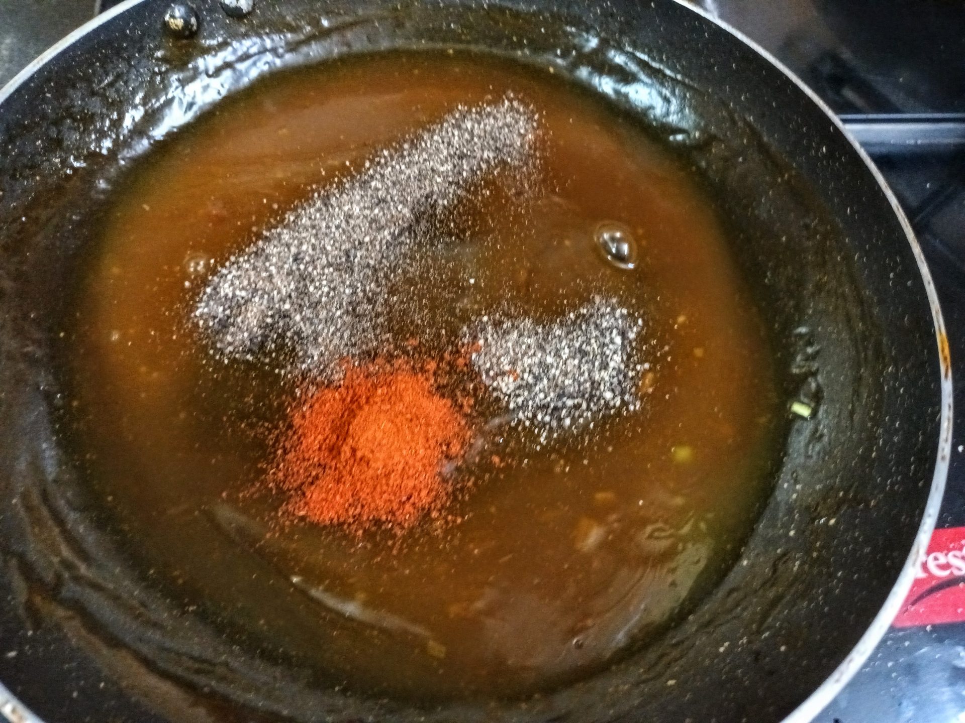 - Now stir the cornflour plus water mixture and add it to the pan gradually, stirring simultaneously. Keep stirring, until the mixture turns a little white and then pale and glossy. Now add about 1/2 cup or less of Orange juice to adjust consistency to your choice(check notes). Finally, add red chilli powder, and pepper powder,and stir well(check notes).