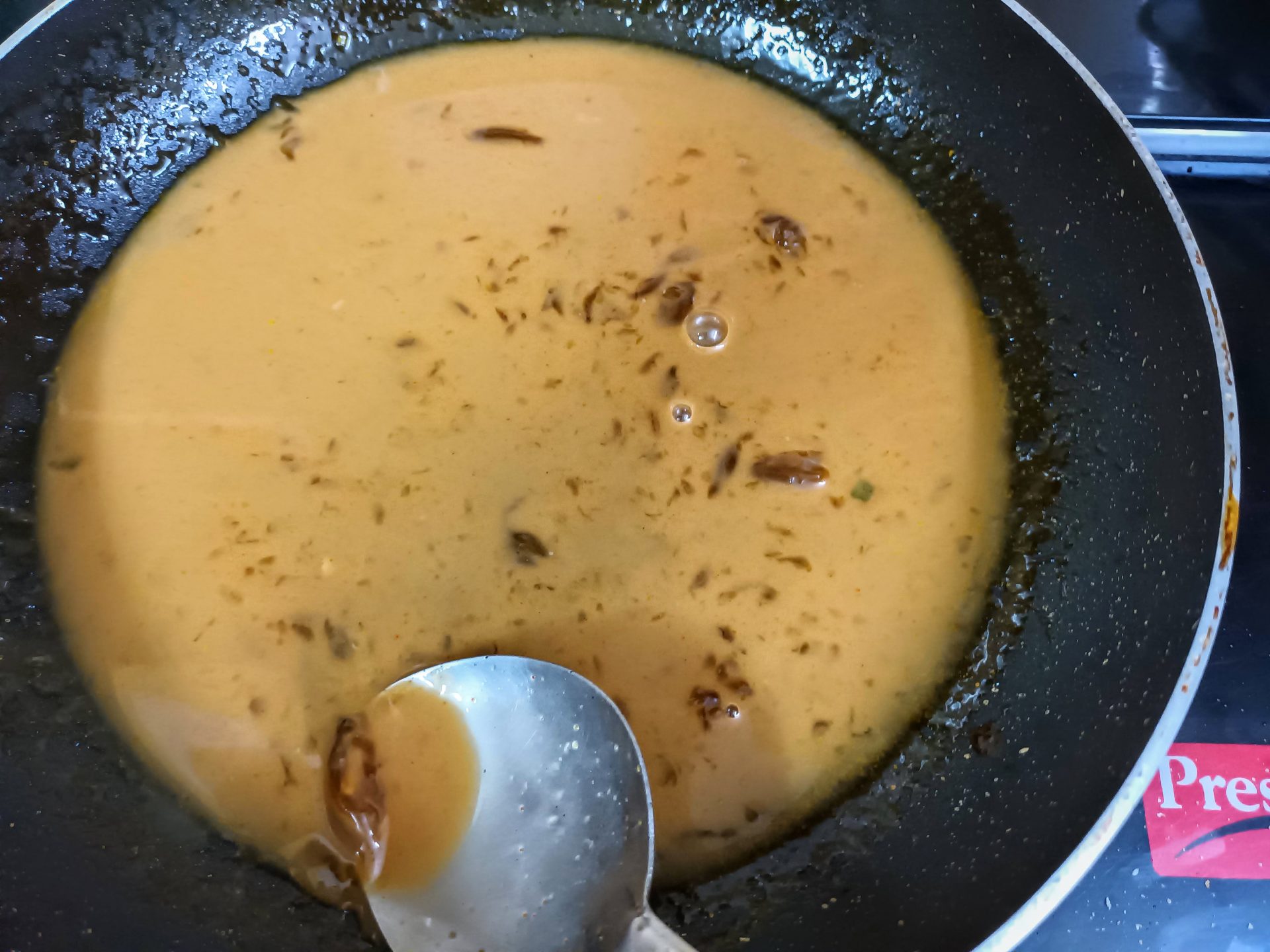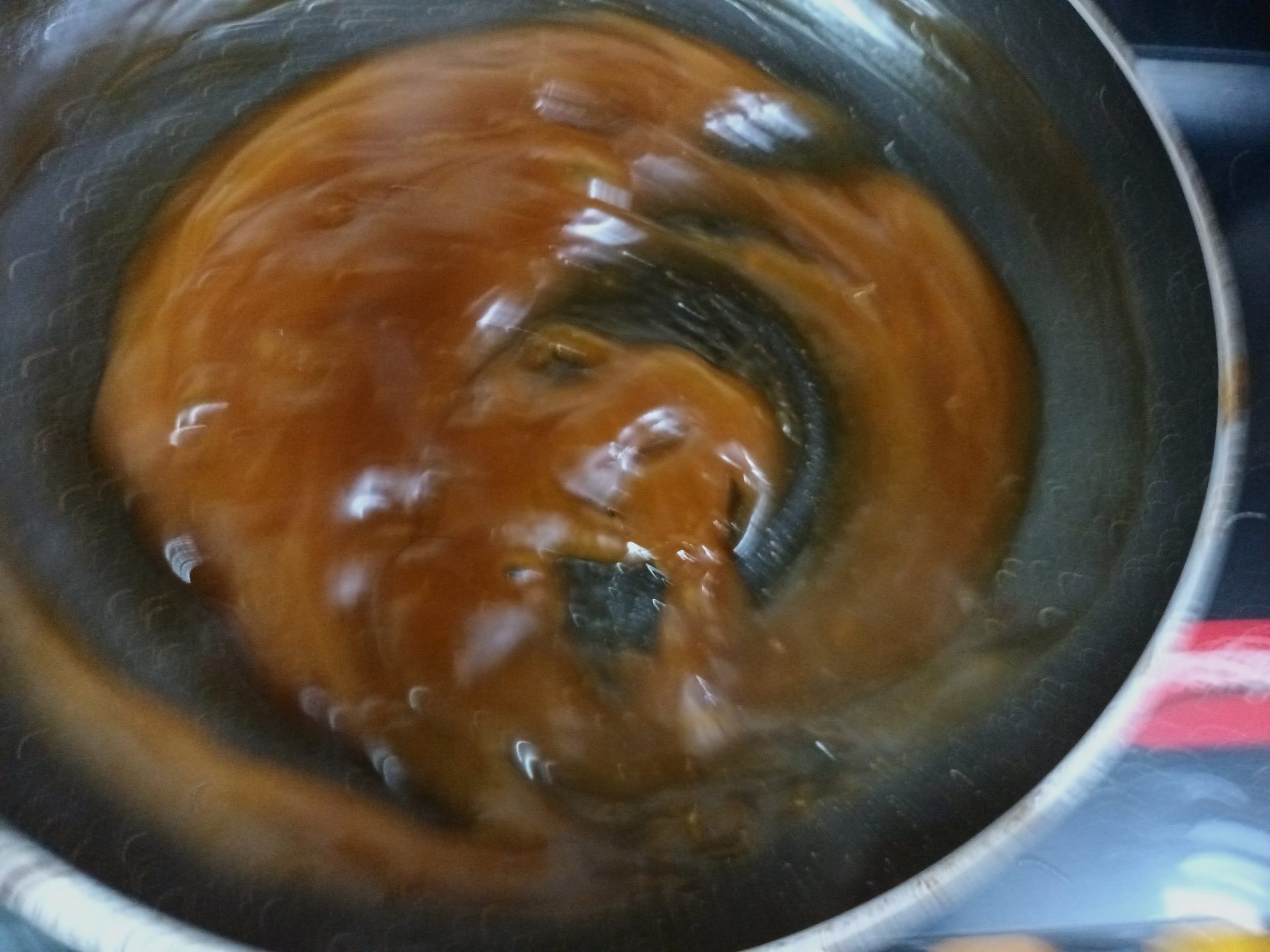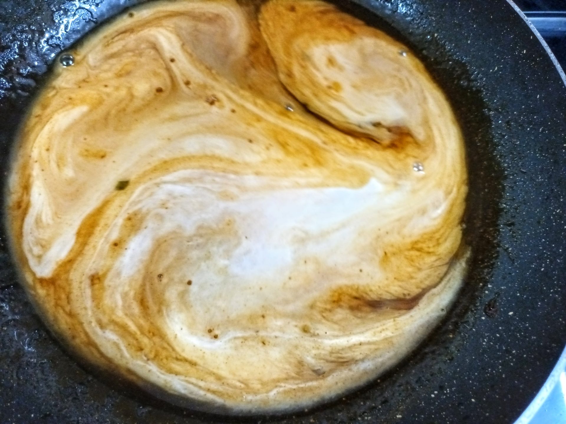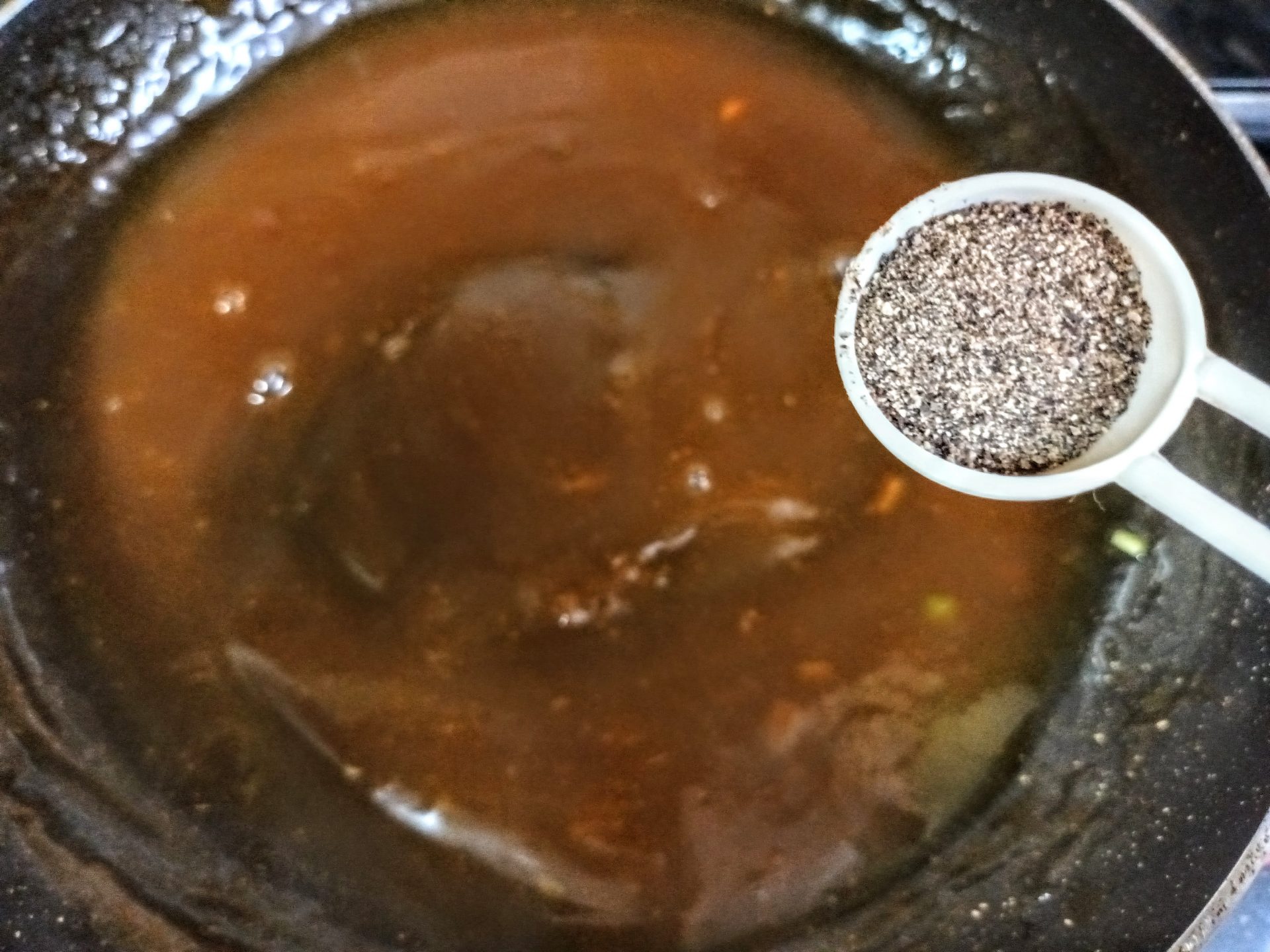 - Now stir the cornflour plus water mixture and add it to the pan gradually, stirring simultaneously. Keep stirring, until the mixture turns a little white and then pale and glossy. Now add about 1/2 cup or less of Orange juice to adjust consistency to your choice(check notes). Finally, add red chilli powder, and pepper powder,and stir well(check notes).