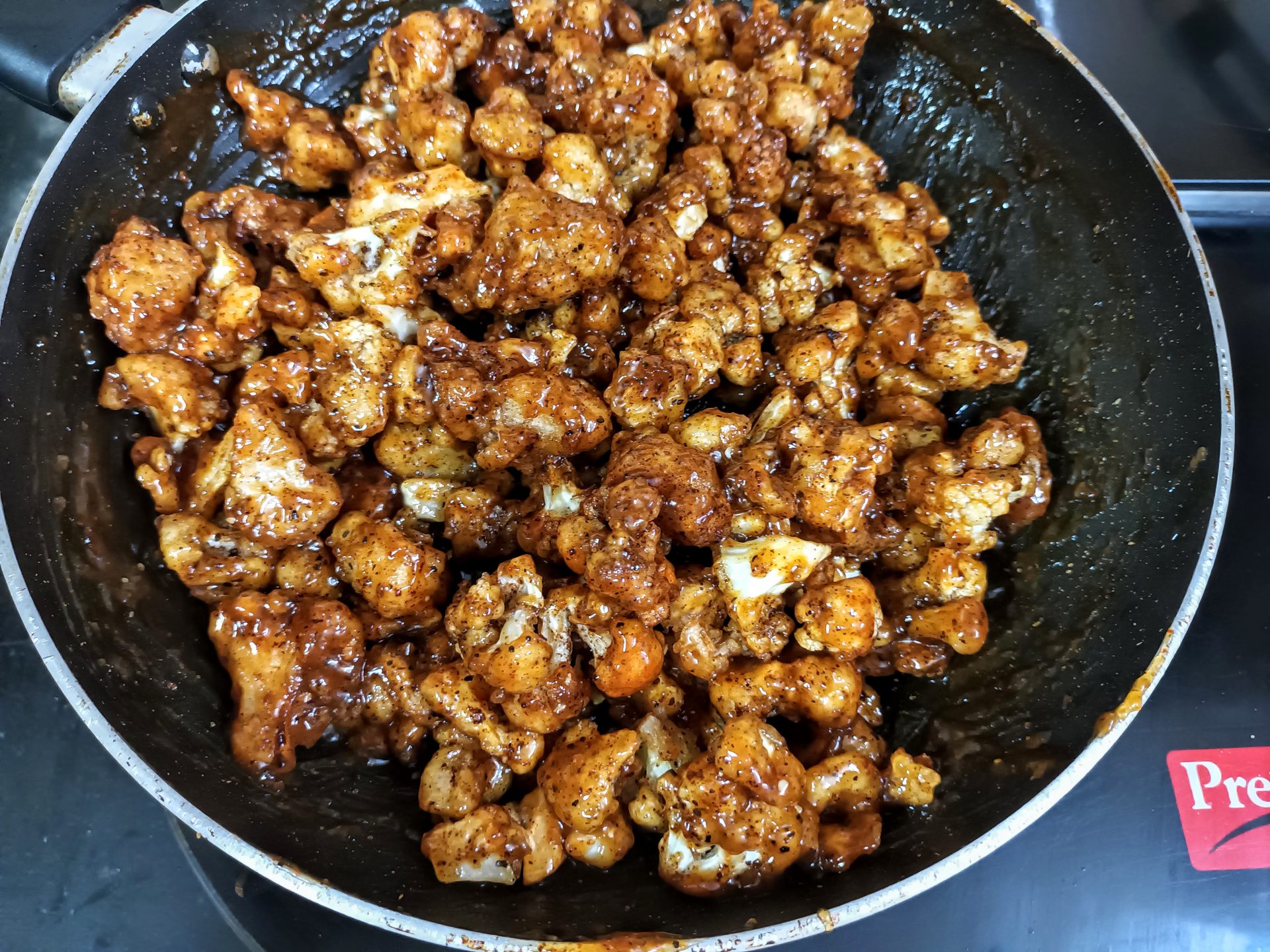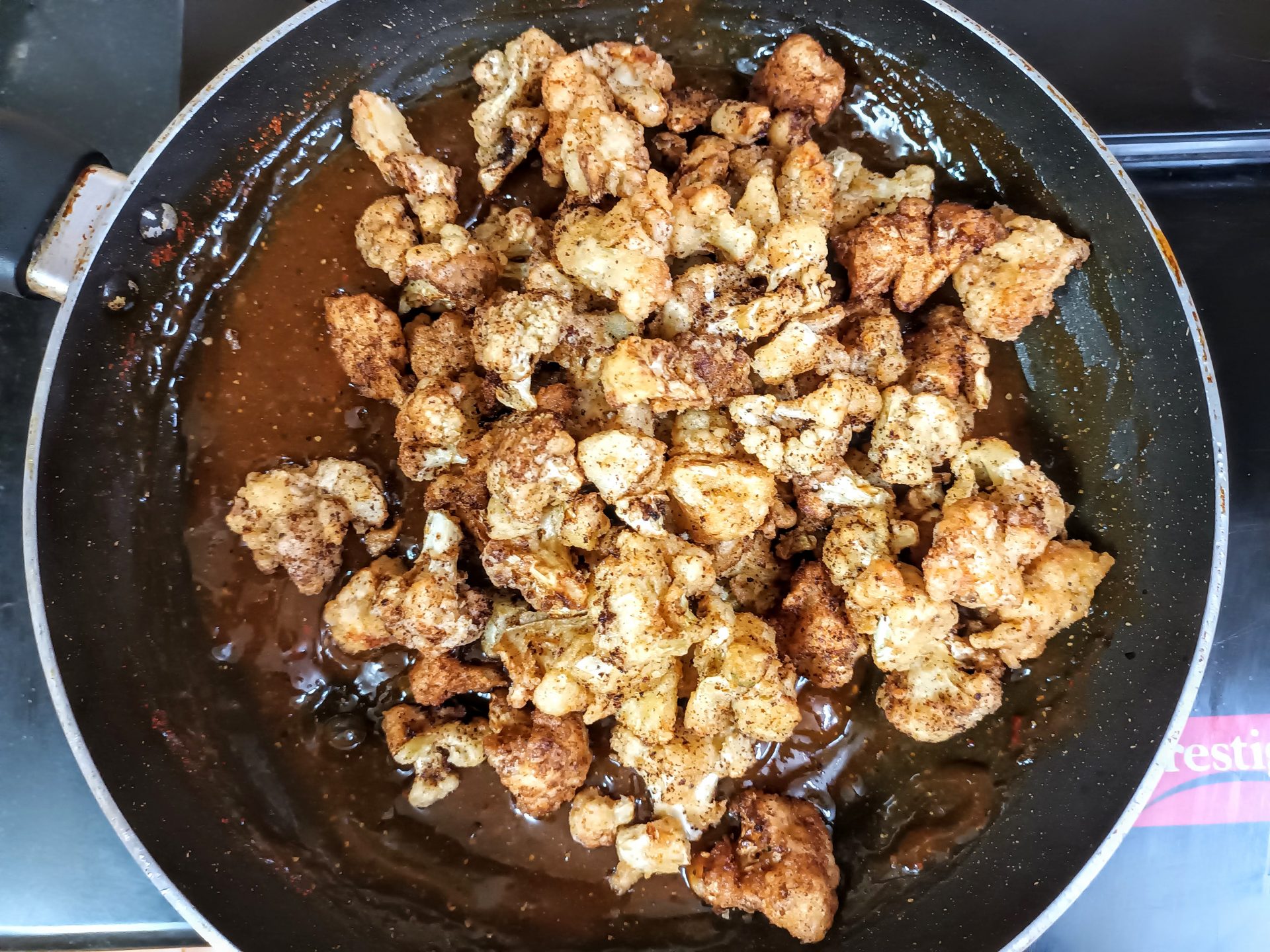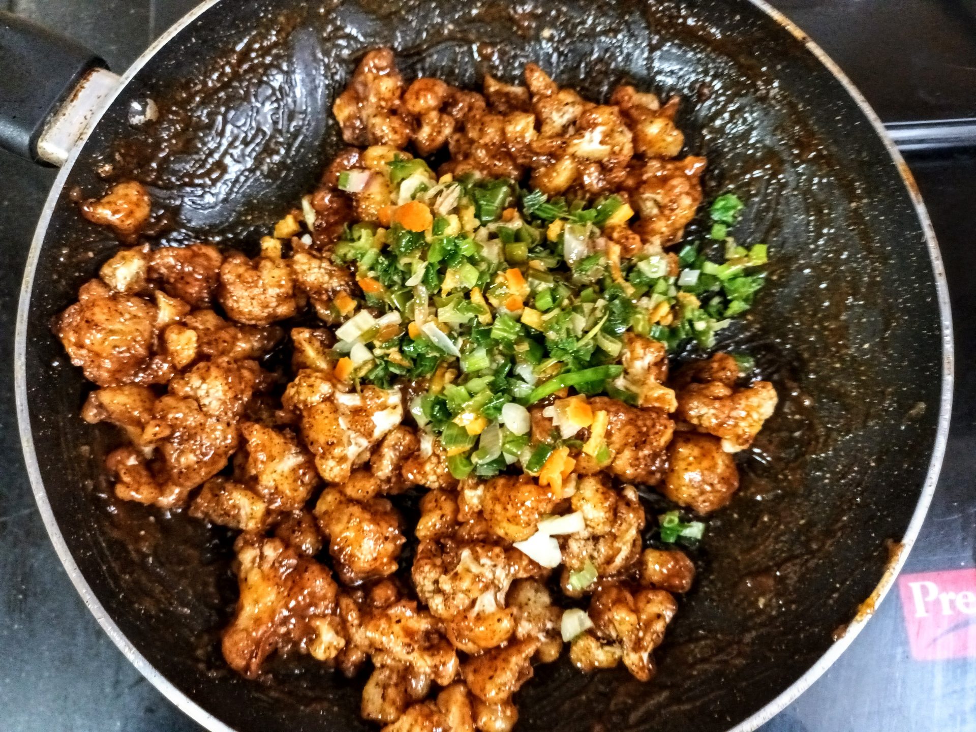 - Drop the fried/baked cauliflower florets into the sauce and mix well, such that the florets are well coated by the sauce. Now add the sauteed onion-garlic-chilli , to the cauliflower, and give it all a goof mix. Garnish with reserved Orange rind,and serve.
