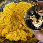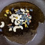 - Now turn off the flame, add the toasted nuts and raisins,followed by another tablespoon or two of ghee/clarified butter. (the first picture of step 4 shows the consistency of the pudding).