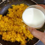 - Now to the remaining ghee/clarified butter in the pan,add the grated pumpkin and saute over a low flame for a minute. Add the milk, and stirring from time to time, cook the pumpkin in the milk. Flame should be medium,and keep stirring.
