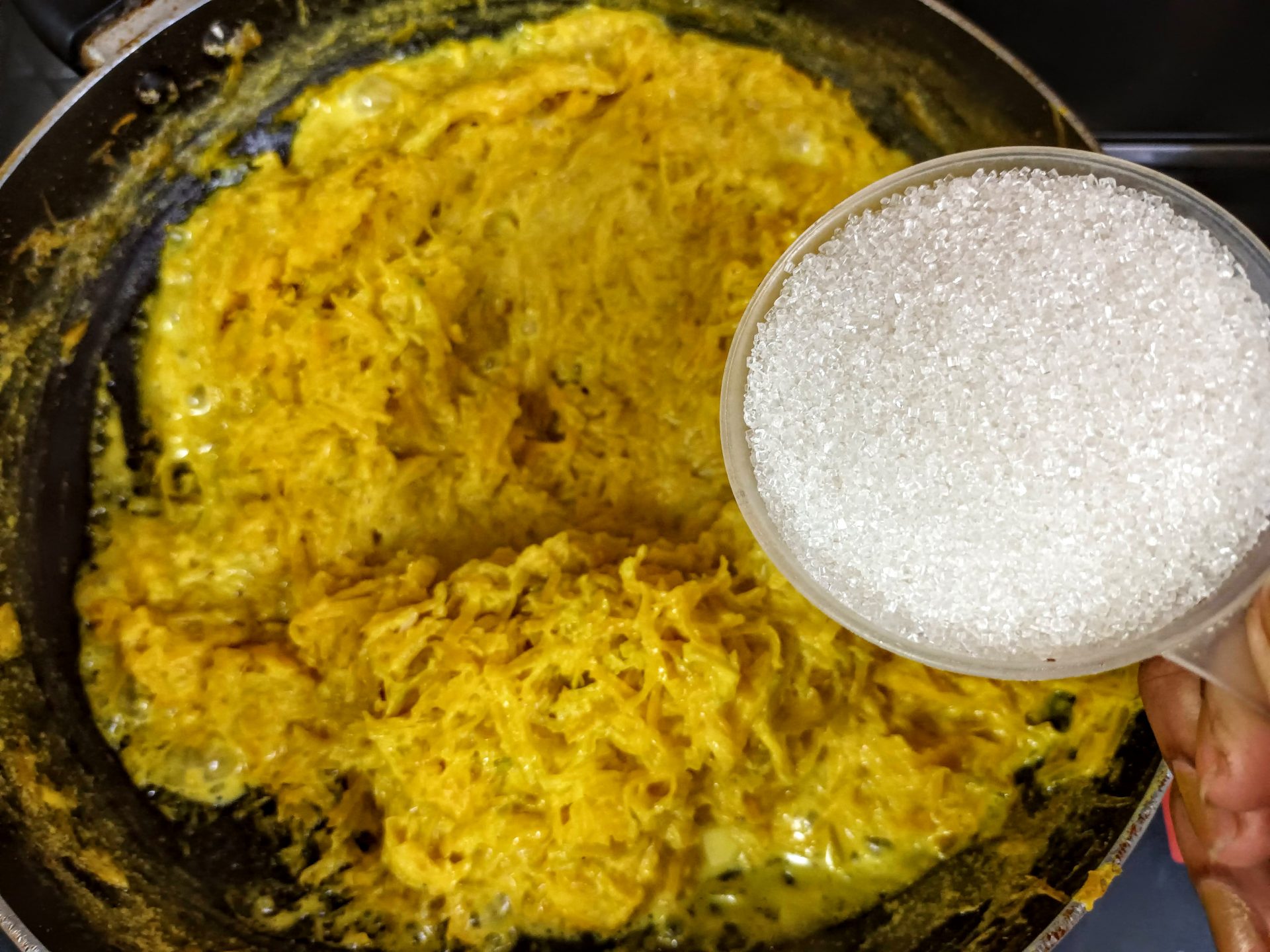 - Cook until almost all the milk evaporates. Now add the sugar. The mixture will turn moist again on adding sugar. Continue to stir, until all the moisture is absorbed. When almost all the moisture is absorbed, add cardamom powder, edible camphor(if using), and continue to stir. You know the pudding is done when it starts leaving the bottom of the pan(see picture).
