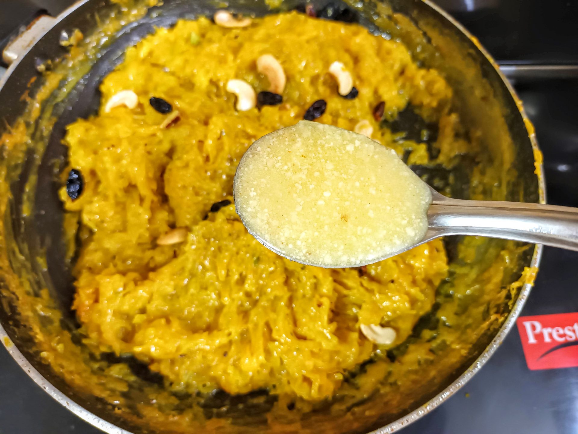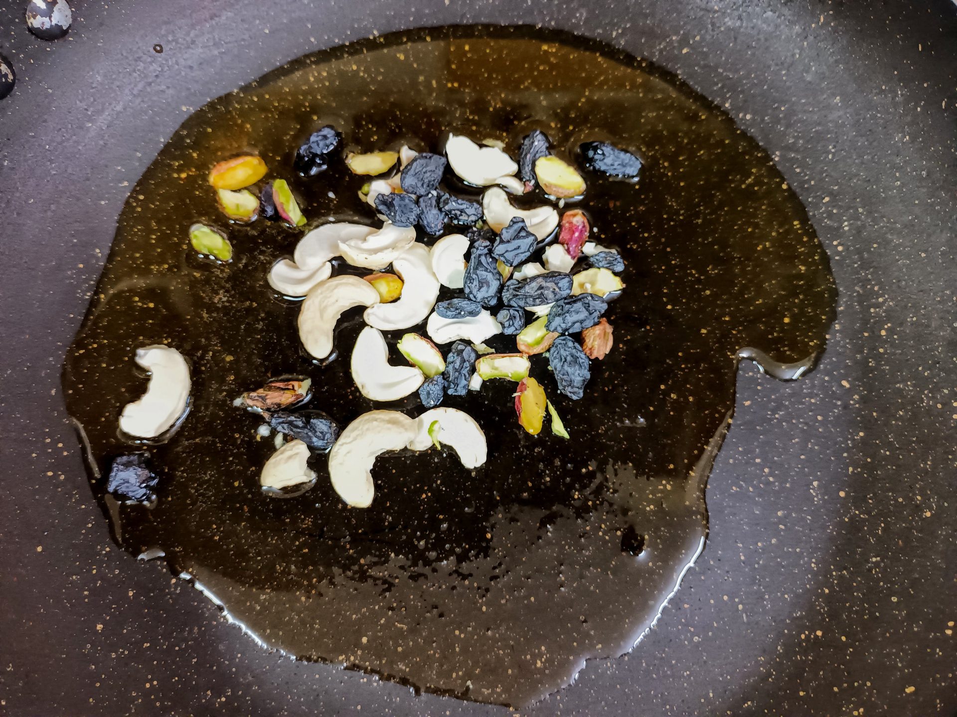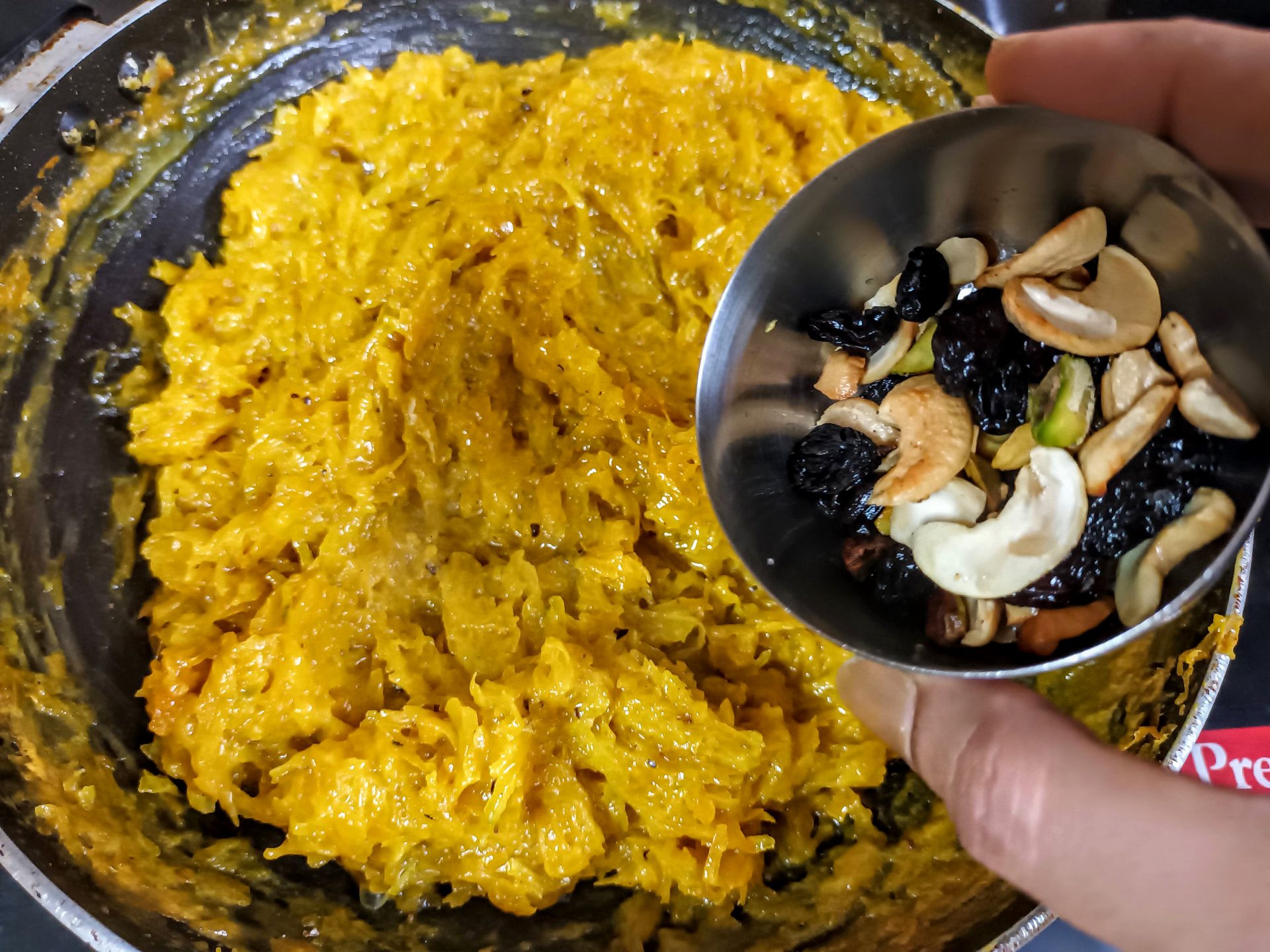 - Now turn off the flame, add the toasted nuts and raisins,followed by another tablespoon or two of ghee/clarified butter. (the first picture of step 4 shows the consistency of the pudding).