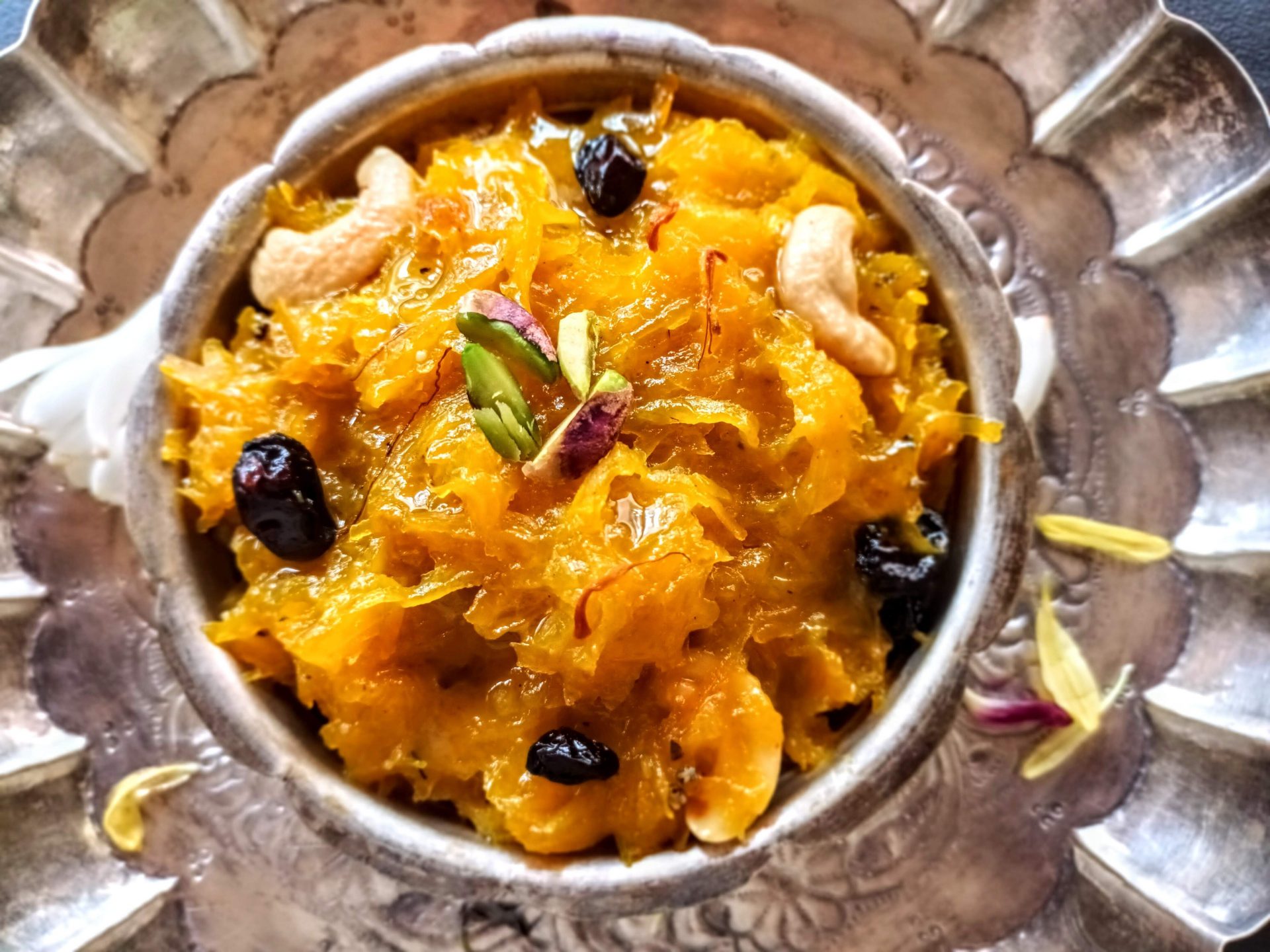 - Grate the Pumpkin and Keep it aside. In a Pan(preferably non stick), Take a tablespoon of ghee/clarified butter, and heat. Add the nuts and raisins and fry them until the raisins fluff up and the nuts turn a light brown. Remove the nuts and raisins on to a plate.